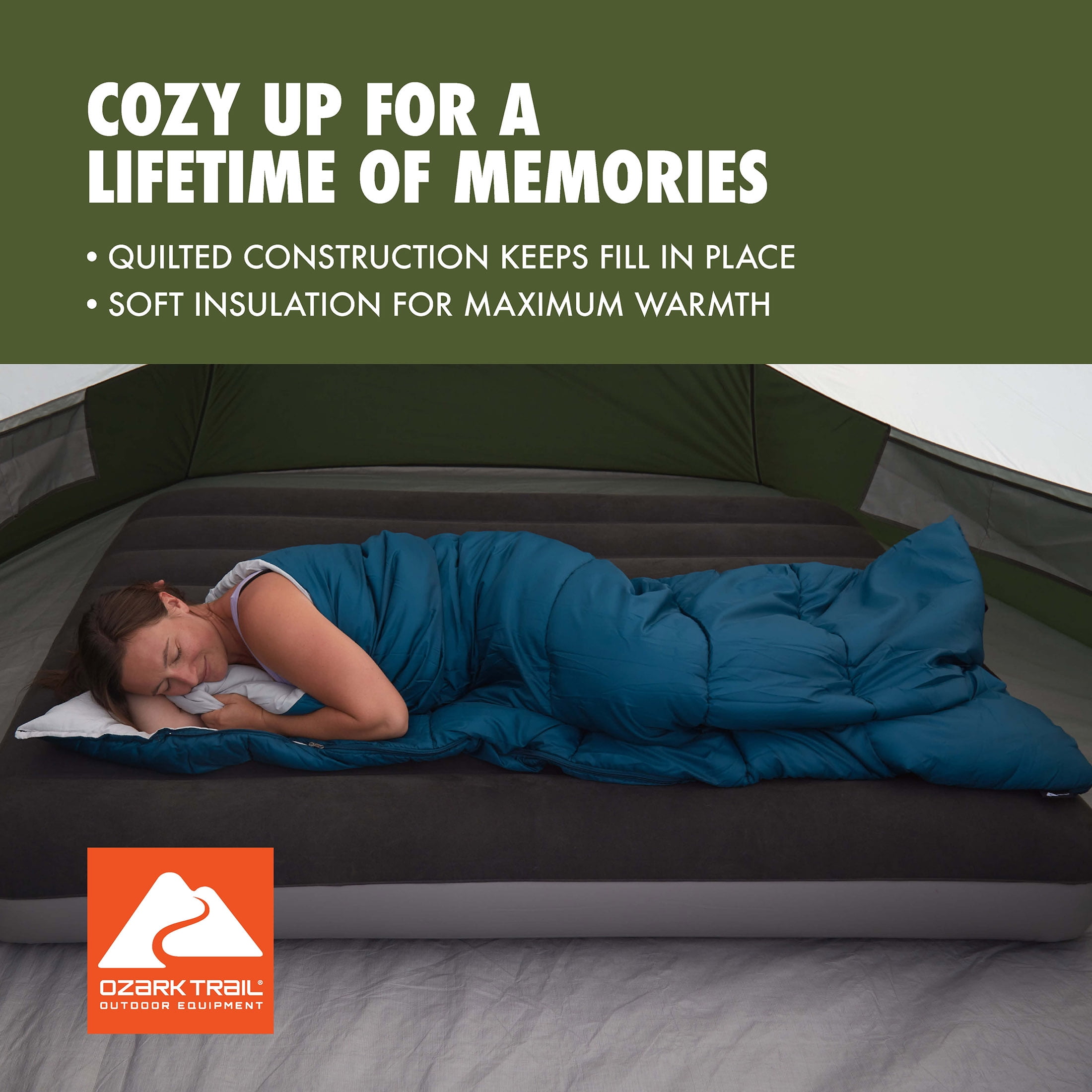 The Ozark Trail 35 Degree Cool Weather Sleeping Bag is perfect for those cool nights under the stars. This sleeping bag is made from partially recycled polyester fabrics including a really great brushed liner that warms up quickly to keep you cozy. The full-length zipper with patent pending ZIP SHIELD zipper pull makes getting in and out of the bag a breeze and allows the bag to open fully for use as a quilt or an extra layer. When you want to pack up in a hurry use the quick-roll elastic straps to bundle and go. This sleeping bag includes a stuff sack for carrying and helps to minimize storage space in your car and at home. Things can get messy when you’re in the great outdoors, but don’t fret, this sleeping bag is machine washable so it’s easy to ensure your bag is ready for the next adventure. Whether you’re taking the family on an extended camping trip in the mountains or just taking a day trip to a local hiking trail, Ozark Trail has everything you need to enjoy the great outdoors. Browse all our gear like spacious tents, durable backpacks, warm sleeping bags, outdoor cooking supplies, and more.