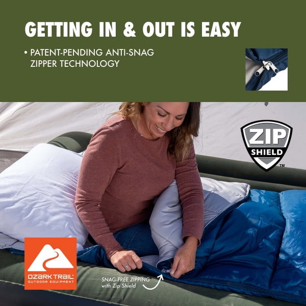 Full-length zipper with patent pending ZIP SHIELD zipper pull makes it easy to enter and exit the sleeping bag.