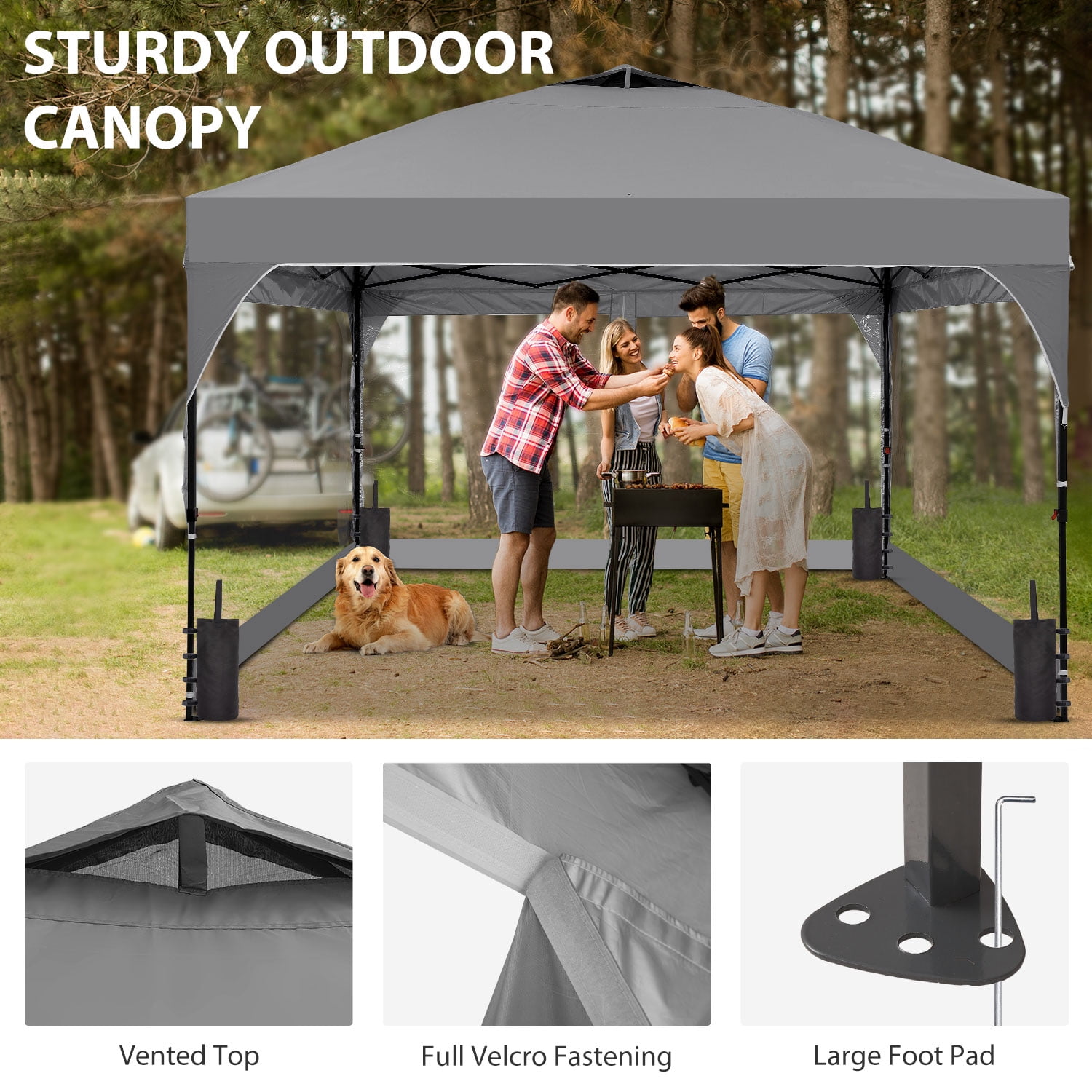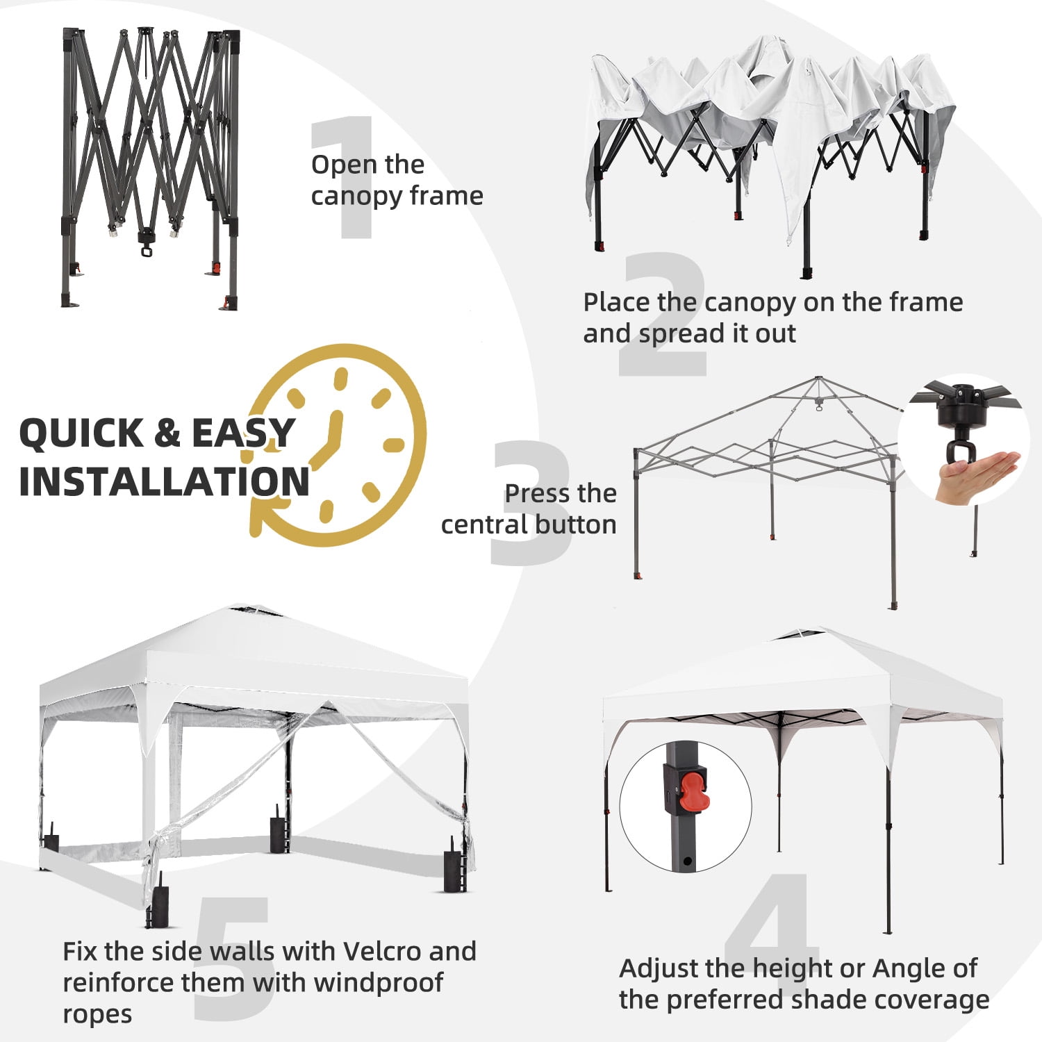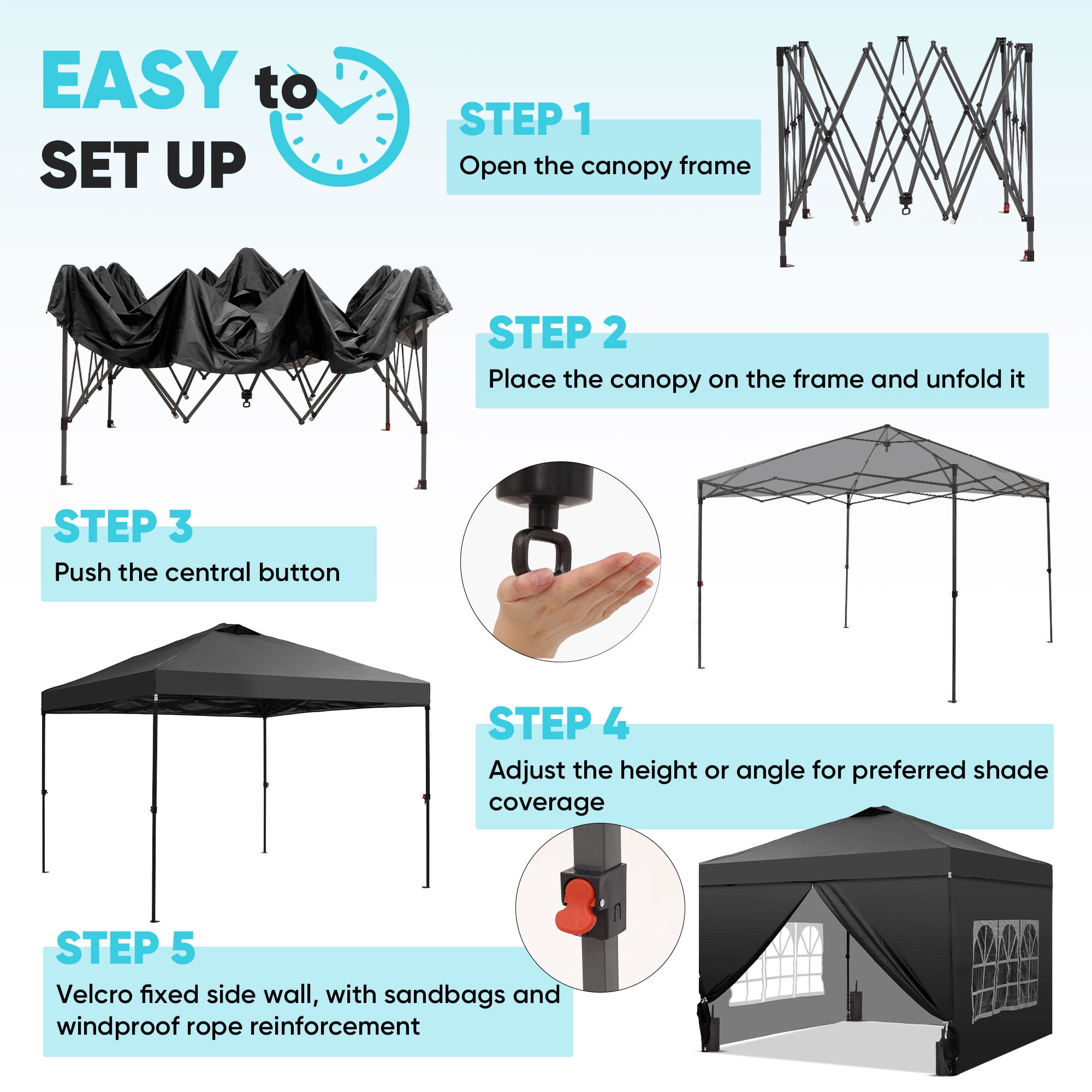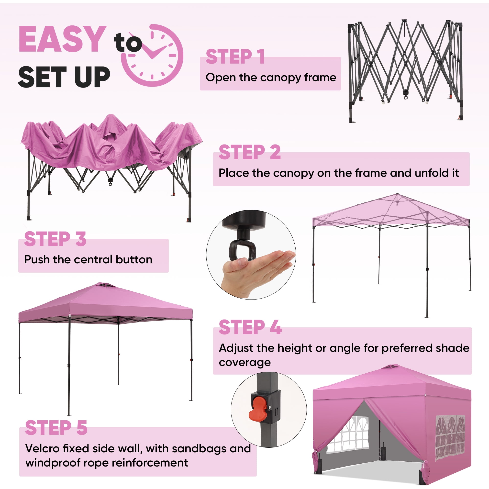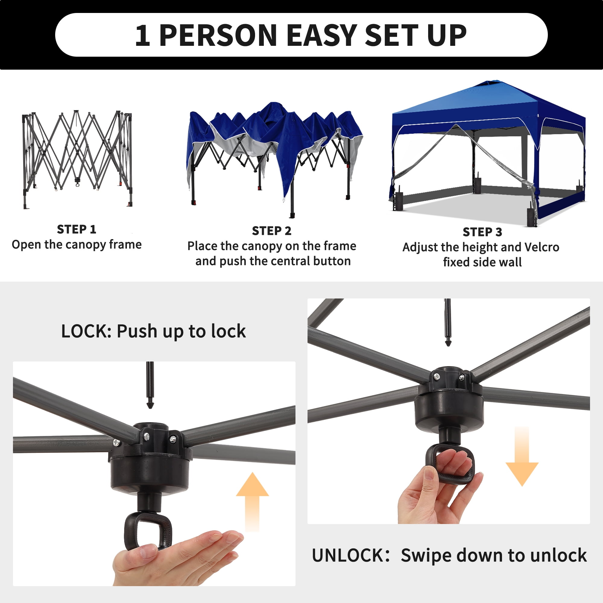 - Instant Setup: Canopy tent pops up quickly without tools, making it easy to set up and take down.