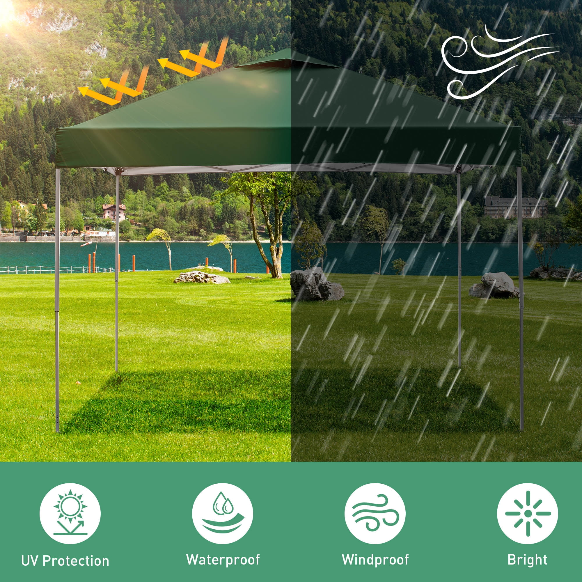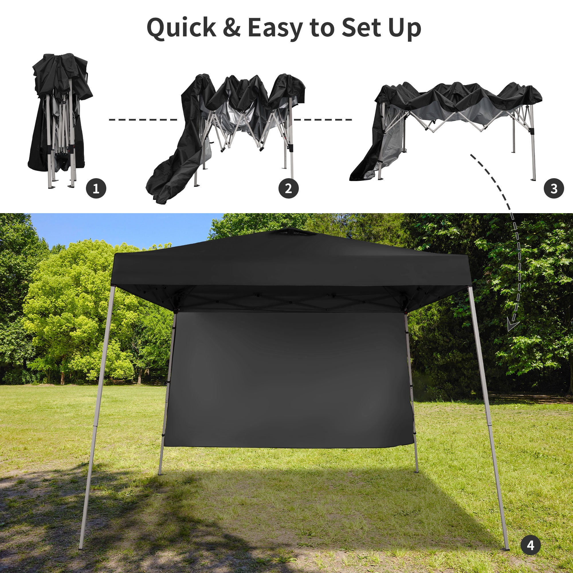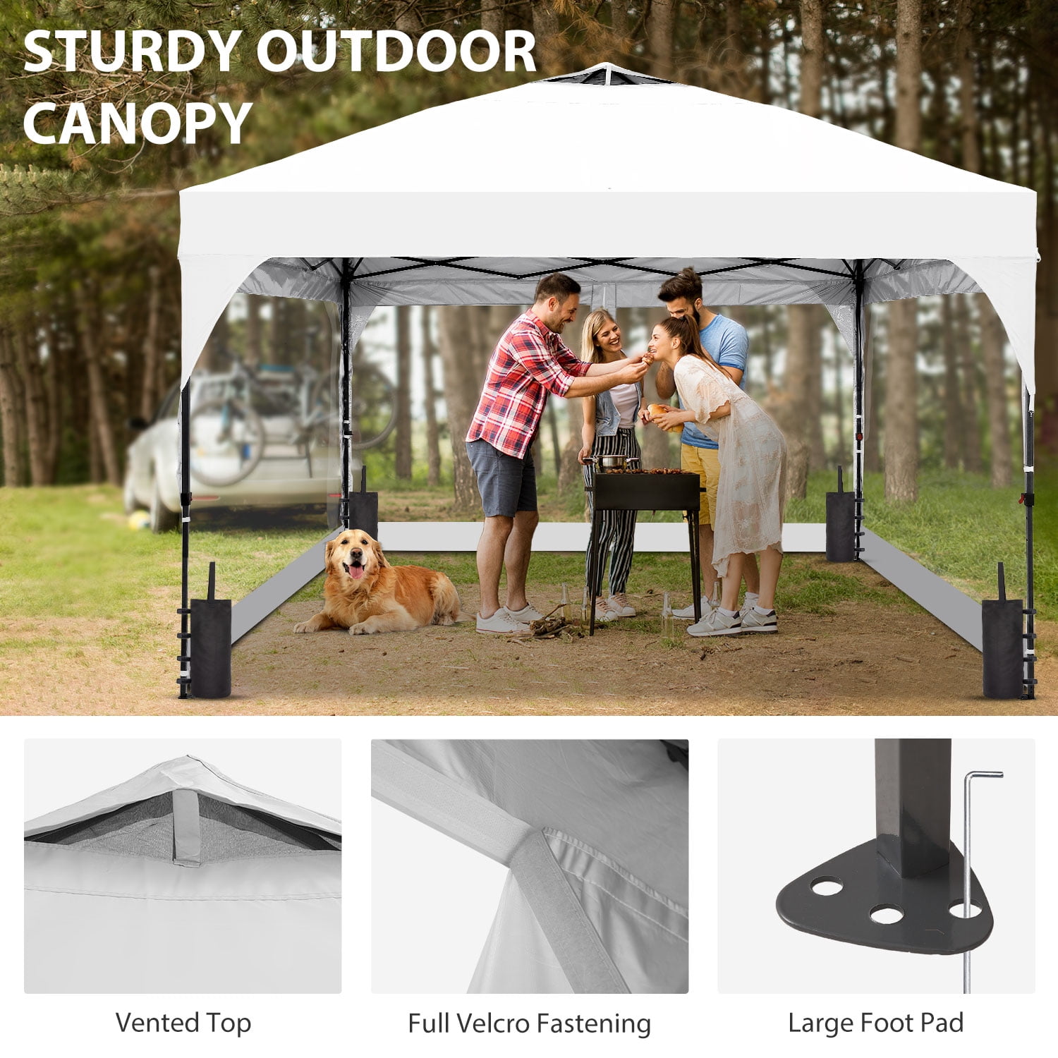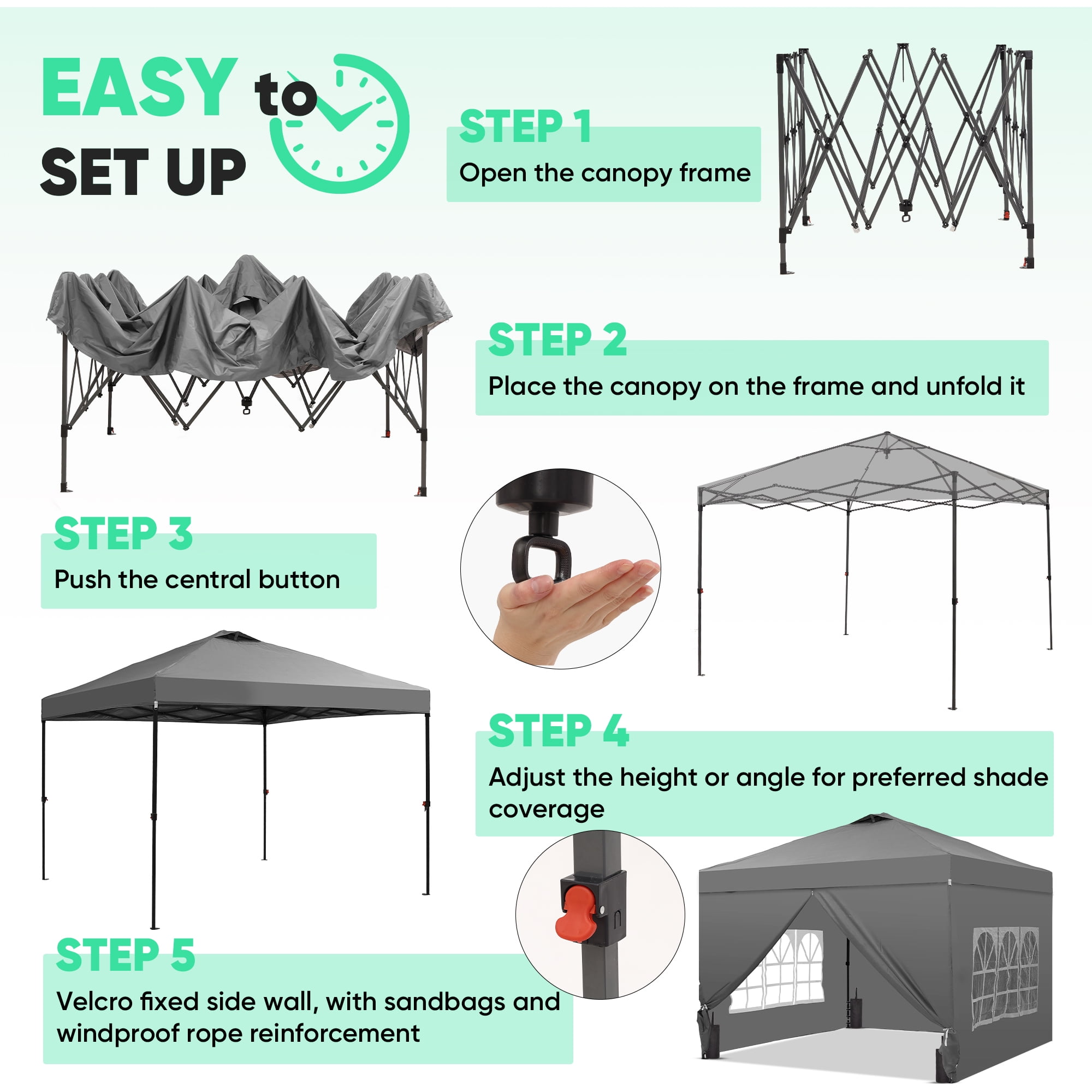 - Instant Setup: Canopy tent pops up quickly without tools, making it easy to set up and take down.