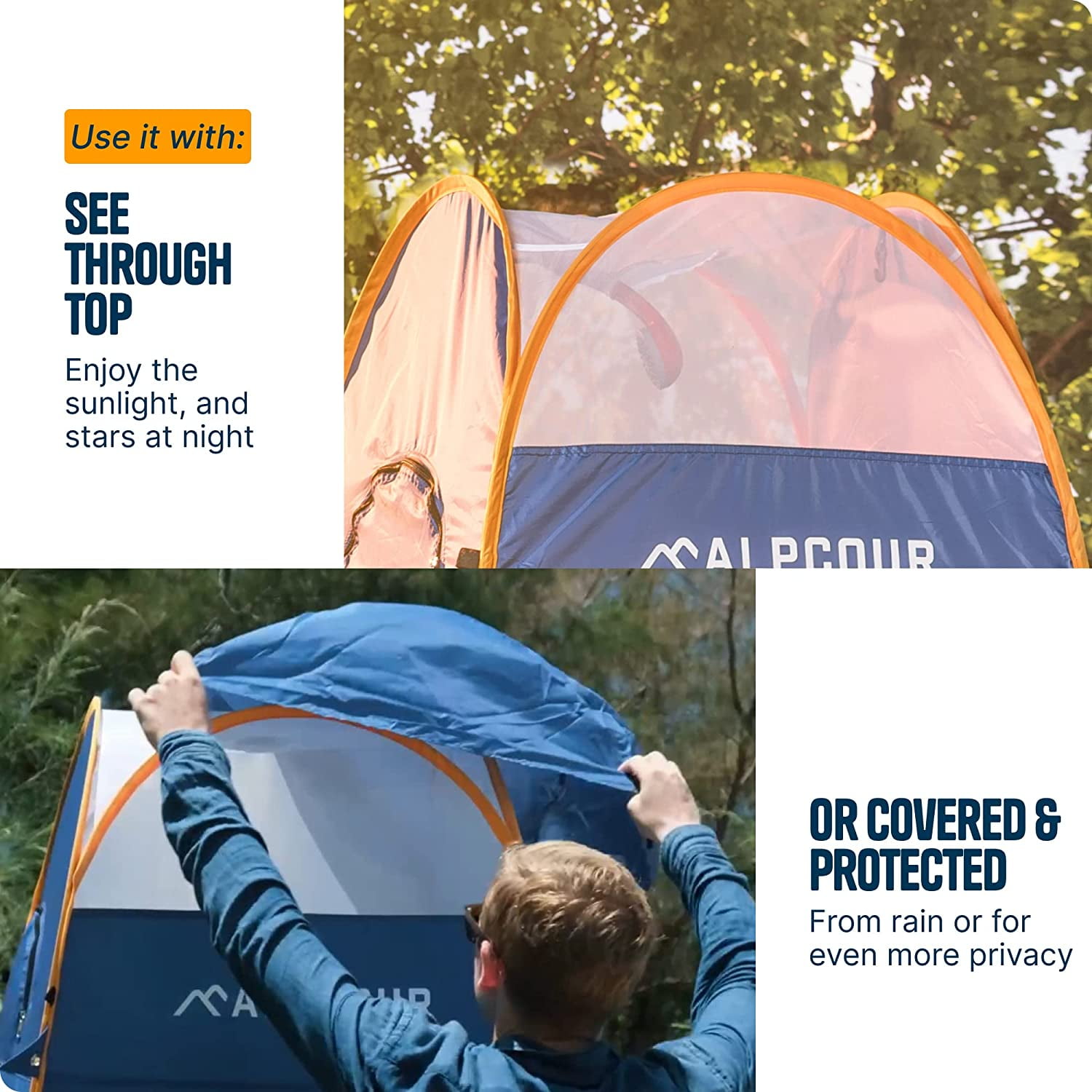 - Easy Setup: Includes ropes, sandbags, and stakes for stable installation, and a dedicated hole for shower attachment. The tent can be easily folded and stored in its carry bag.