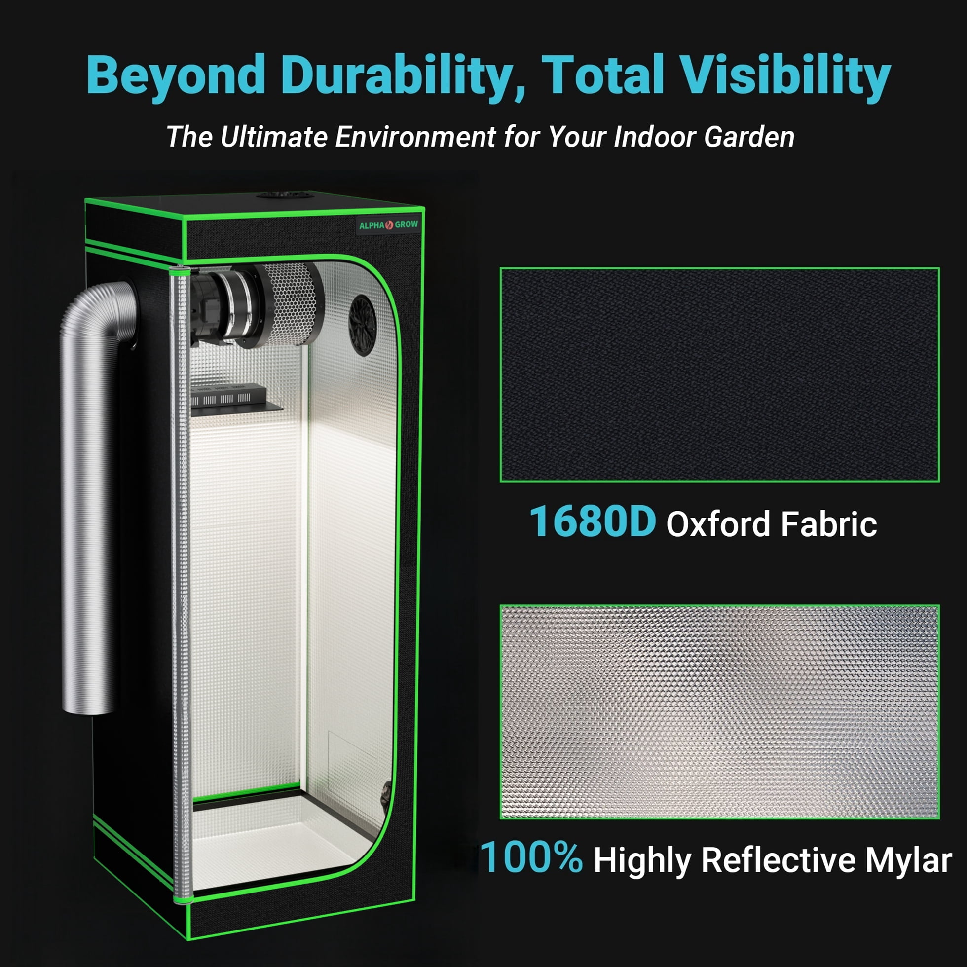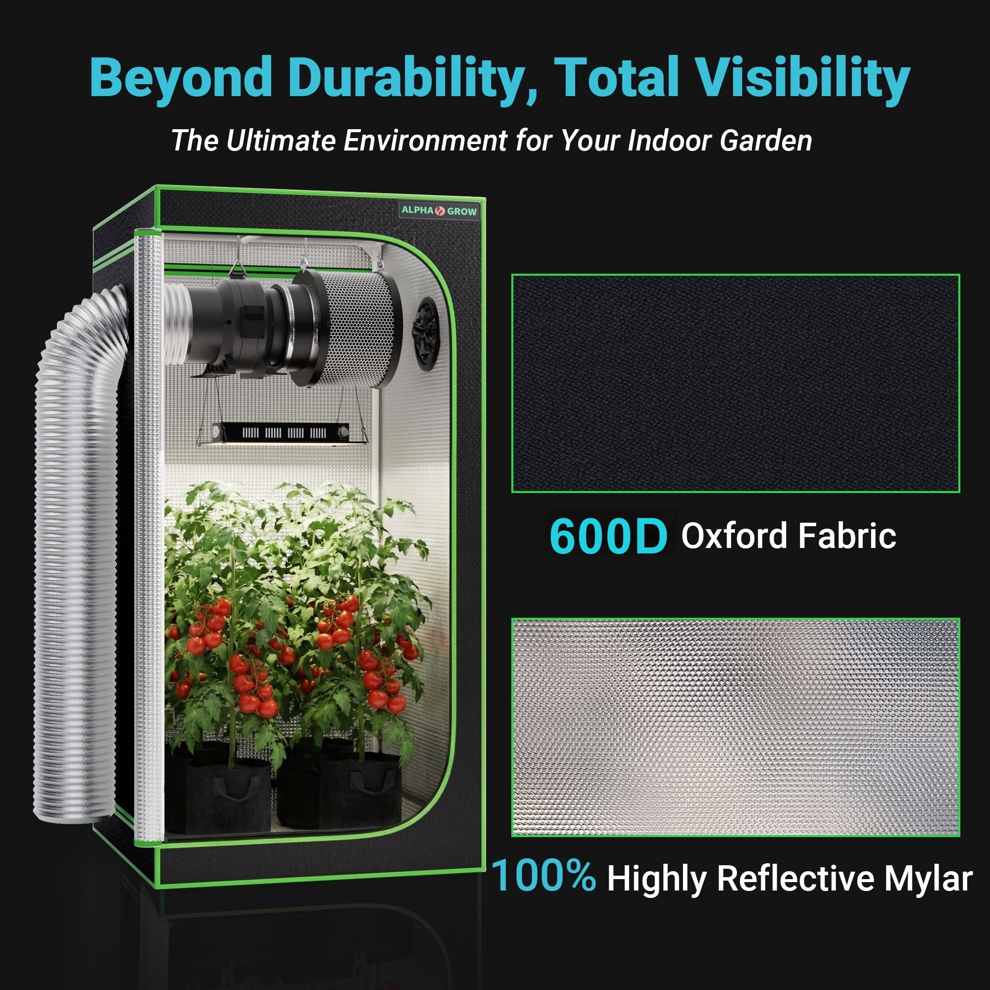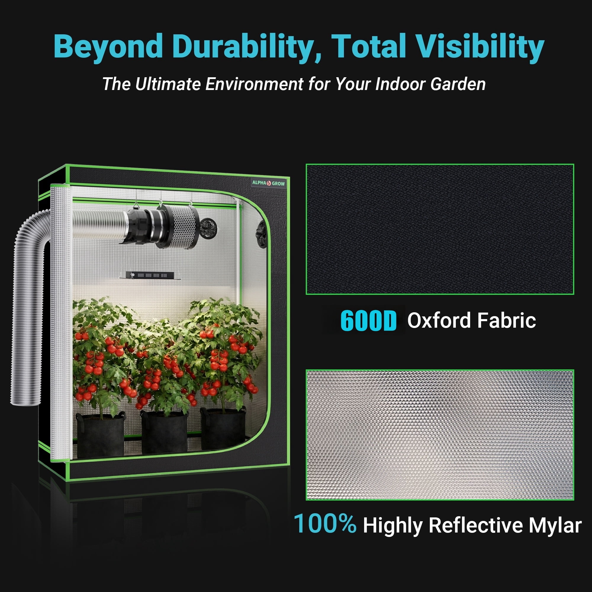 Premium 600D High-Reflectivity Material: Crafted from heavy-duty 600D Oxford cloth, this 2×2 grow tent is tear-proof and double-stitched for superior durability. The interior is lined with highly reflective diamond Mylar to retain all light and maximize the efficiency of your grow light setup.