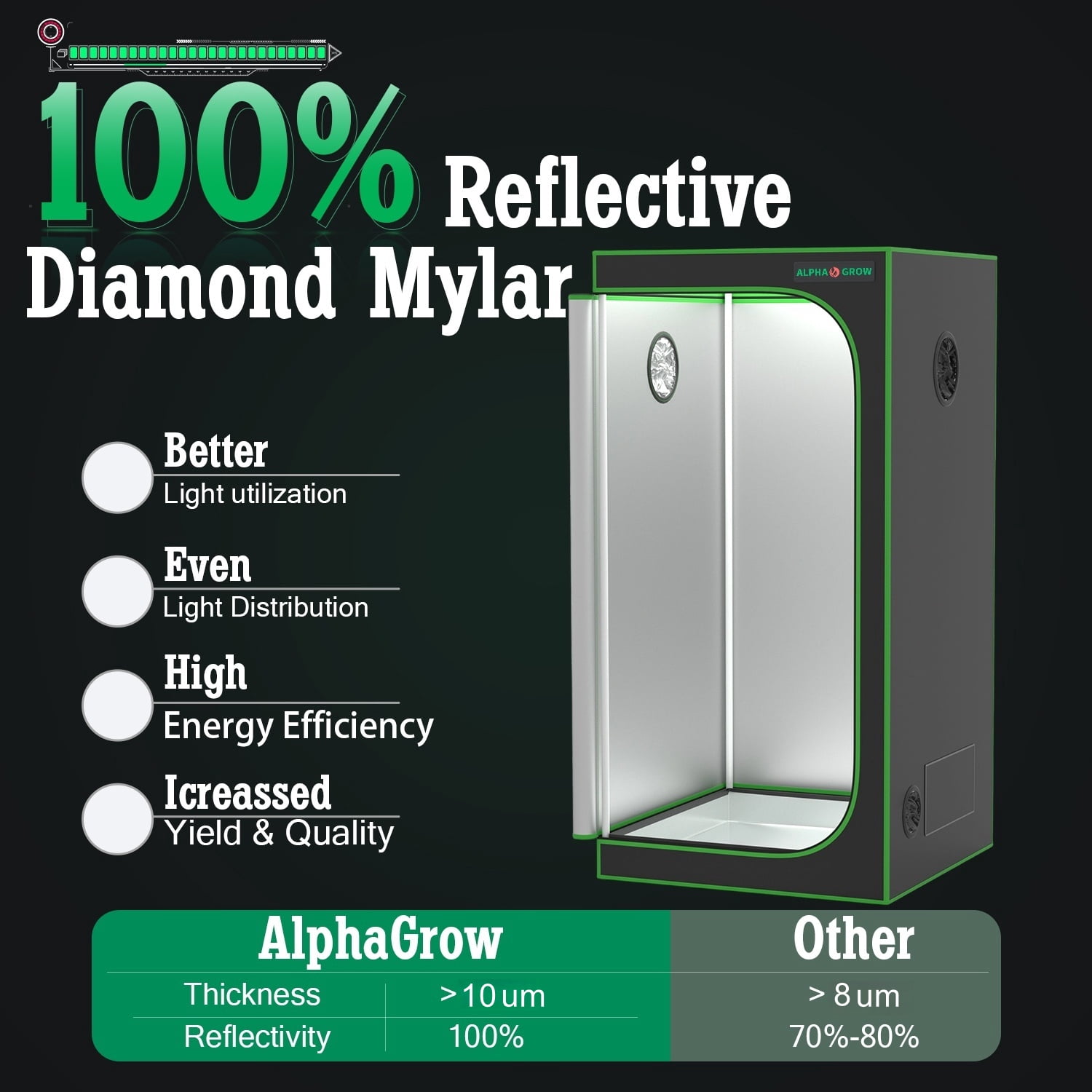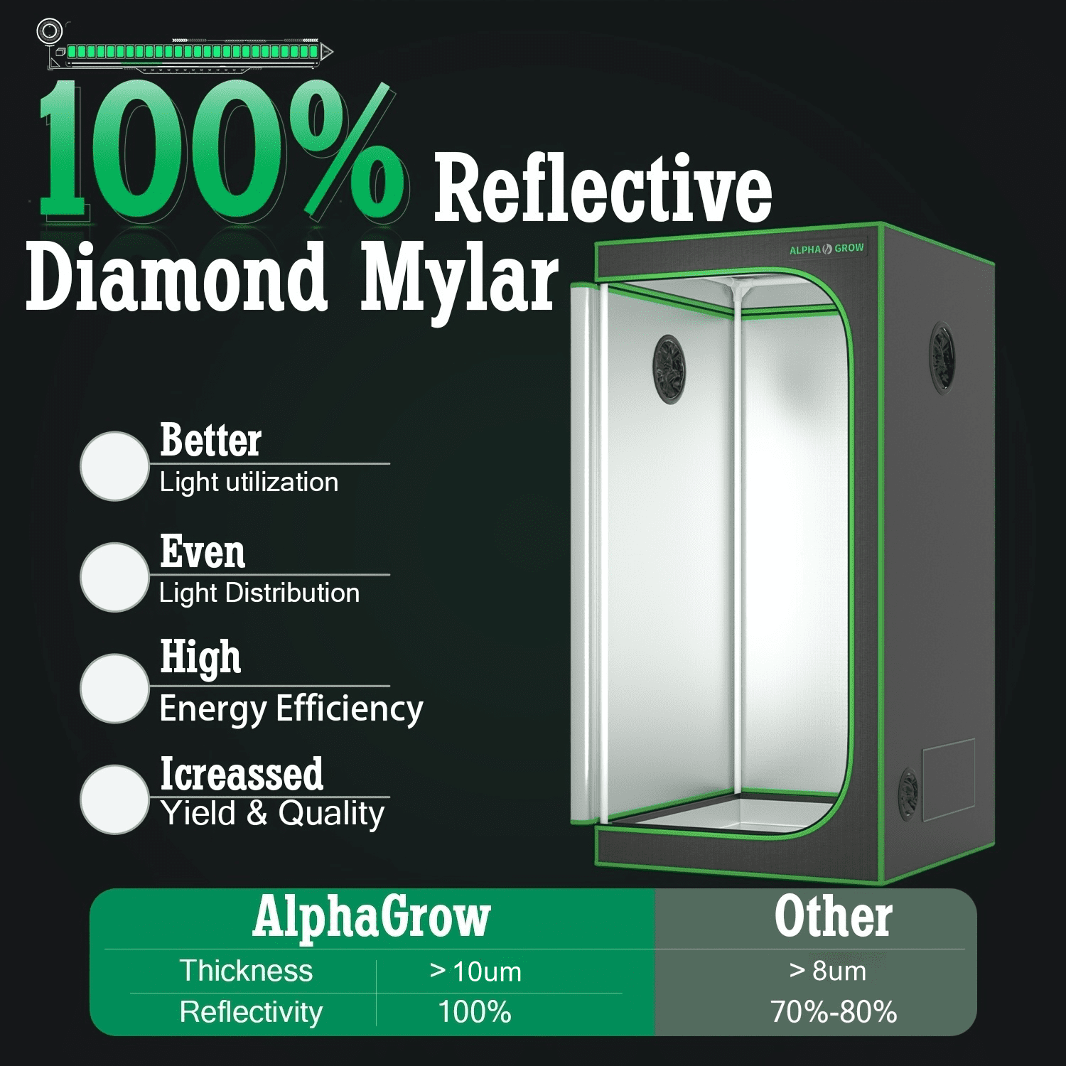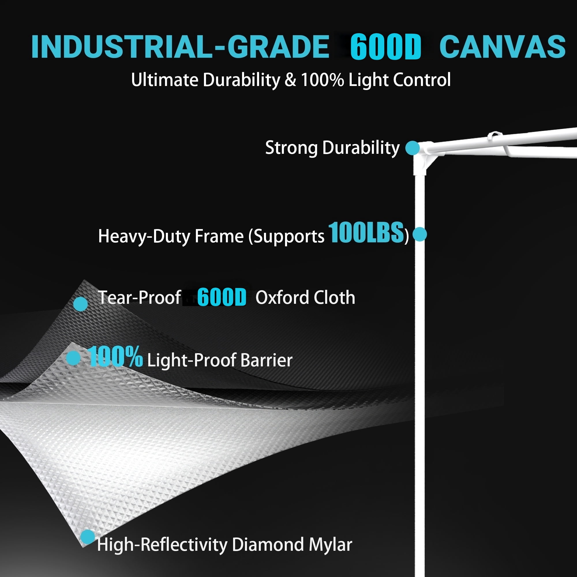 Premium 600D High-Reflectivity Material: Crafted from heavy-duty 600D Oxford cloth, this 2×2 grow tent is tear-proof and double-stitched for superior durability. The interior is lined with highly reflective diamond Mylar to retain all light and maximize the efficiency of your grow light setup.