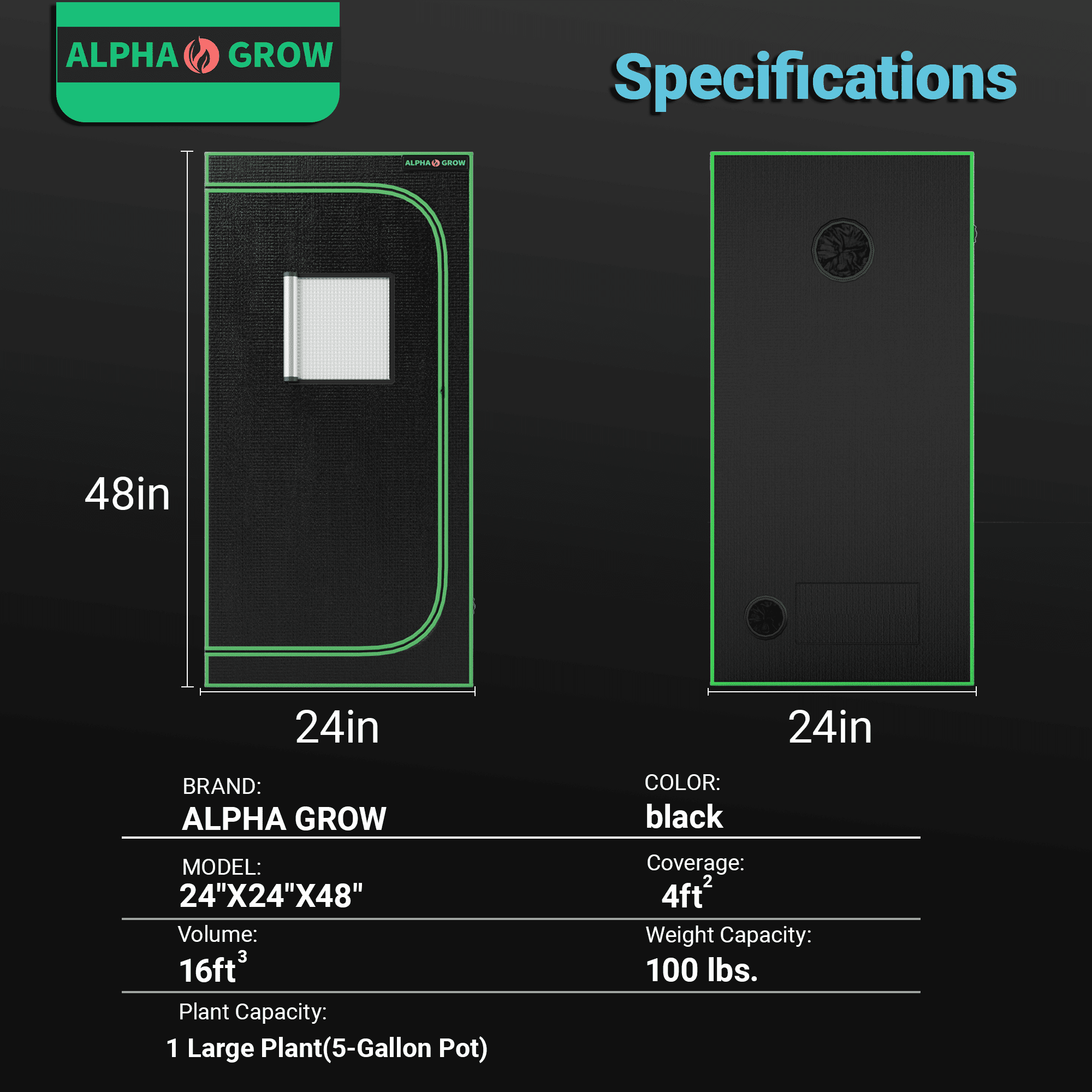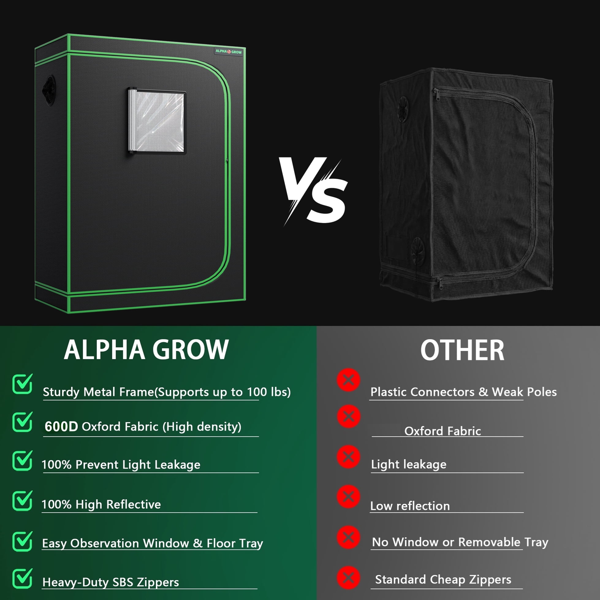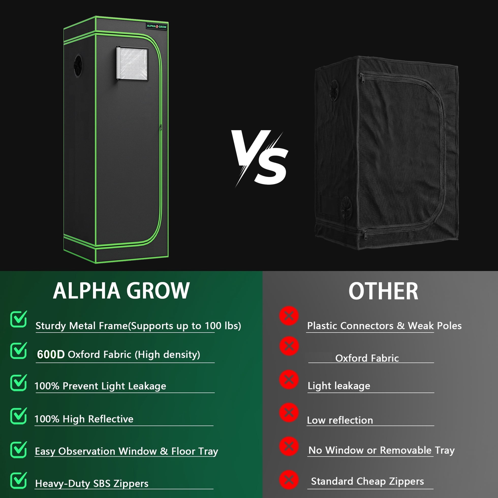 Elevate your indoor gardening game with the ALPHAGROW 24″x24″x48″ Grow Tent. Designed for both professional hydroponic growers and hobbyists, this premium 2×2 ft grow tent provides the perfect controlled environment for your plants to thrive year-round. Professional Grade Material: The tent exterior is crafted from heavy-duty 600D Oxford cloth, which is tear-resistant and completely light-proof. The interior is lined with highly reflective diamond Mylar, directing 100% of the light back to your plants to maximize photosynthesis and yield. Superior Light Proofing: We use heavy-duty zippers and double-stitched seams to create a completely sealed environment, preventing light leakage that can disturb plant cycles. User-Friendly Design: The integrated observation window allows you to check on your harvest effortlessly. The sturdy metal frame structure ensures stability and can support all your necessary equipment, including grow lights and ventilation systems. Plus, the removable floor tray makes cleaning up soil and water spills a breeze. Whether you are growing vegetables, herbs, or flowers, the ALPHAGROW grow tent offers the reliability and performance you need for a successful harvest.