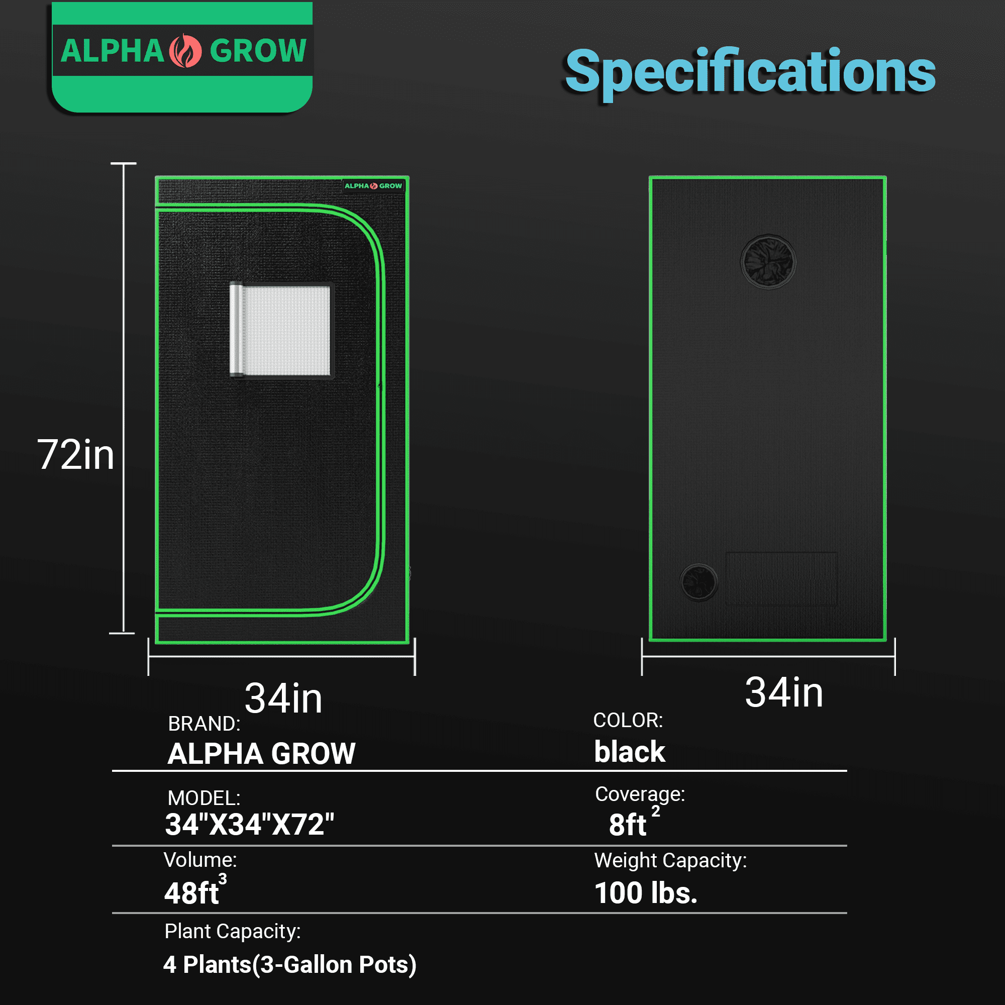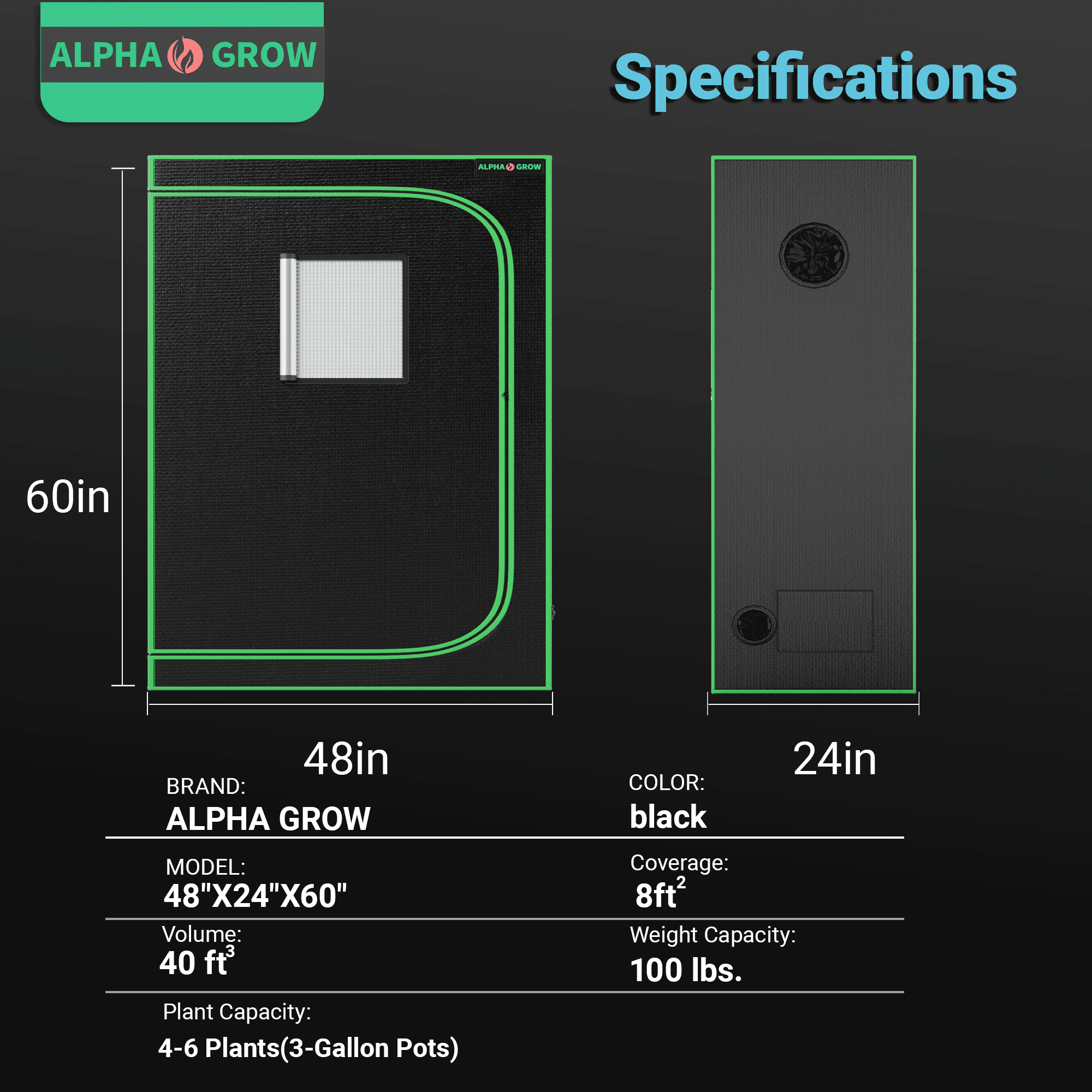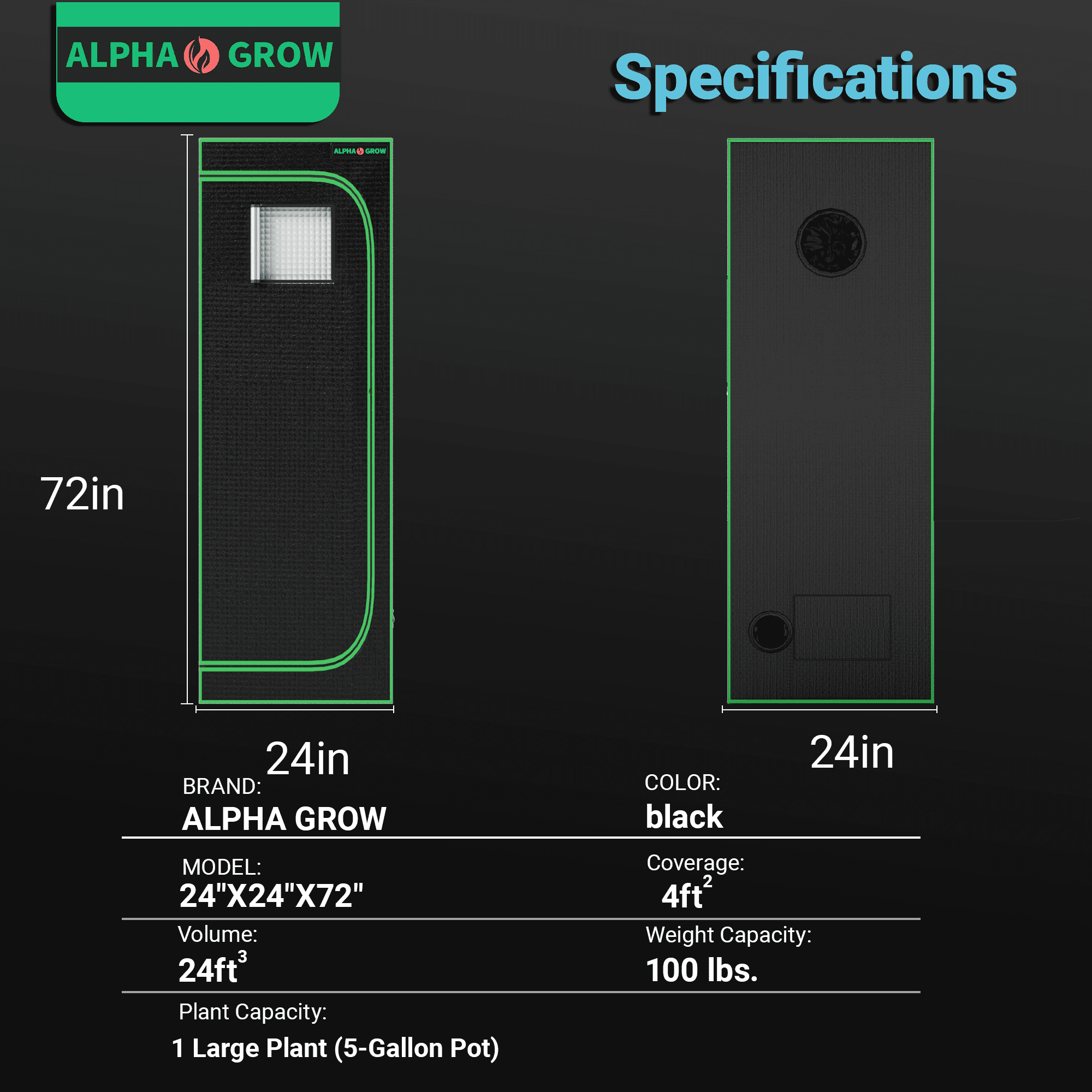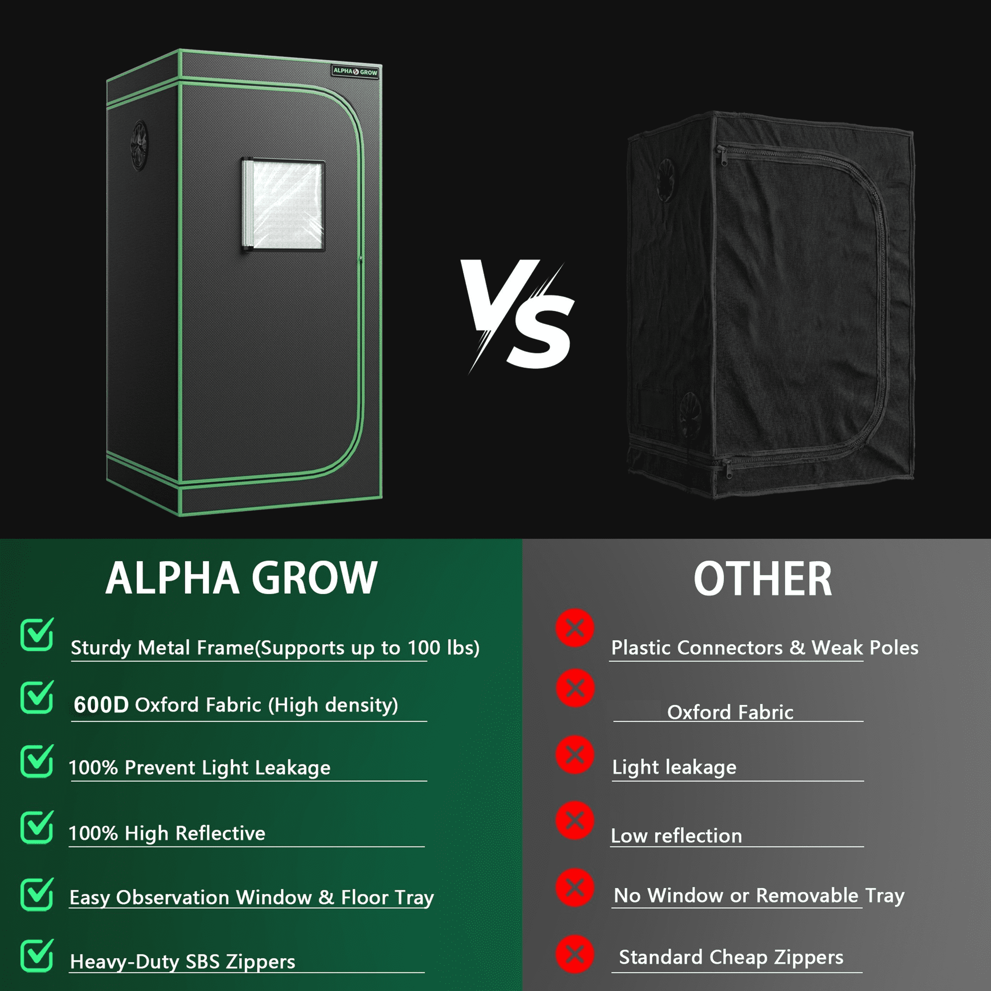 Elevate your indoor gardening game with the ALPHAGROW 24″x24″x48″ Grow Tent. Designed for both professional hydroponic growers and hobbyists, this premium 2×2 ft grow tent provides the perfect controlled environment for your plants to thrive year-round. Professional Grade Material: The tent exterior is crafted from heavy-duty 600D Oxford cloth, which is tear-resistant and completely light-proof. The interior is lined with highly reflective diamond Mylar, directing 100% of the light back to your plants to maximize photosynthesis and yield. Superior Light Proofing: We use heavy-duty zippers and double-stitched seams to create a completely sealed environment, preventing light leakage that can disturb plant cycles. User-Friendly Design: The integrated observation window allows you to check on your harvest effortlessly. The sturdy metal frame structure ensures stability and can support all your necessary equipment, including grow lights and ventilation systems. Plus, the removable floor tray makes cleaning up soil and water spills a breeze. Whether you are growing vegetables, herbs, or flowers, the ALPHAGROW grow tent offers the reliability and performance you need for a successful harvest.