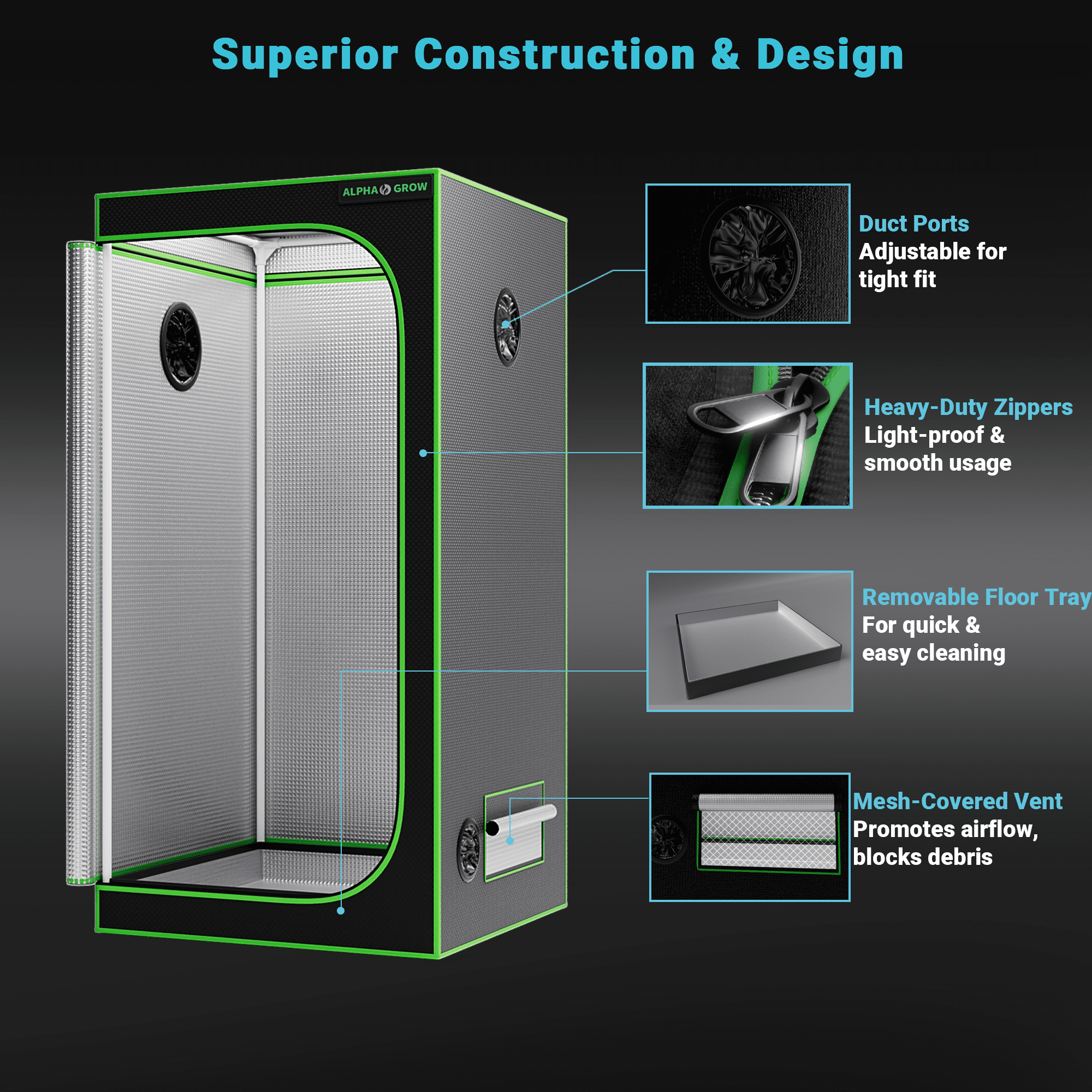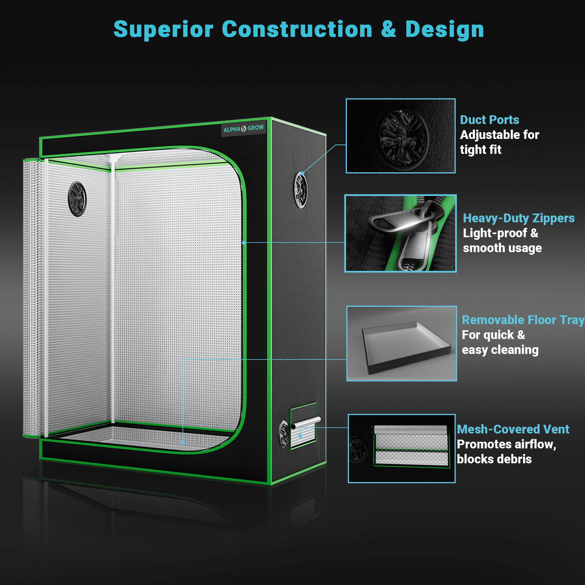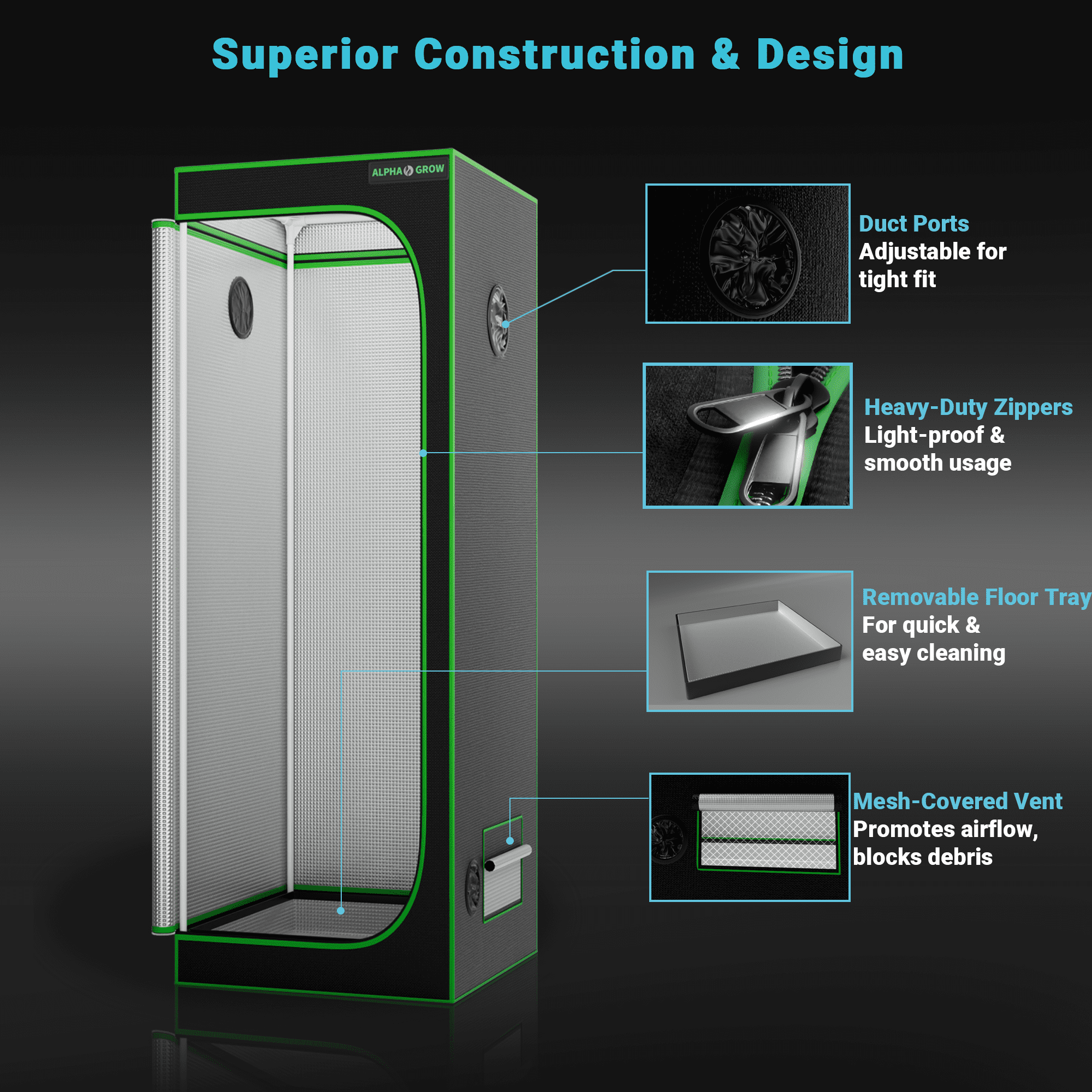 Sturdy Metal Structure & Easy Assembly: Supported by strong metal poles and corner connectors, the ALPHAGROW tent ensures stability and safety for your hanging equipment. The tool-free installation design allows you to set up the sturdy frame in minutes, making it perfect for both beginners and professional growers.