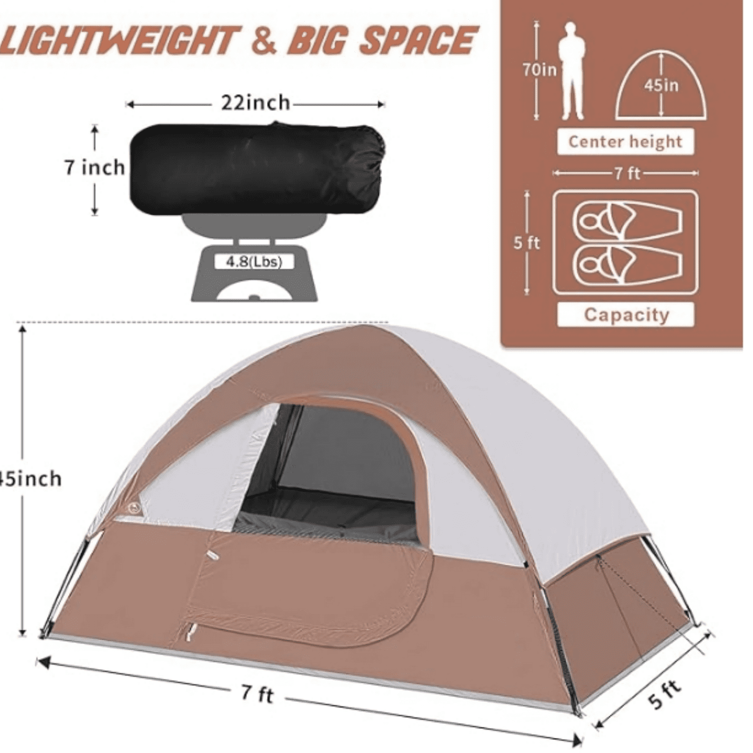 - Lightweight & Big Space: 7’L x 5′ x 45″H. Spacious room for 2 adults.Standard size fits 1 full air mattress.And this 2 Person tent weighs just 4.8lb,it’s very easy to carry.This tent perfect for outdoor camping, hiking,climbing,a kid’s indoor or backyard play tent, fishing, or shelter at the beach in all weather.