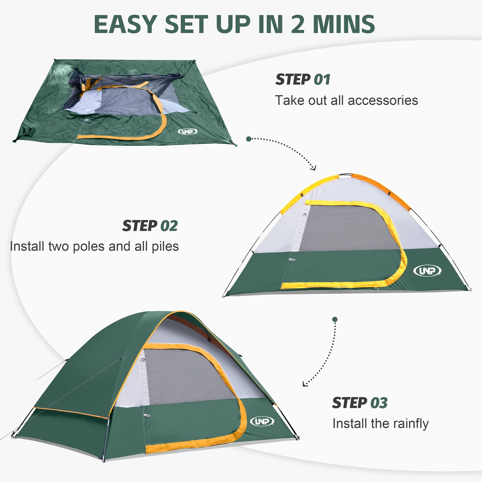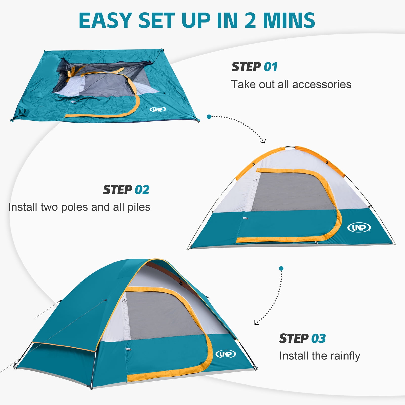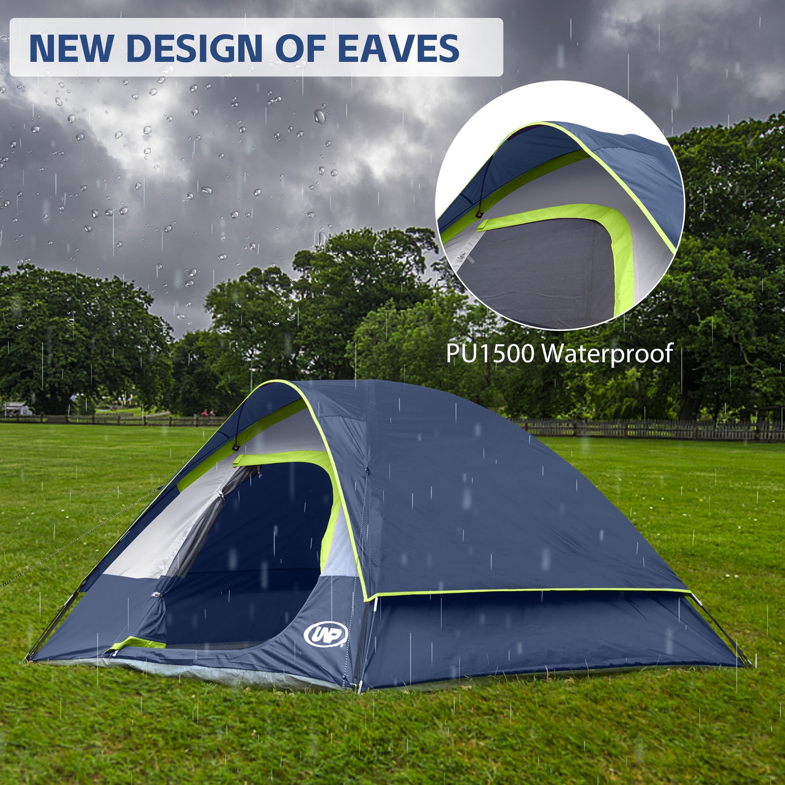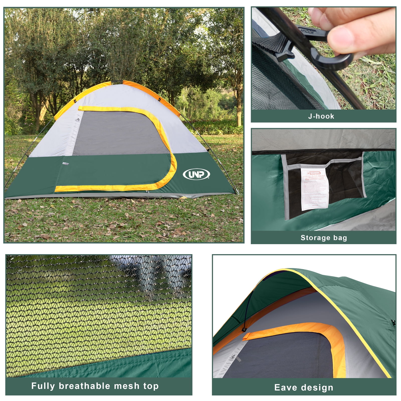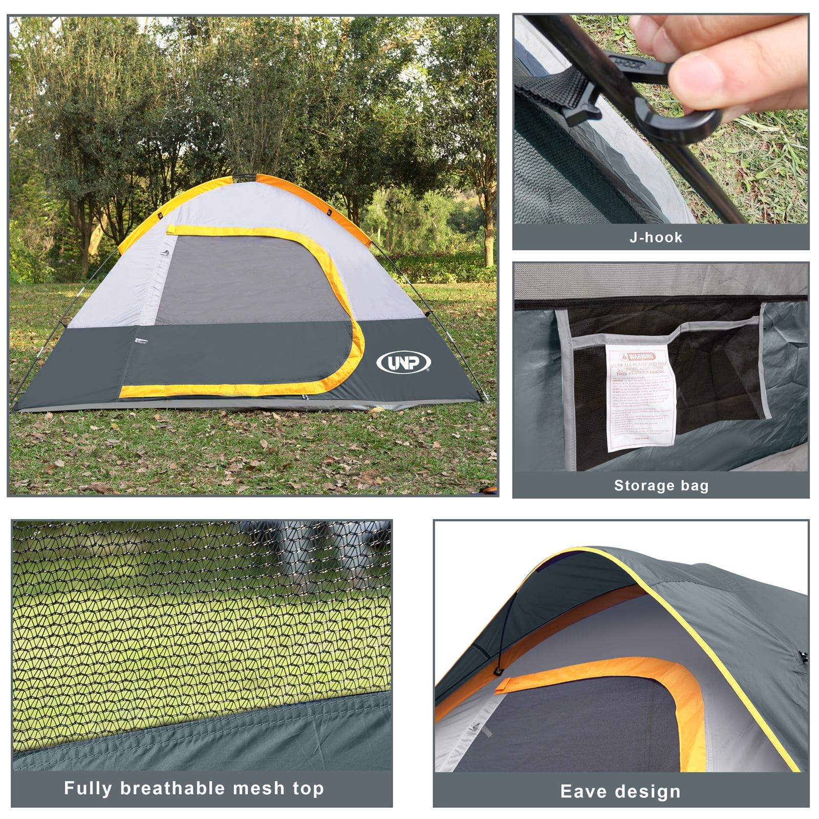- Windproof & Rainproof : The camping tent is made of stronger tear-resistant polyester. It comes with a removable rainfly, the special eave and zippers designed for keeping the rain outside the tent. The ropes of tent and piles ensure safety and stability