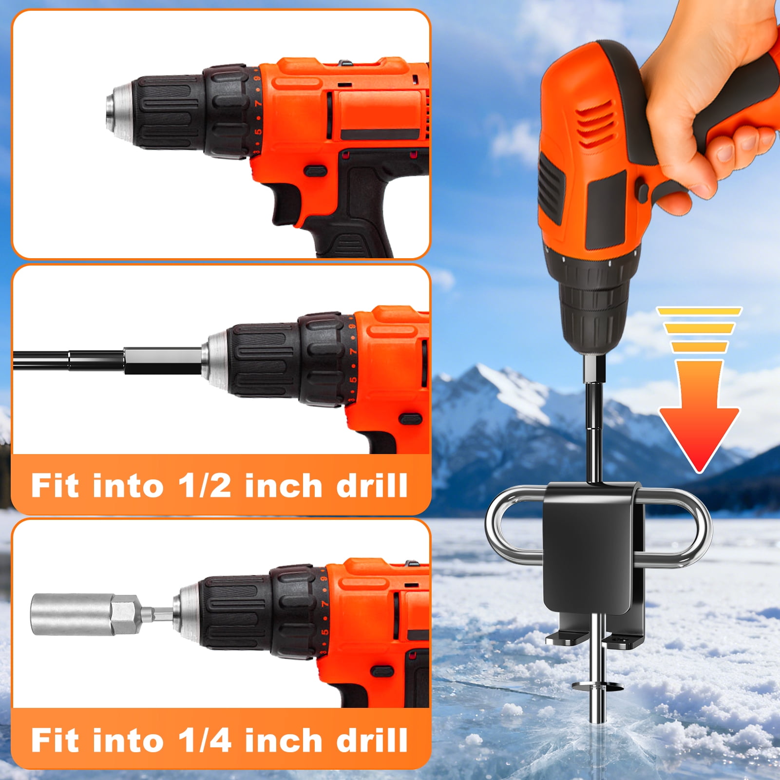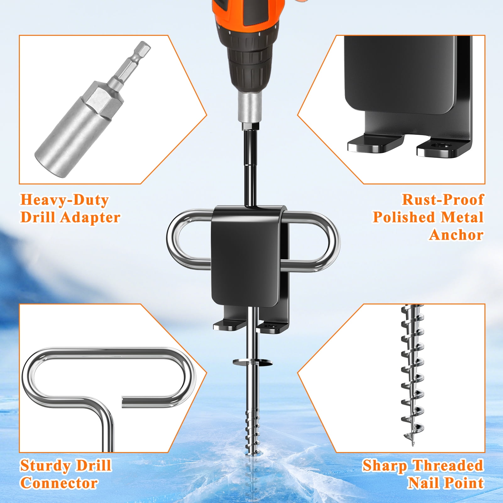 - [COMPLETE KIT INCLUDED] This universal ice anchor for fishing kit comes with 4 ice anchors equipped with protective rubber caps, a drill adapter, a drill converter, and a sturdy storage bag. Everything is organized in one convenient set, making it easy to carry and ready for ice fishing, camping, or any outdoor shelter setup. The complete kit ensures you have all the essential tools on hand for quick, secure, and efficient installation in icy or frozen conditions.
