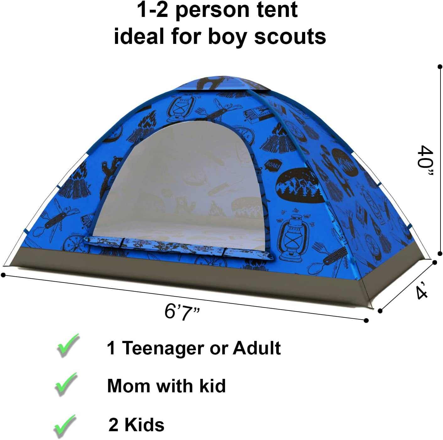 Adventure Theme Camping Tent: The blue Adventure Kids Tent belongs to our Kidz Adventure family, a product line specifically designed to bring more fun to our little ones. The kid’s tent features lovely characters of little forest bear, campfire, compass and camping lantern, etc. The kids are best at their imaginations. Whether indoor or outdoor, they are going to love playing with these cute friends! The tent can be used as a real outdoor tent for camping or an indoor kids’ play tent. It measures 6’7″ x 4′ x 40″ which is suitable for 1-2 people (1 teenager/adult, or 2 kids, or mom/daddy with kid). When folded, this ultra-compact backpacking tent measures only 16″ long, which is extremely portable. Moreover, it has basic rain protection features (but not for heavy rain) including a large rainfly, water-resistant 190T Polyester fabric with silver coating, and 210D waterproof oxford bottom.