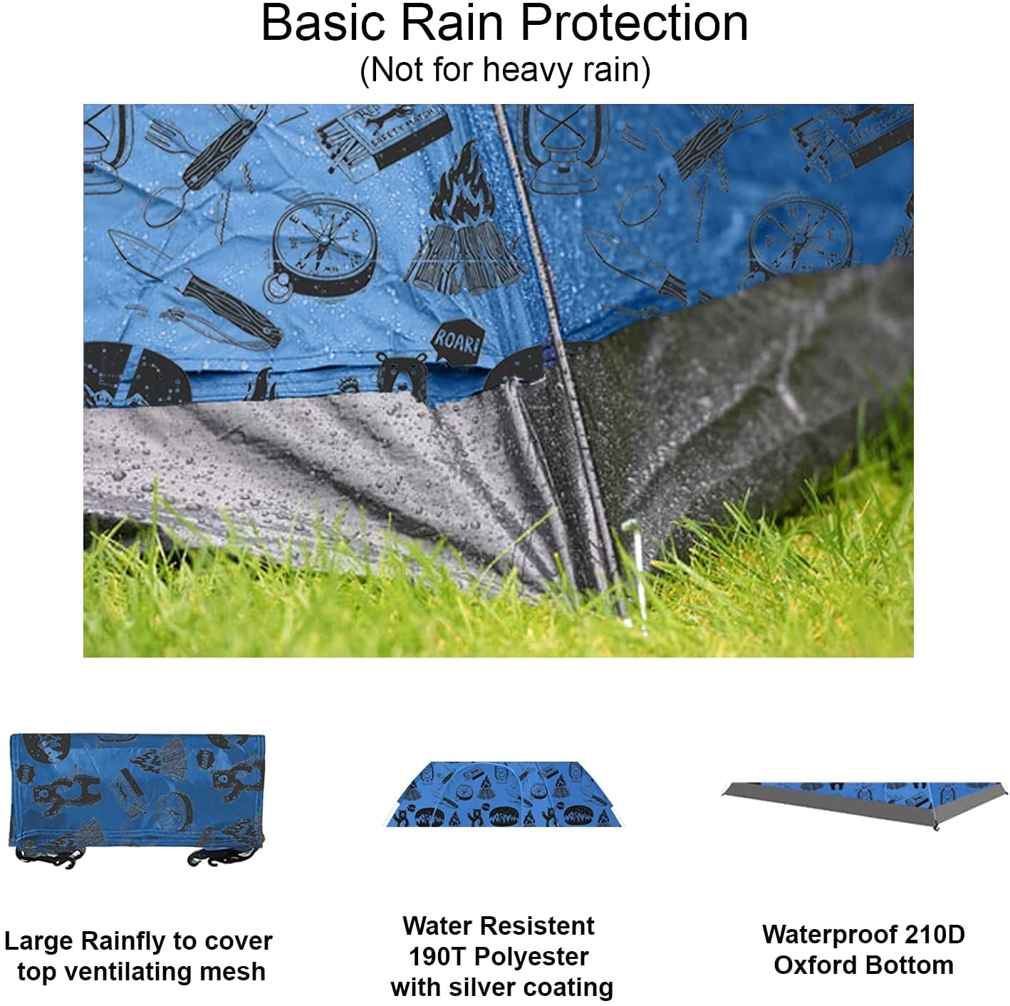 Basic Rain Protection: Features a large rainfly and water-resistant 190T Polyester fabric with a silver coating, suitable for light rain but not heavy rain.