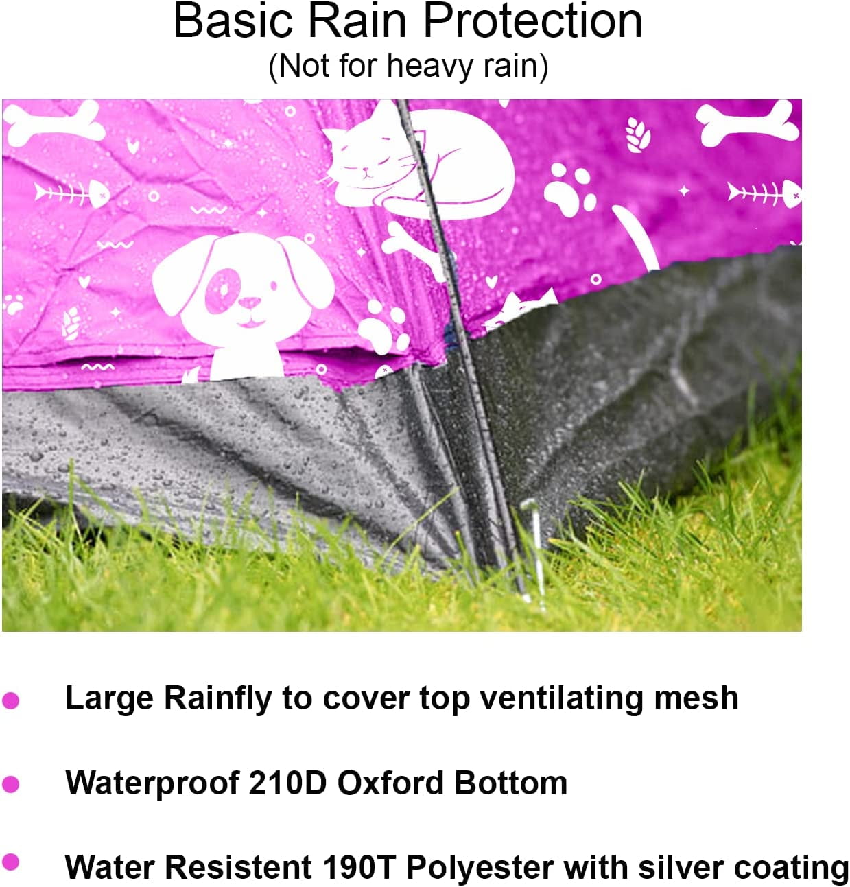 Basic Rain Protection (Not for heavy rain): The outdoor tent has basic rain protection functions but not for heavy rain. It is equipped with a large rainfly to cover the top. The fabric is 190T Polyester with a silver coating to be water-resistant.