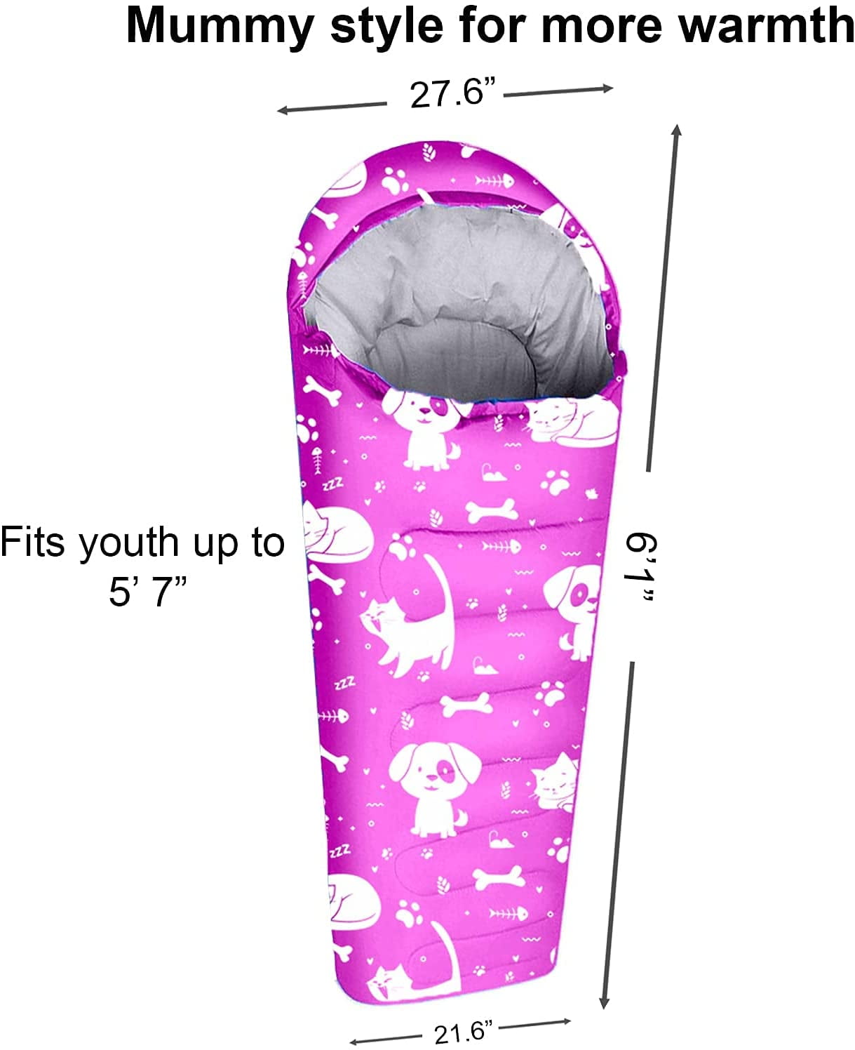 A 4-season camping sleeping bag (32 °F): Unlike other thin sleeping bags, from every step of the design, we kept warmth in mind for our young campers. The mummy style shape reduces unnecessary empty space to keep heat inside. Moreover, the extra draft tube, extra zipper snap, and cozy hoodie all help to keep our customers sleep sound and warm