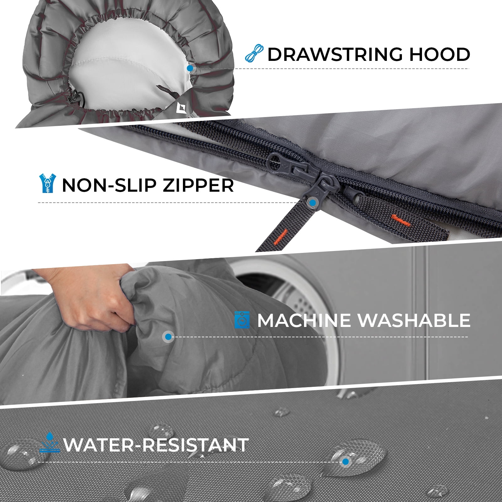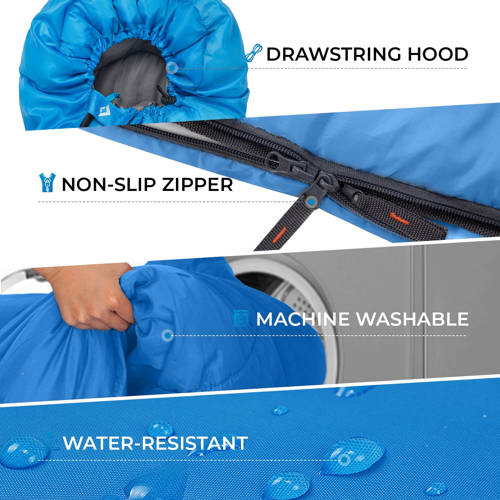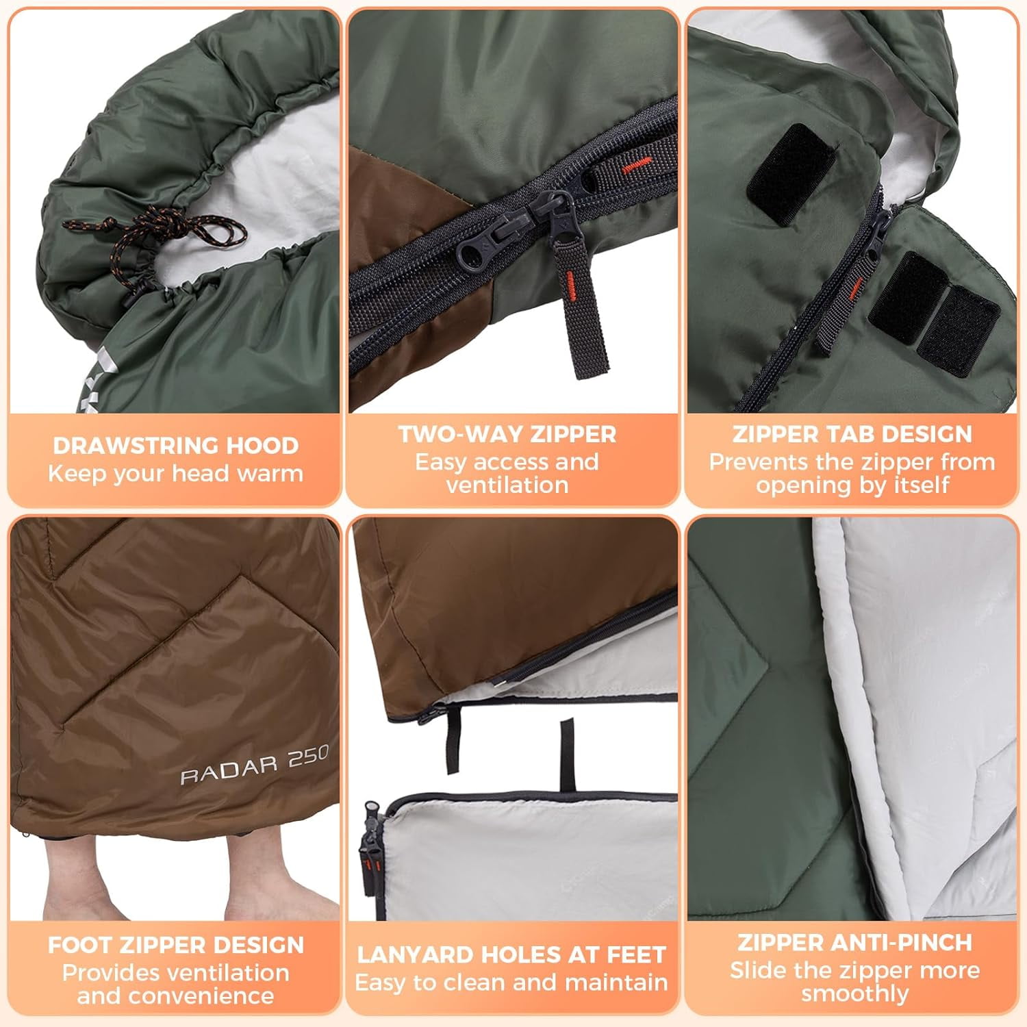 【Considerate Design】Featuring a drawstring-adjustable hood, this sleeping bag allows you to easily secure it, keeping your head warm and cozy during chilly nights. The innovative foot zipper provides adjustable ventilation, letting you regulate airflow to stay comfortable in varying temperatures throughout the season.