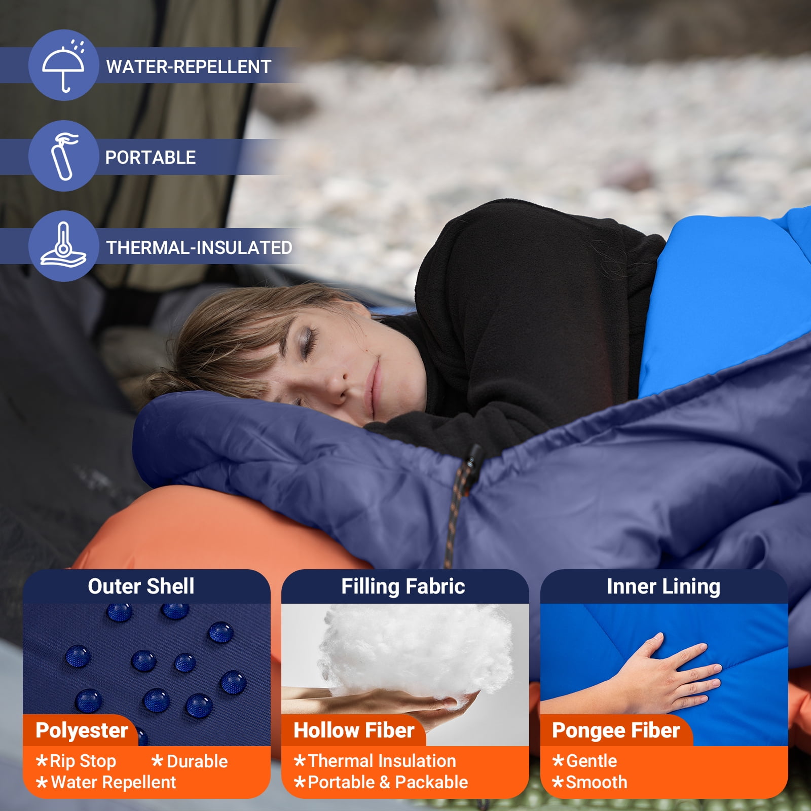 【Excellent Value for Money】Experience outstanding quality at a reasonable price with our sleeping bag. The robust 190T nylon exterior is both waterproof and breathable, offering excellent protection against the elements. Inside, the soft polyester pongee lining provides a comfortable, skin-friendly touch, while the hollow cotton insulation delivers warmth and coziness. Enjoy premium comfort and durability without the high cost.
