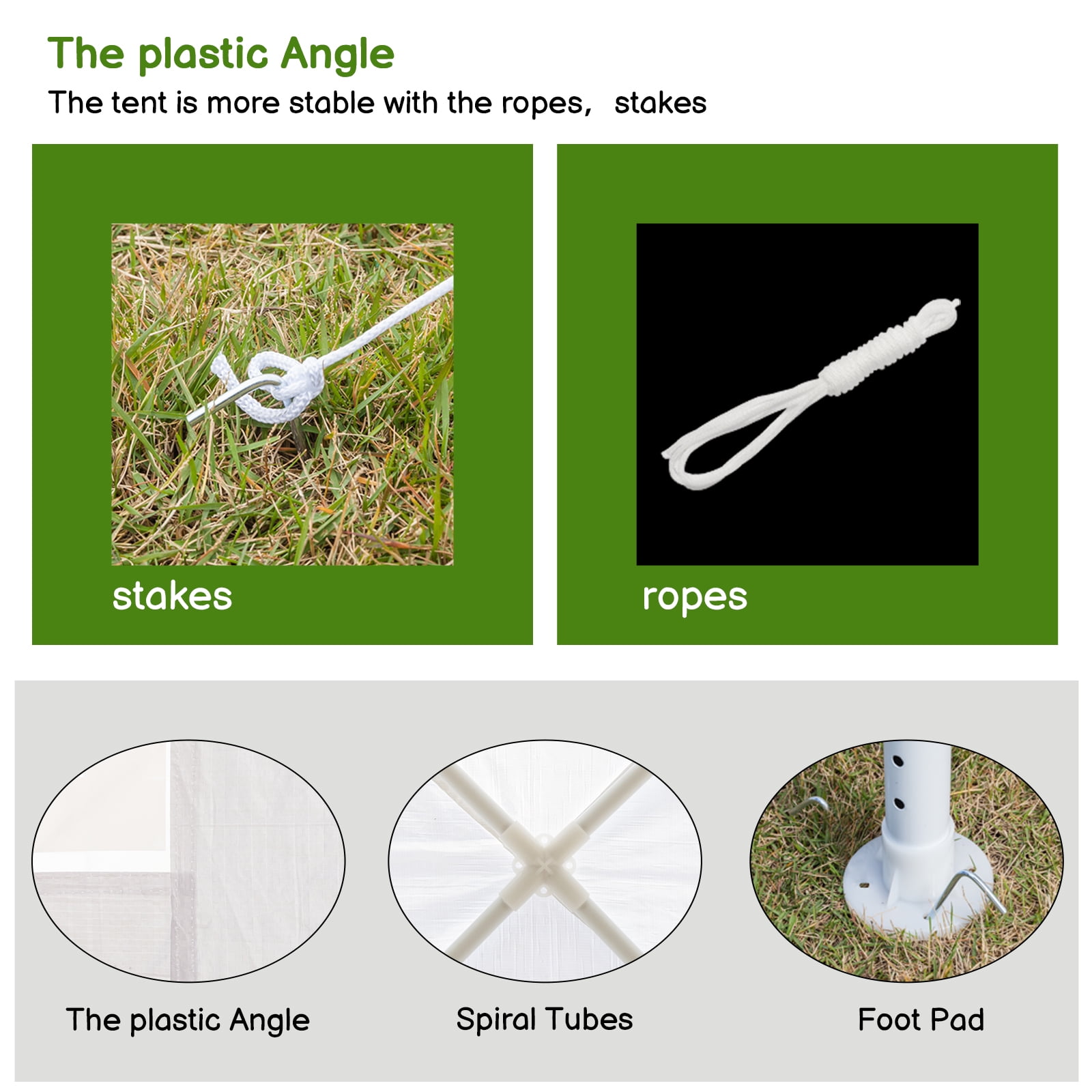 Crafted with precision, the plastic connectors between the tubes reinforce the stability of the tent frame. Our party tent features a rust- and corrosion-resistant white powder-coated steel framework, with steel tubes and new material plastic connectors for unmatched strength. Ropes and stakes are included to provide added stability in any setting.