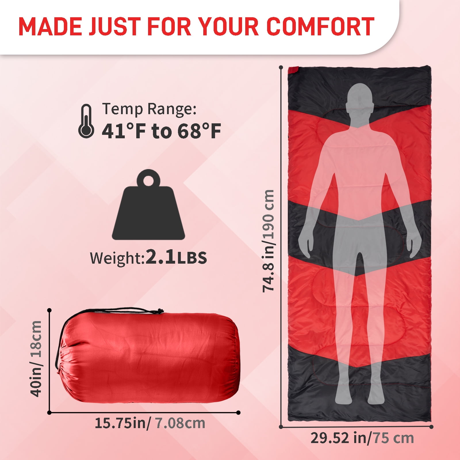 [ULTRALIGHT PORTABLE DESIGN] As part of Lightweight Camping Essentials Sleep Gear, this Lightweight Sleeping Bag weighs only 2.1 lbs. The Rectangular Sleeping Bag comes with a storage bag, making the Camping Sleeping Bag easy to carry for backpacking, hiking, or RV trips.