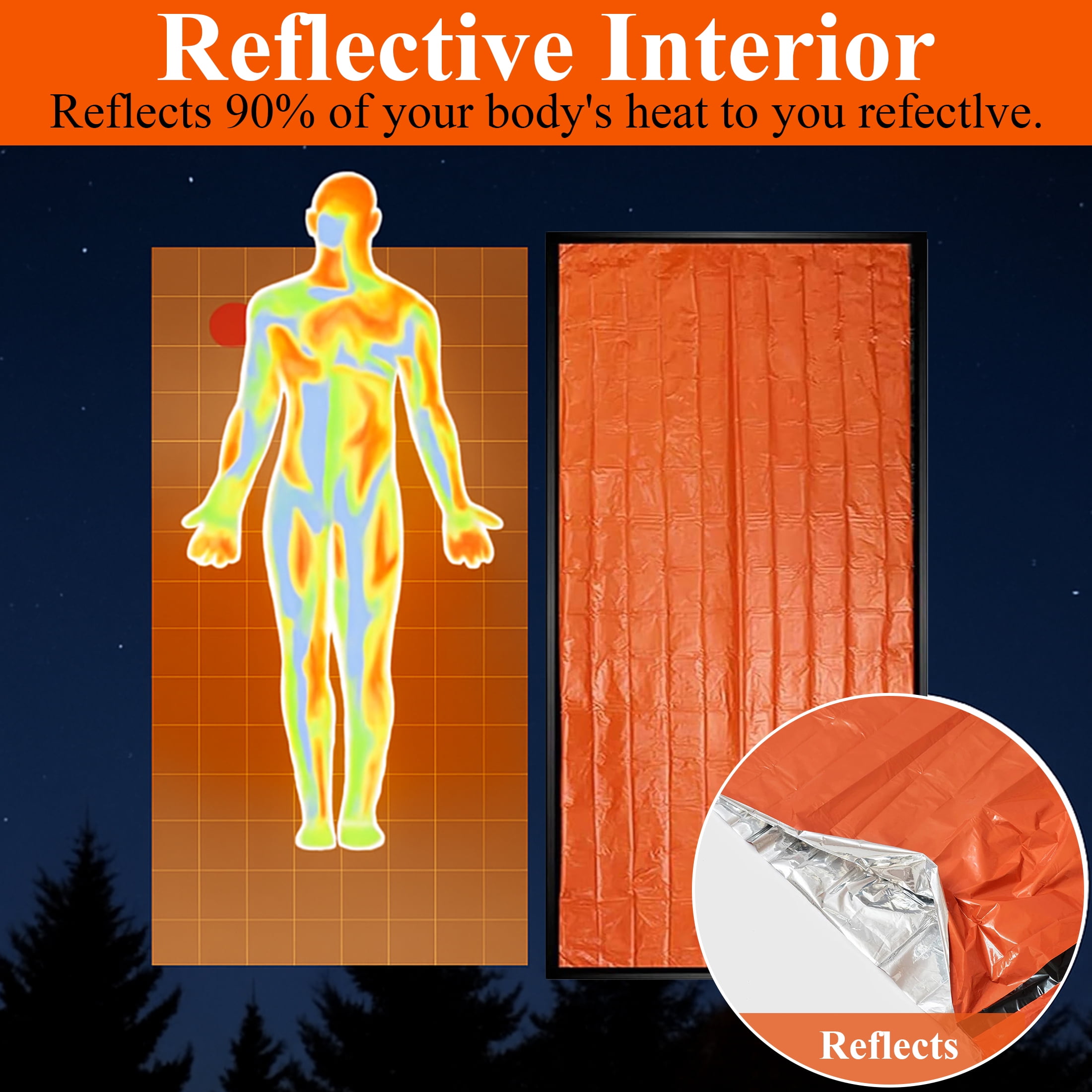 - Thermal Retention: Made from premium Mylar film, this emergency sleeping bag reflects and retains over 90% of body heat, preventing heat loss in extreme cold, rain, snow, or strong winds.