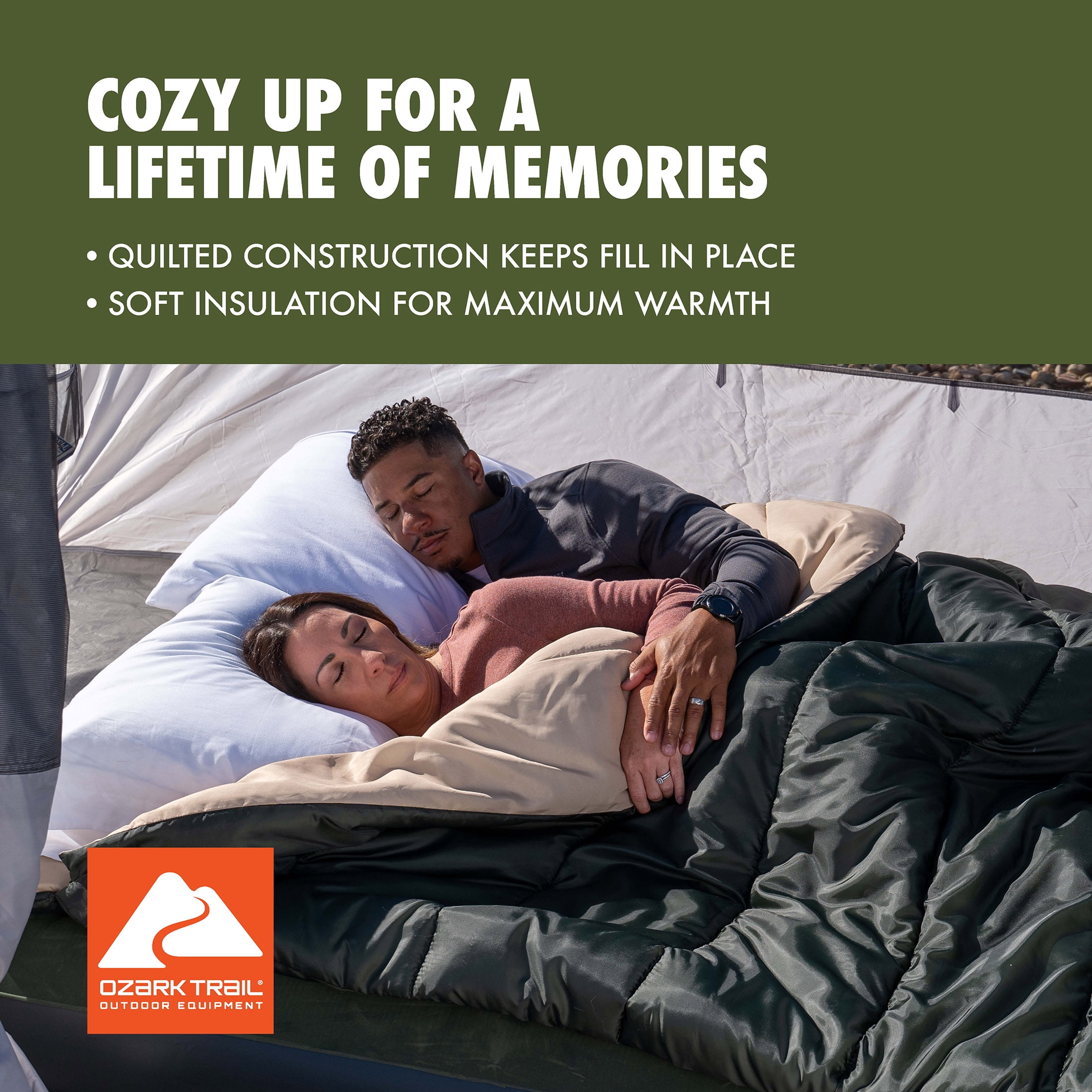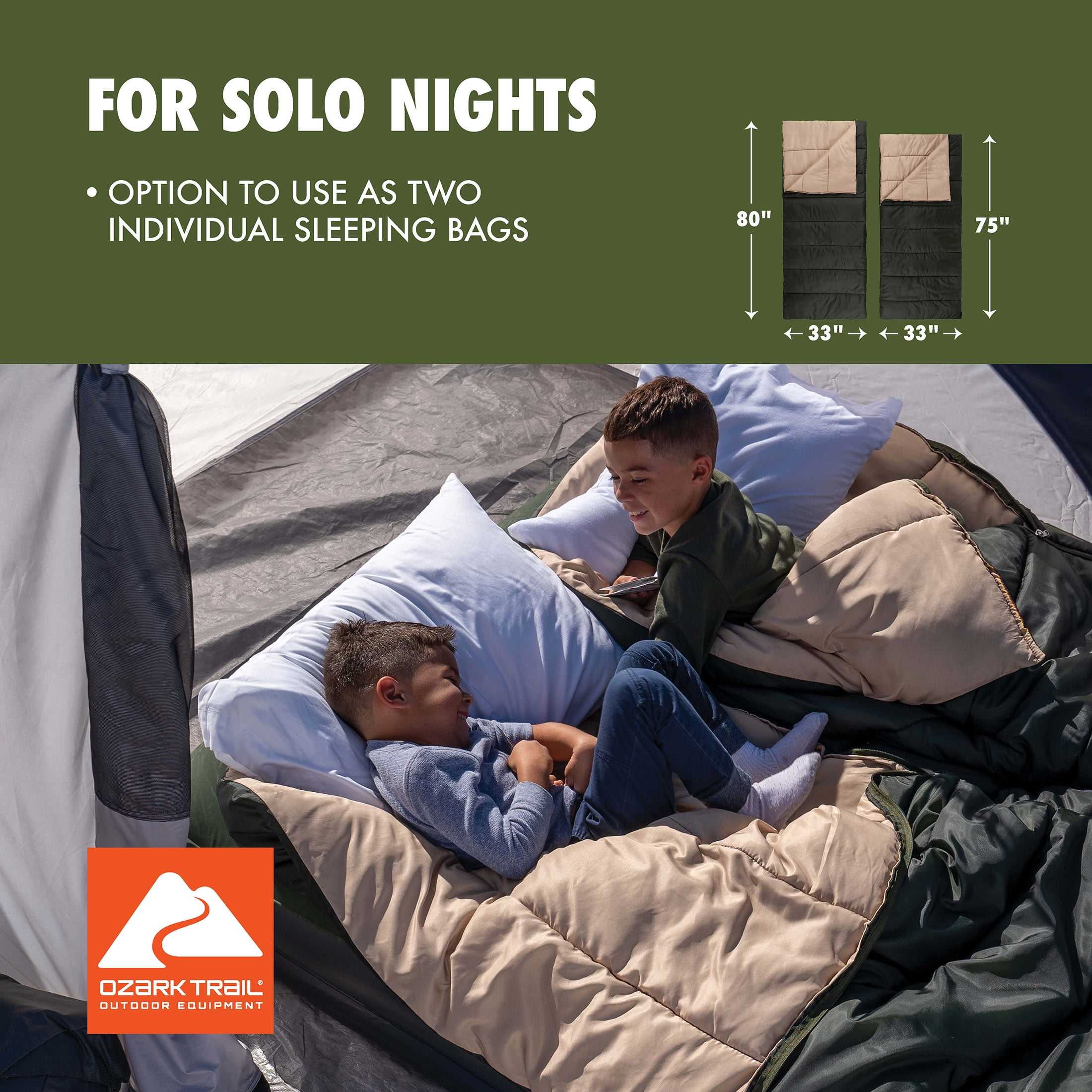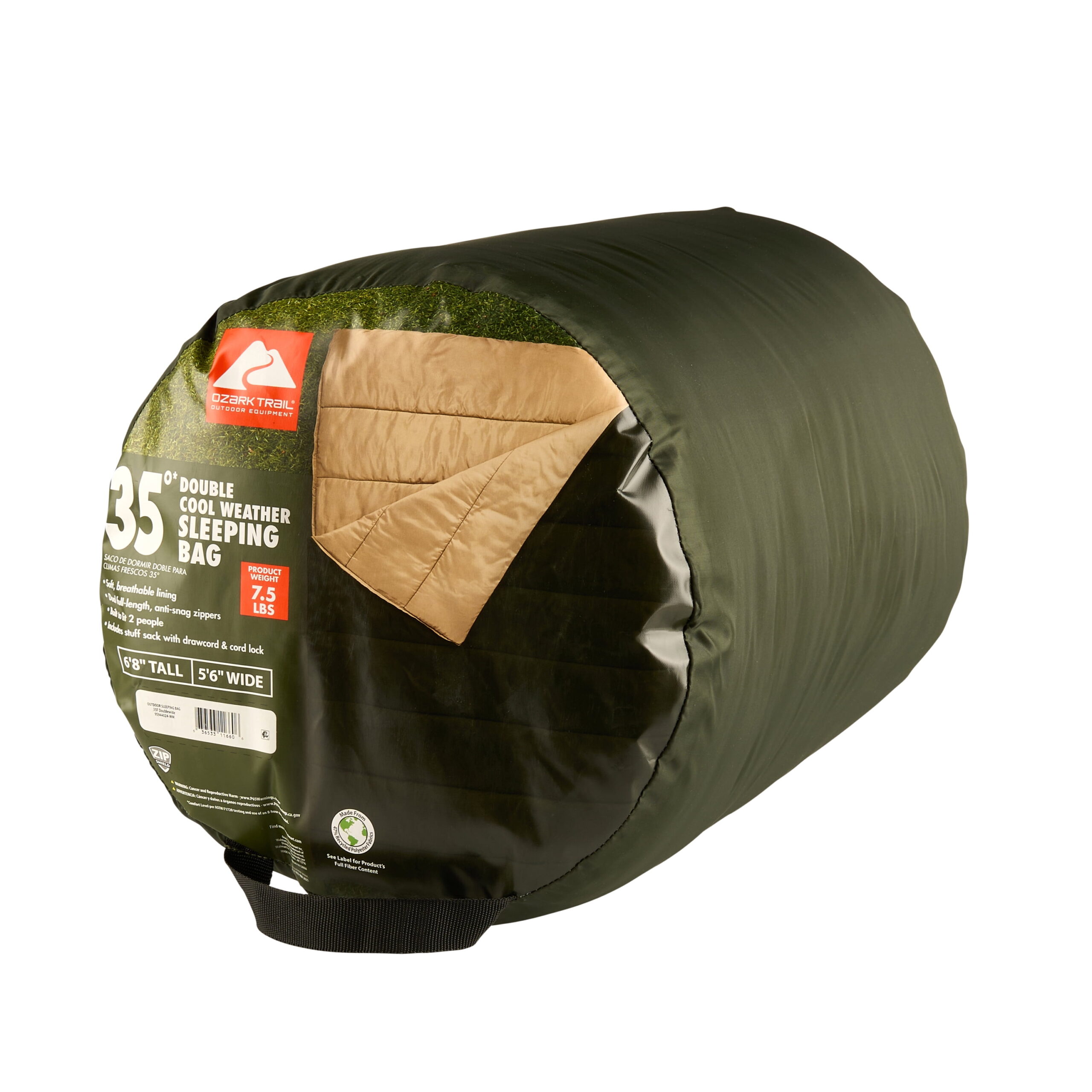 The Ozark Trail 35 Degree Double Cool Weather Sleeping Bag is extra roomy to accommodate couples or families who want to enjoy cool nights under the stars. Made from partially recycled fabrics that feel good against the skin and that you can feel good about, the super soft liner warms up quickly to keep you both nice and cozy. The dual-sided, full-length zippers with patent-pending Zip Shield anti-snag sliders make getting in and out of the bag a breeze, while also offering individual venting options at the foot. This doublewide, adult sized, sleeping bag is super versatile and can be assembled as two individual, smaller sleeping bags or opened fully as two separate quilts or for layering. This sleeping bag includes a stuff sack for carrying and helps to minimize storage space in your car and at home. Once home, you can toss this sleeping bag into the washing machine and have it ready to go for your next adventure. Whether you’re taking the family on an extended camping trip in the mountains or just taking a day trip to a local hiking trail, Ozark Trail has everything you need to enjoy the great outdoors. Browse all our gear like spacious tents, durable backpacks, warm sleeping bags, outdoor cooking supplies, and more.