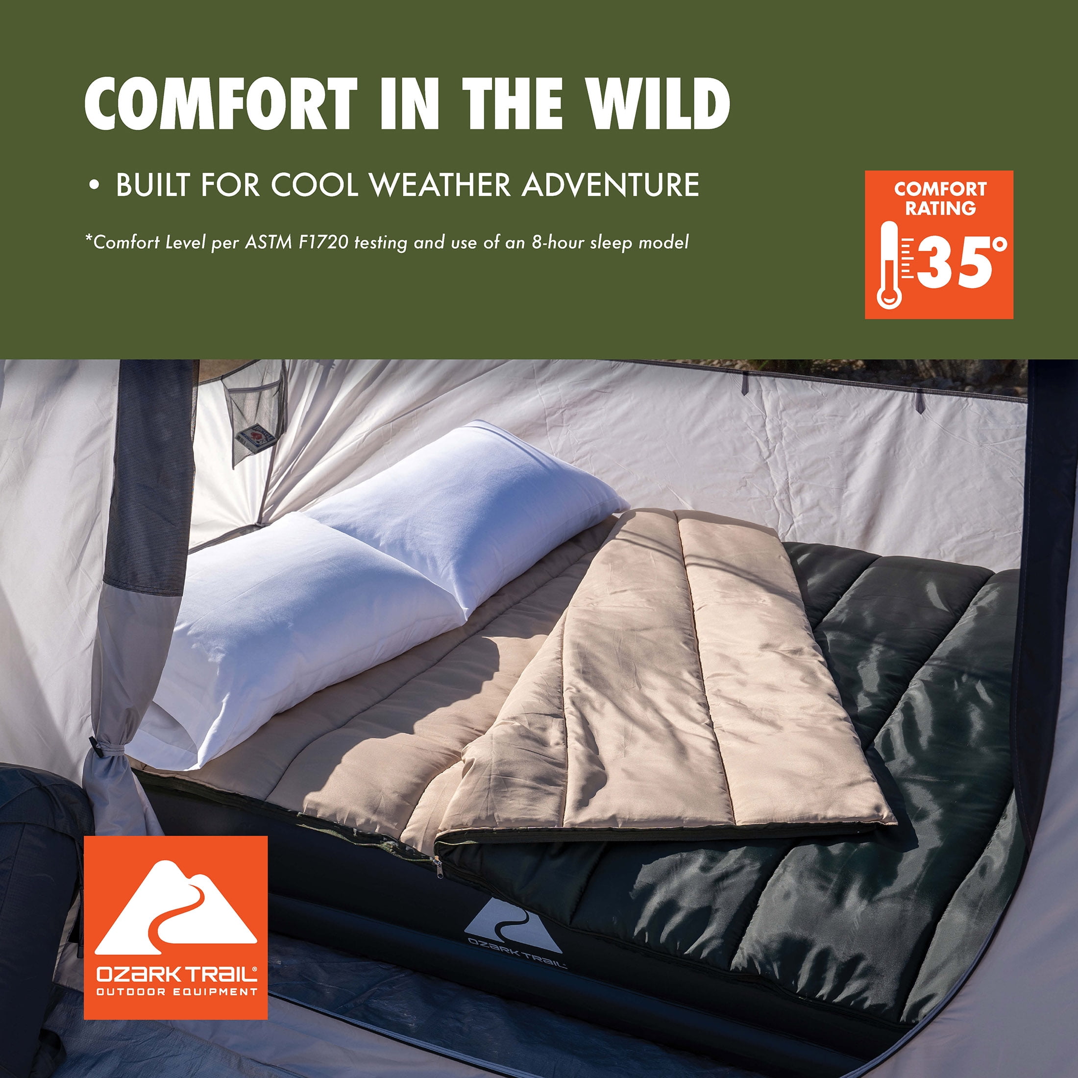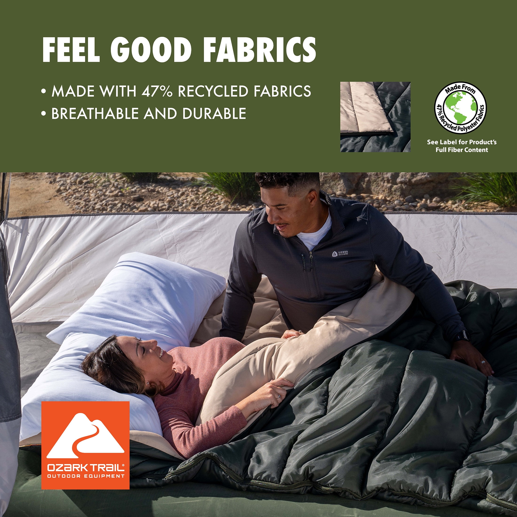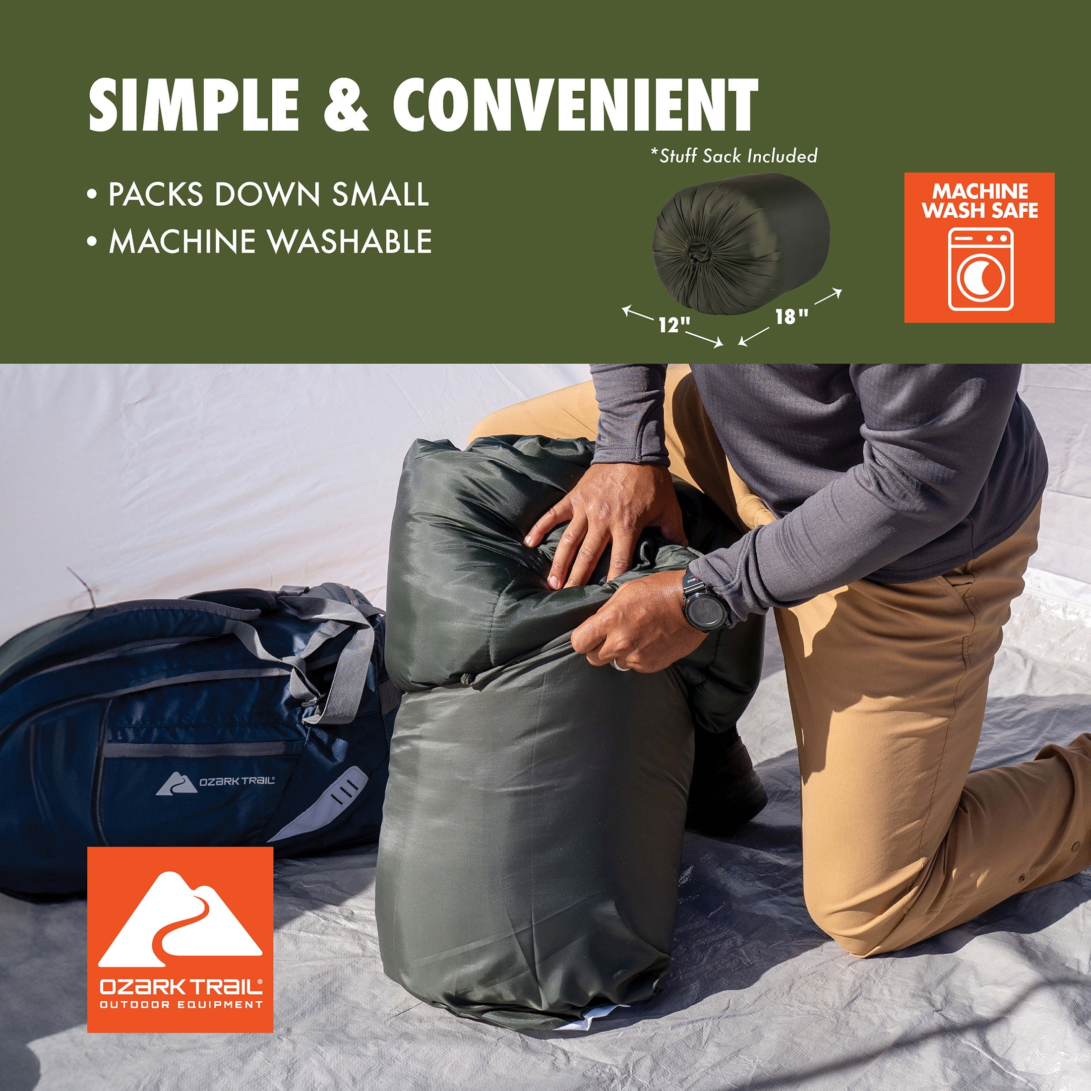 The Ozark Trail 35 Degree Double Cool Weather Sleeping Bag is extra roomy to accommodate couples or families who want to enjoy cool nights under the stars. Made from partially recycled fabrics that feel good against the skin and that you can feel good about, the super soft liner warms up quickly to keep you both nice and cozy. The dual-sided, full-length zippers with patent-pending Zip Shield anti-snag sliders make getting in and out of the bag a breeze, while also offering individual venting options at the foot. This doublewide, adult sized, sleeping bag is super versatile and can be assembled as two individual, smaller sleeping bags or opened fully as two separate quilts or for layering. This sleeping bag includes a stuff sack for carrying and helps to minimize storage space in your car and at home. Once home, you can toss this sleeping bag into the washing machine and have it ready to go for your next adventure. Whether you’re taking the family on an extended camping trip in the mountains or just taking a day trip to a local hiking trail, Ozark Trail has everything you need to enjoy the great outdoors. Browse all our gear like spacious tents, durable backpacks, warm sleeping bags, outdoor cooking supplies, and more.