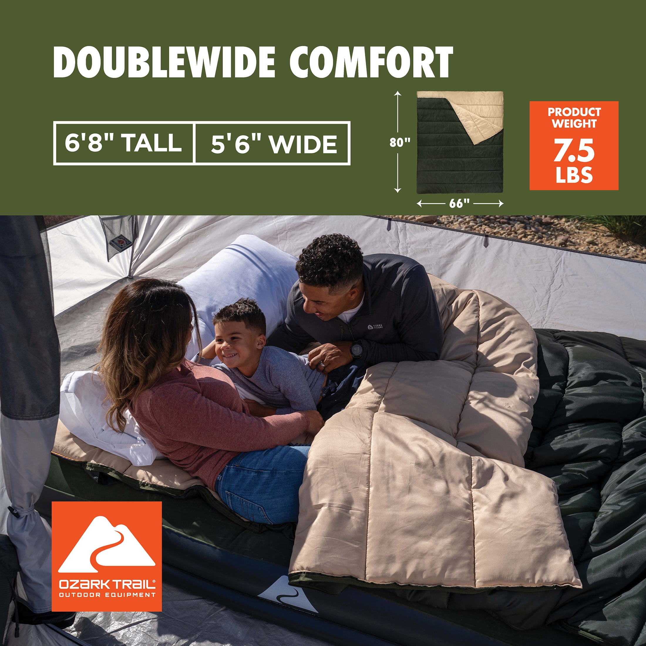 Dimensions: Sleeping bag measures 66″ W x 80″ L; carry bag measures 18″ L x 12″ W; carry weight is 7.5 lb.