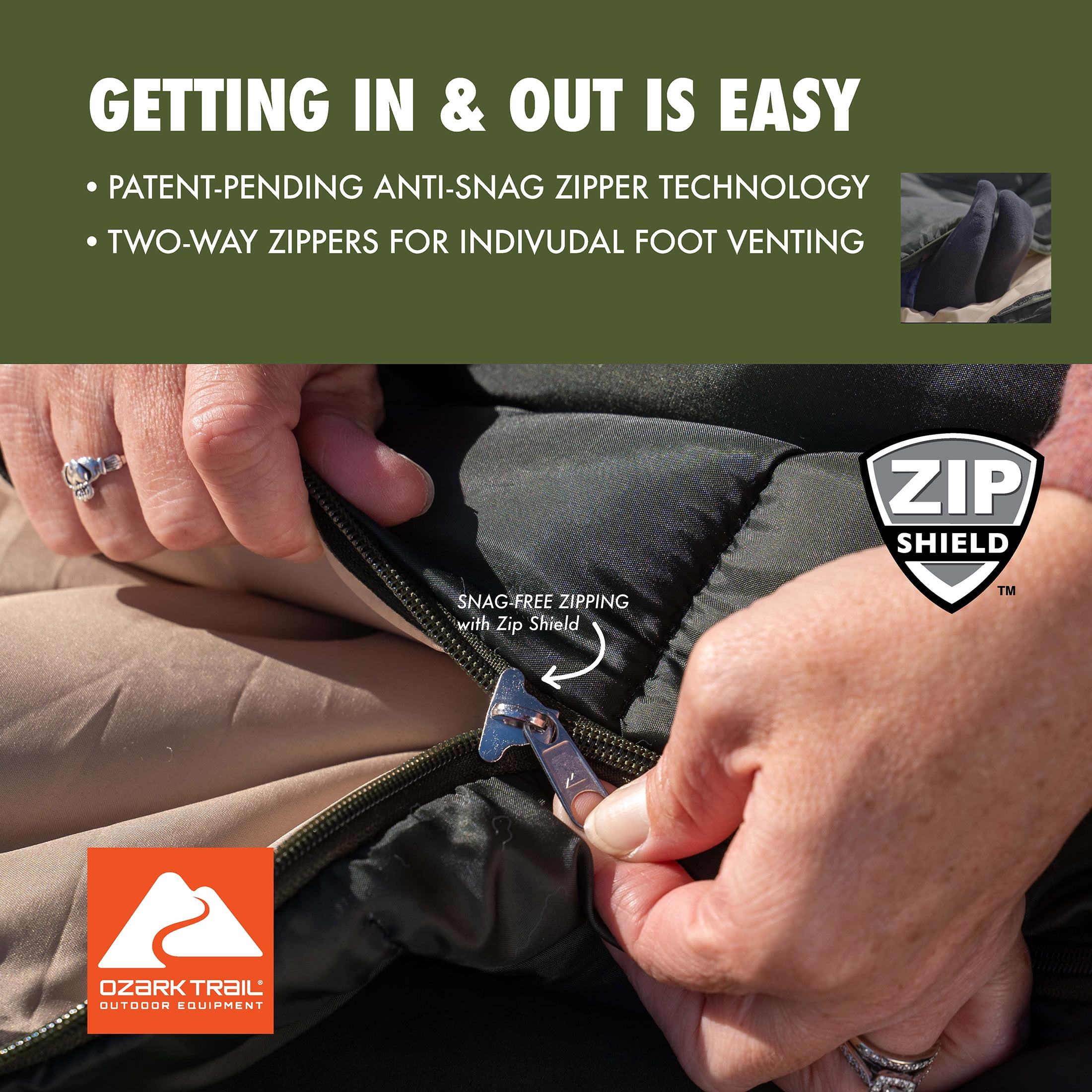 Dual-sided, full-length zippers with patent-pending Zip Shield anti-snag sliders make it easy to enter and exit the sleeping bag while also offering venting options at the feet.