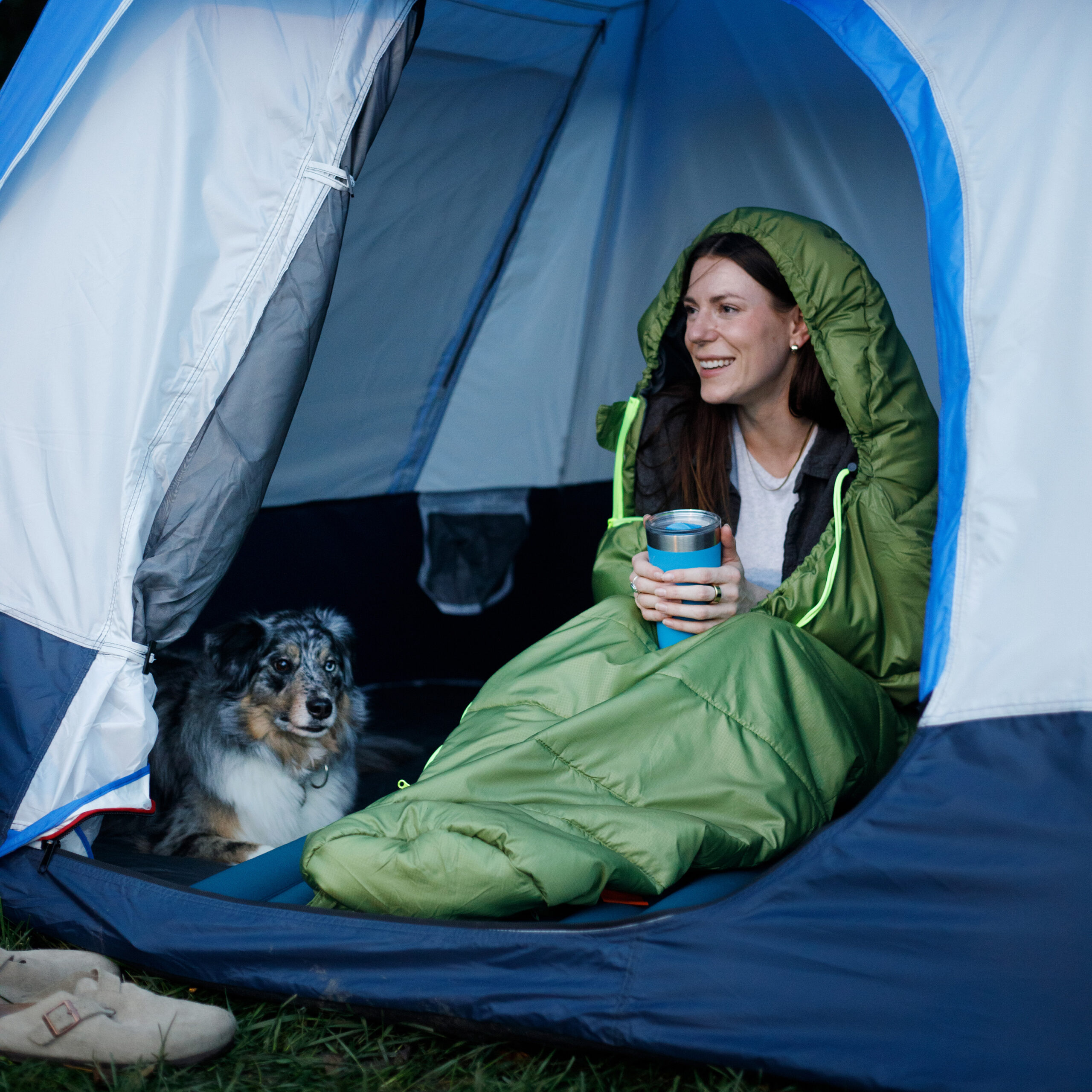 Mummy shape covers head and shoulders while keeping feet snug and warm