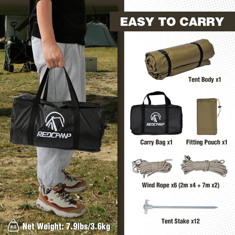 Lightweight & Portable Design: Weighs just 4.2lbs and packs into a compact carry bag. Includes tent body, fitting pouch, bag, 6 ropes, and 12 stakes. Perfect for camping, beach trips, and backyard use, offering great portability without sacrificing durability. (Note: Tarp poles are NOT INCLUDED)