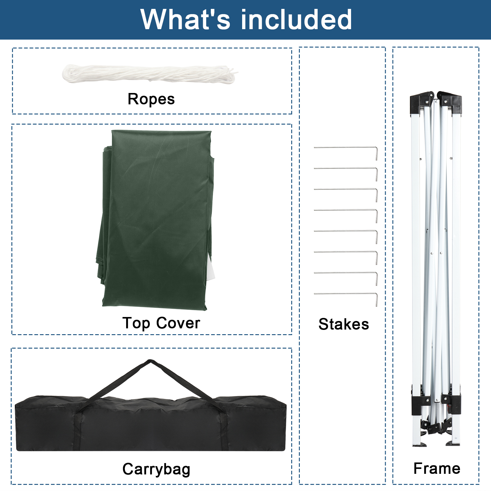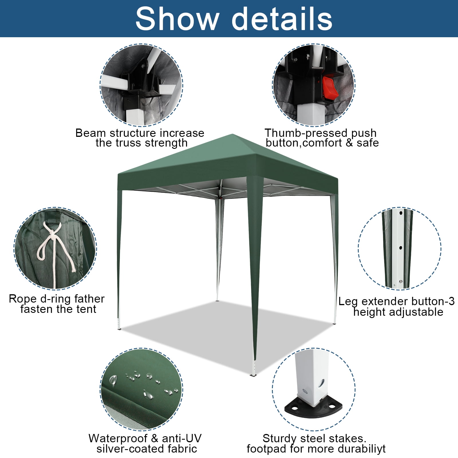 Specifications: 1. Material: White Powder Coated Steel Frame & WaterProof 210D Oxford Fabric Cover 2. Color: Blue 3. Dimensions: (78.74 x 78.74 x 98.43)” / (200 x 200 x 250)cm (L x W x H) 4. Weight: 19.18lbs / 8.7 kg 5. Waterproof: Yes 6. Suitable for: All Kinds Of Events 7. Tent Structure: Single Tent