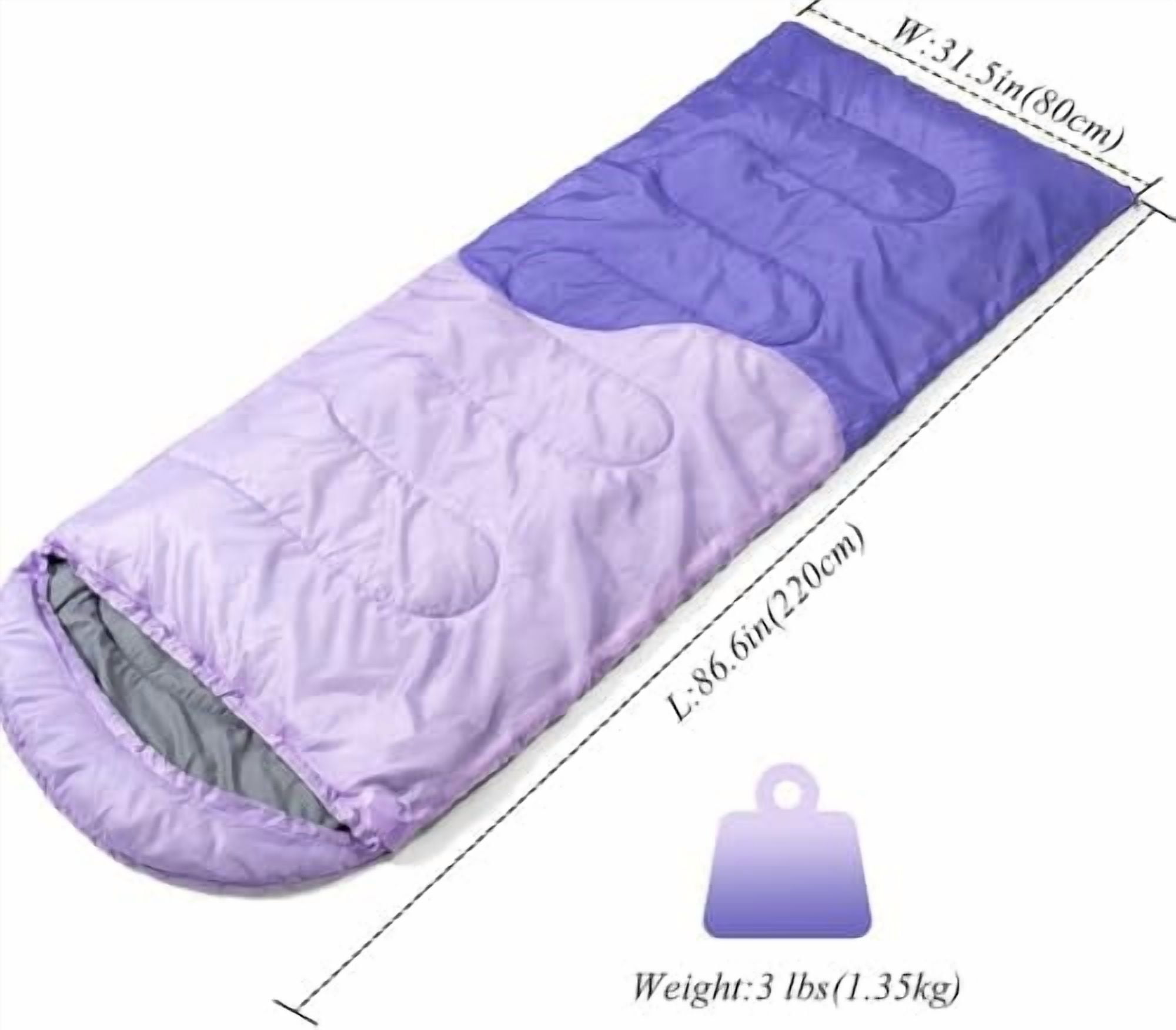 - Roomy and Lightweight:The size of the sleeping bag is 86.6 x 31.5 inches(220 x 80 cm).Pack weight is about 3.3lbs.It could be fully opened to be a blanket for picnic or play.Convenient to carry along for any outdoor adventures with the carry bag