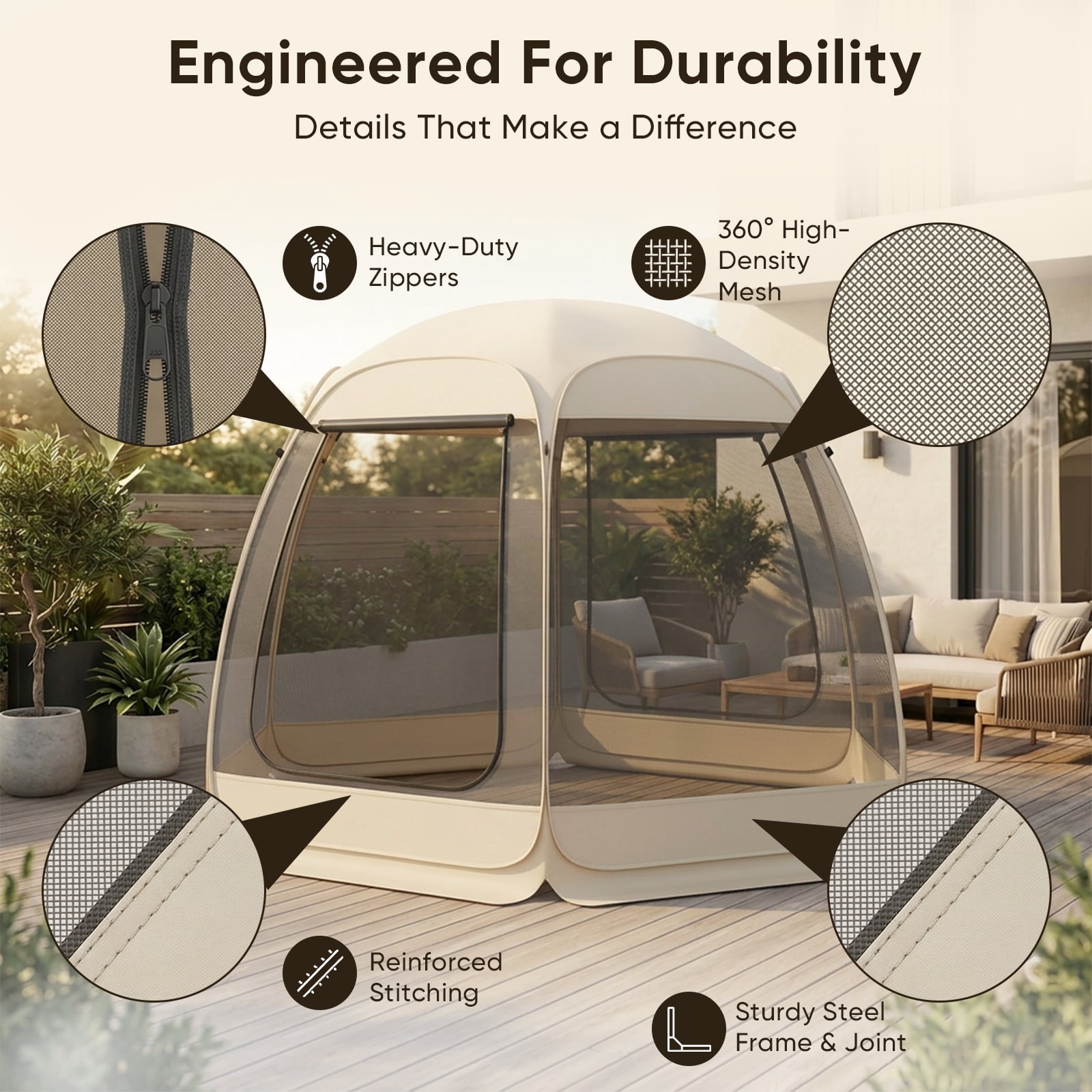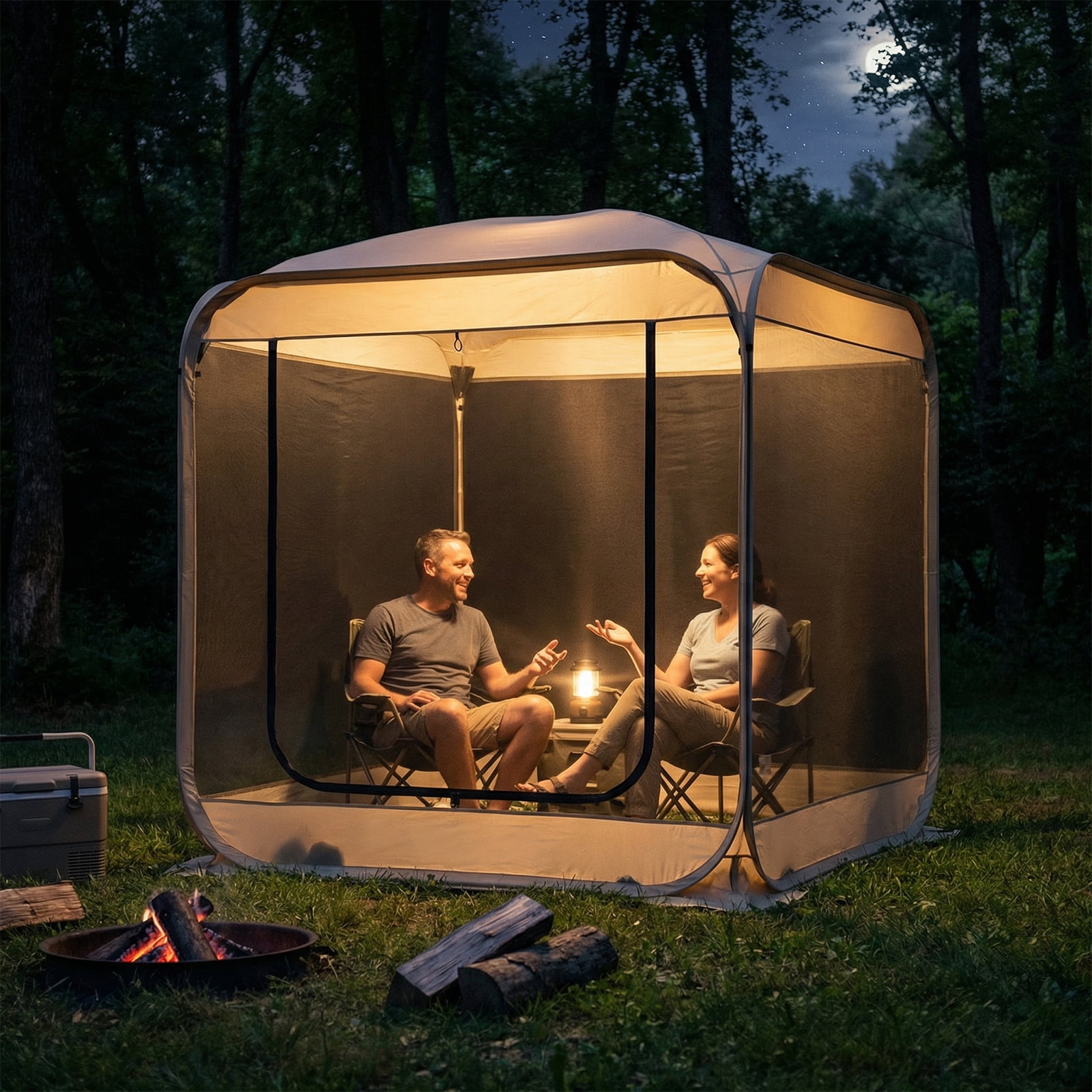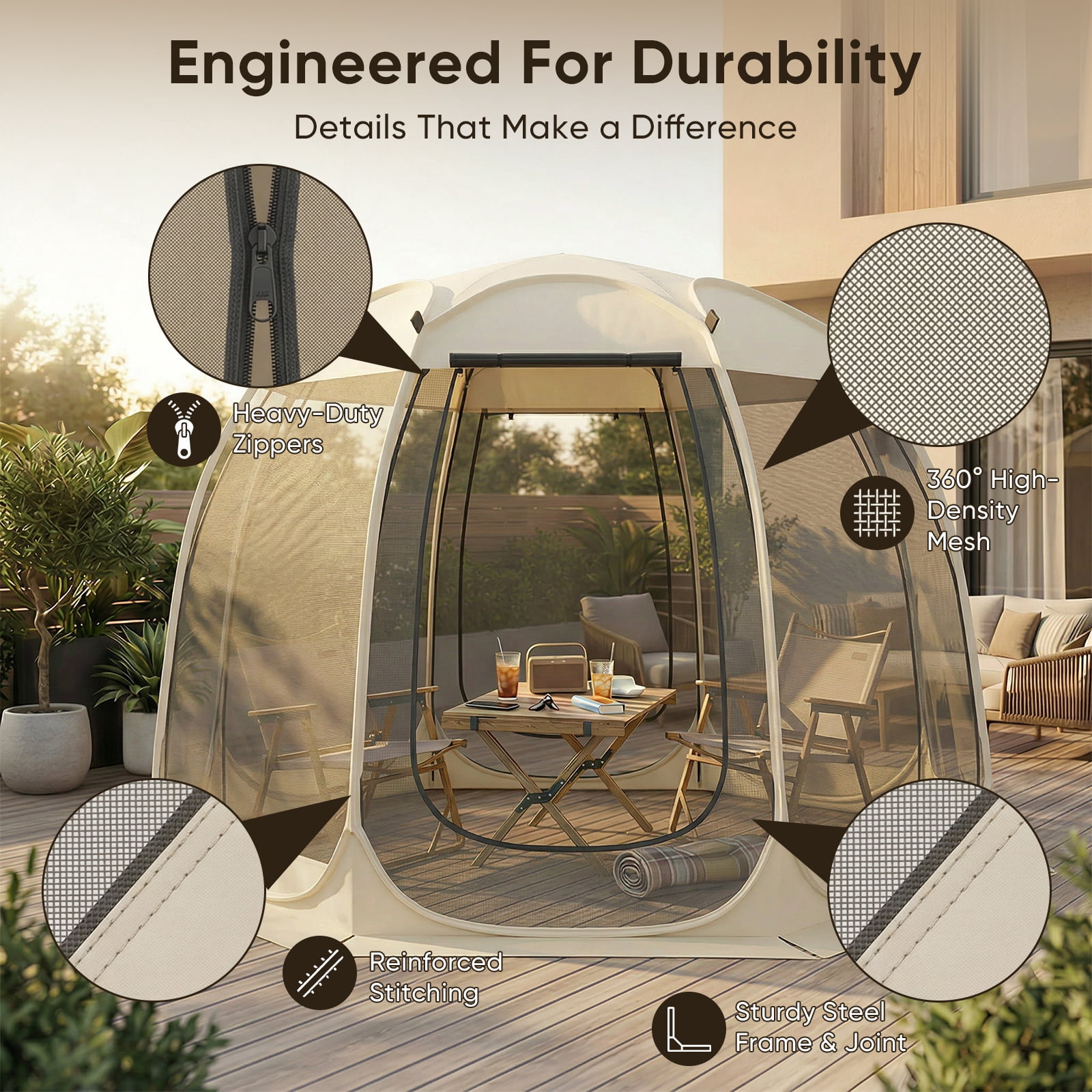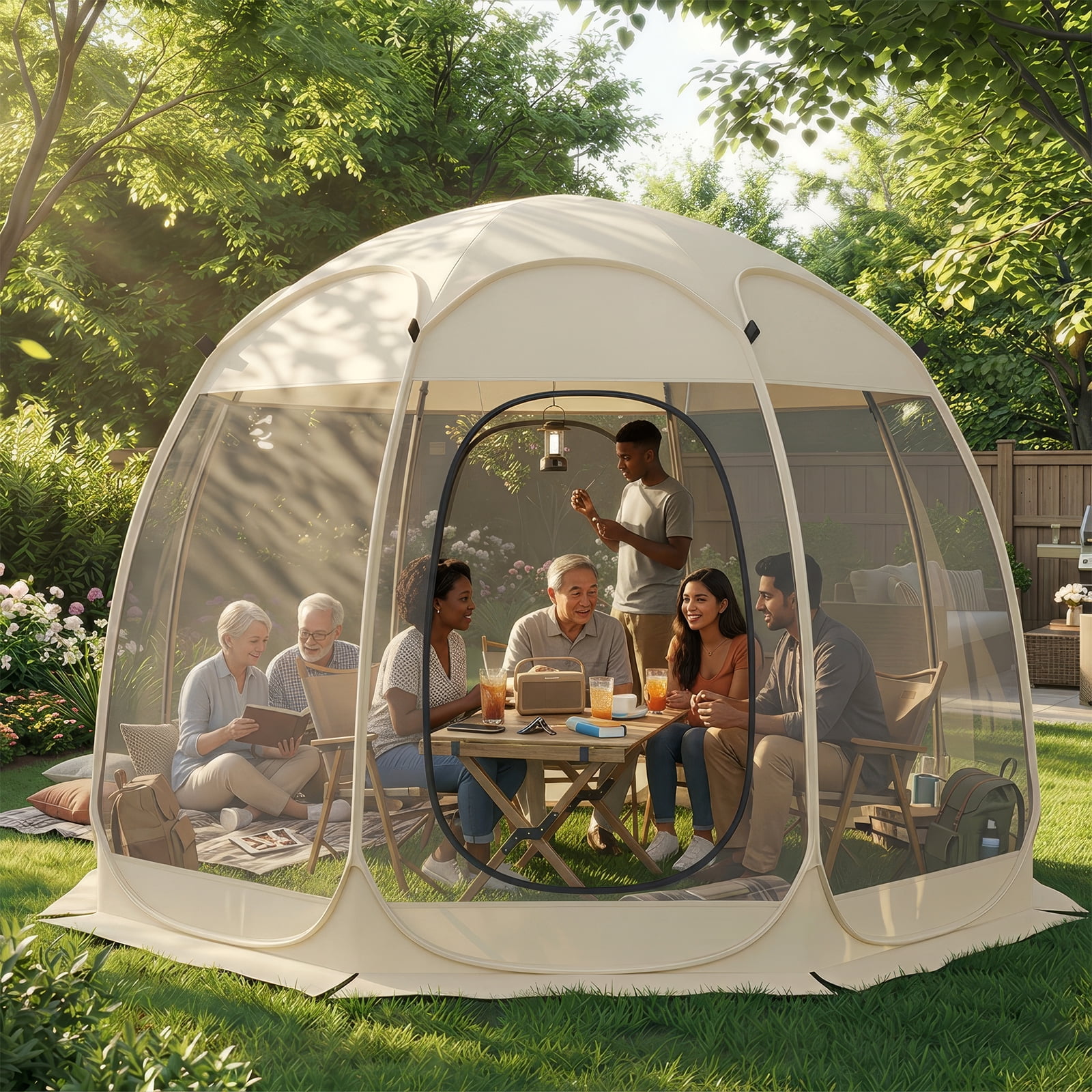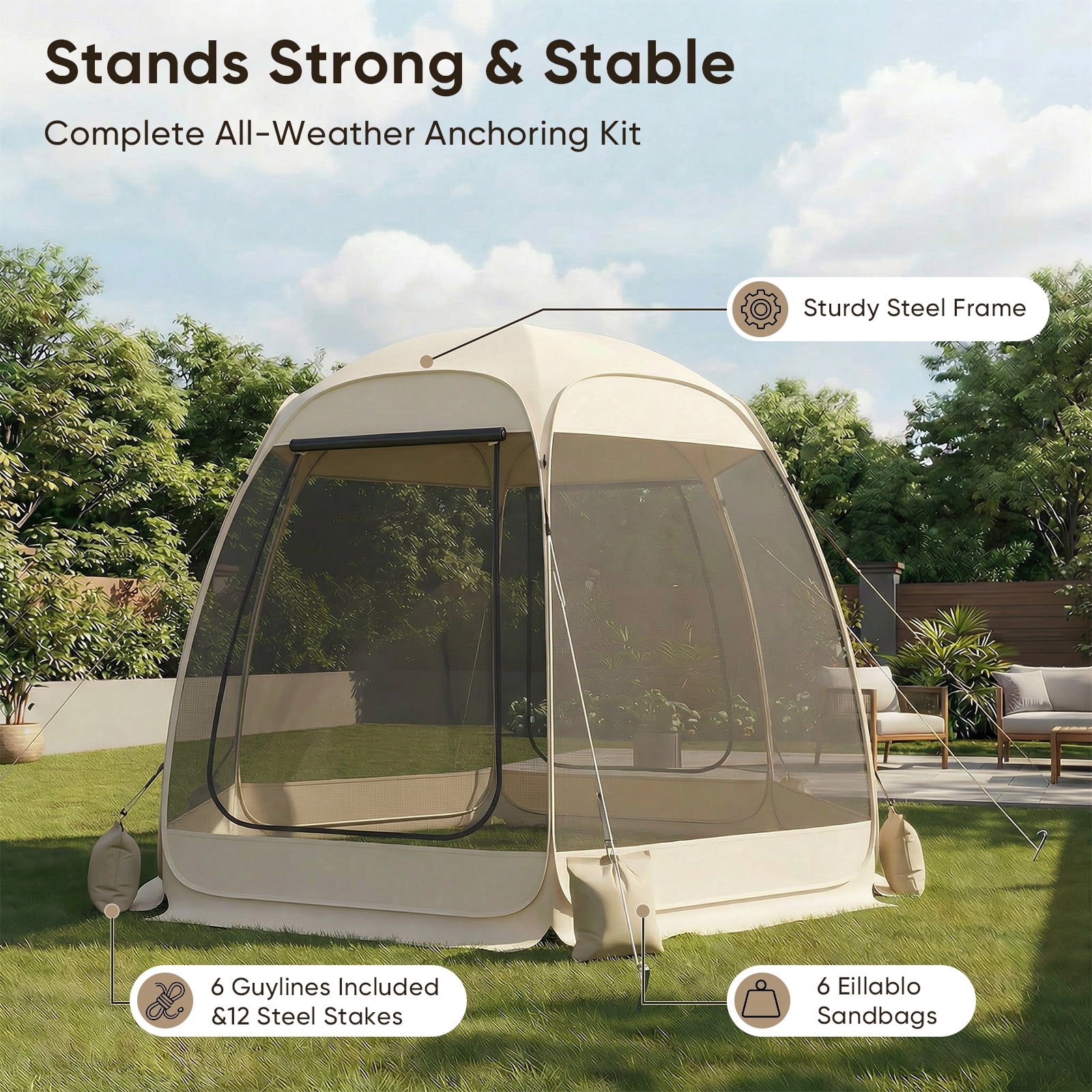 Built with reinforced steel and fiberglass poles, this screen tents for camping remains upright even in windy conditions. The curved roof design prevents water pooling and sagging, providing a durable, weather-resistant outdoor canopy.