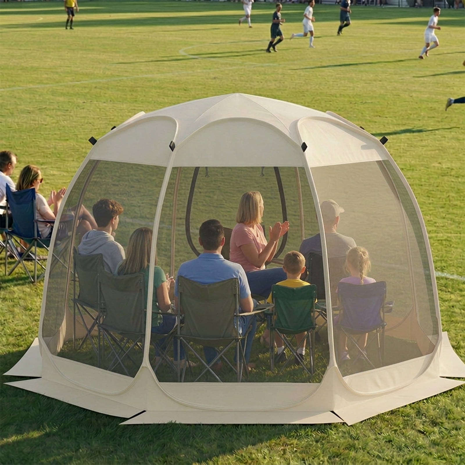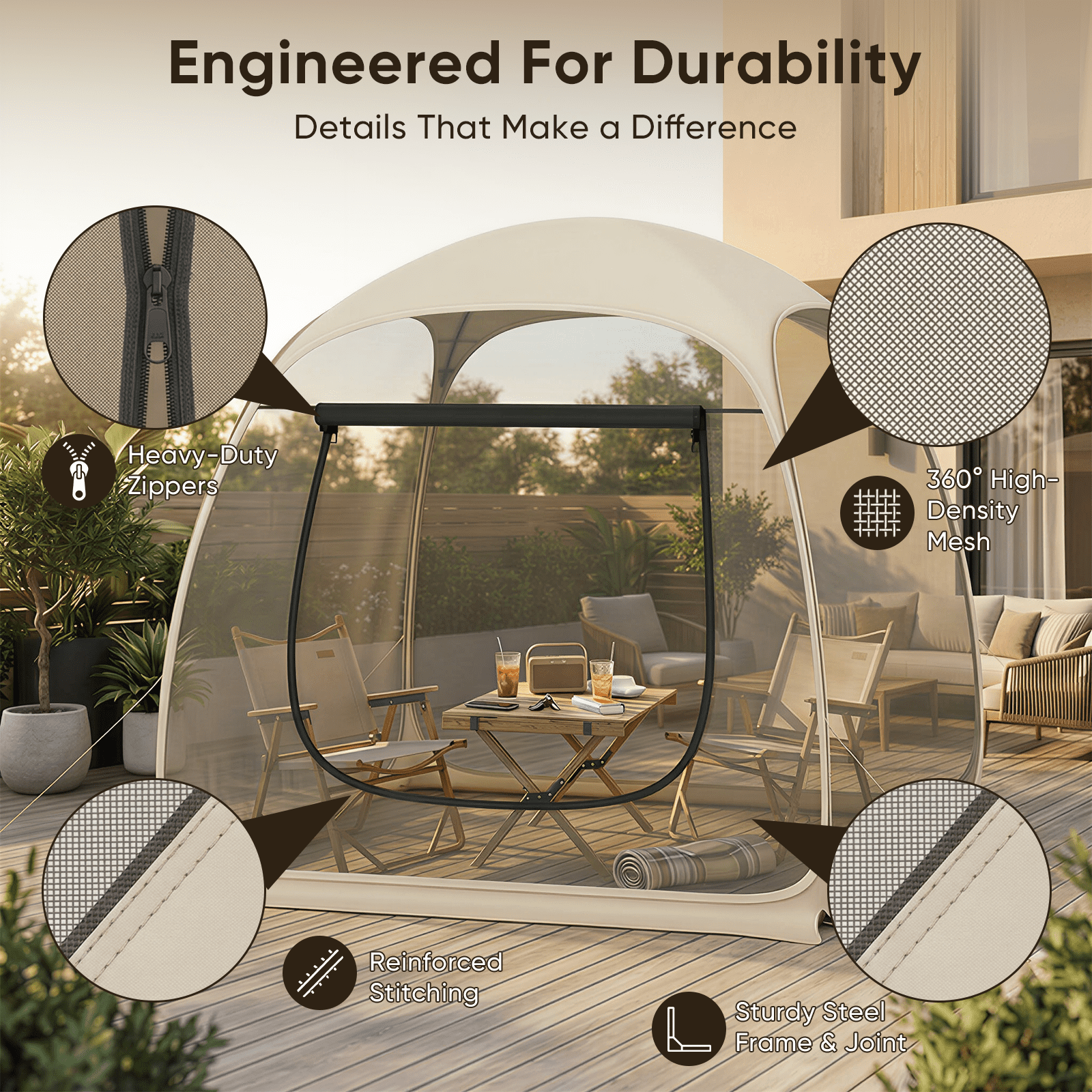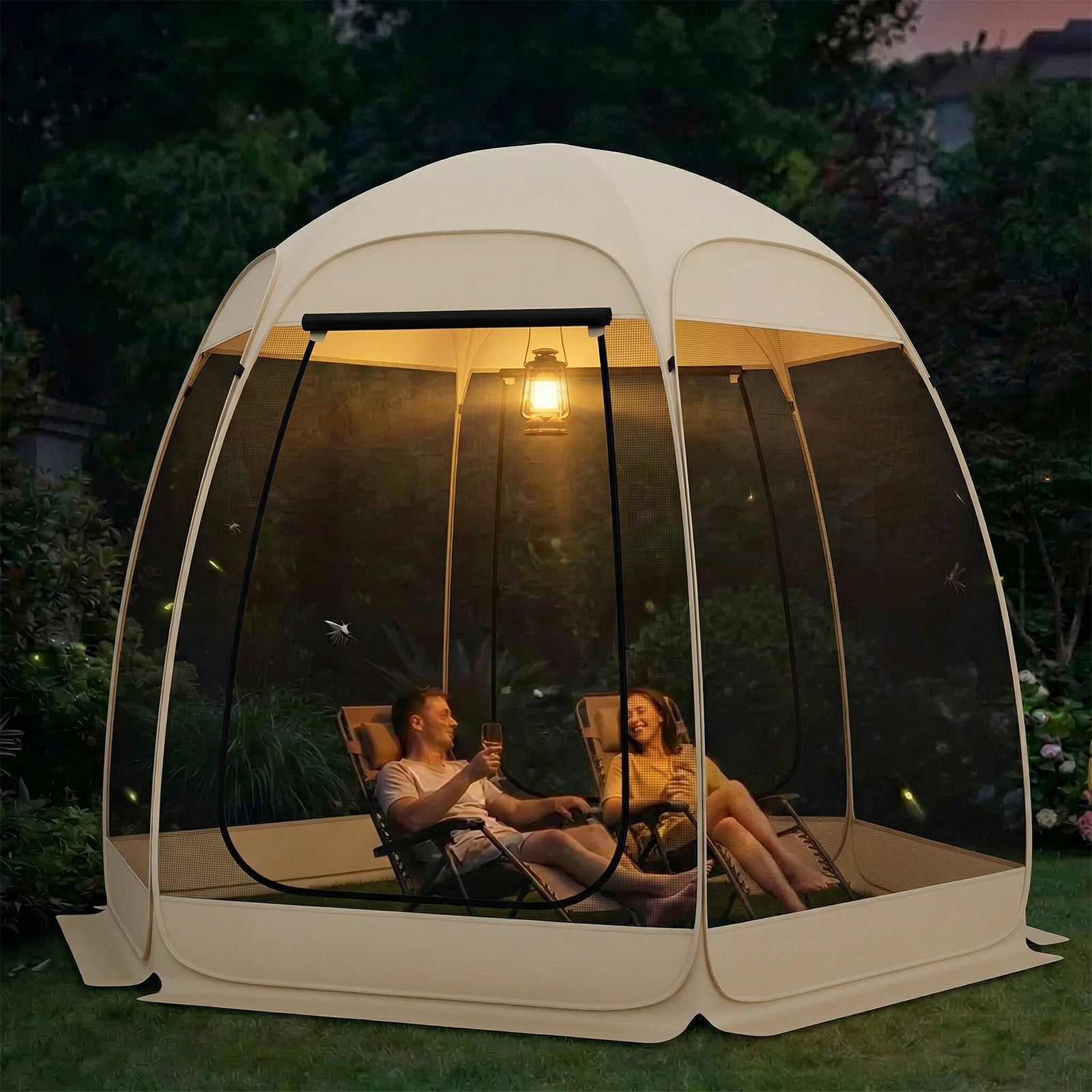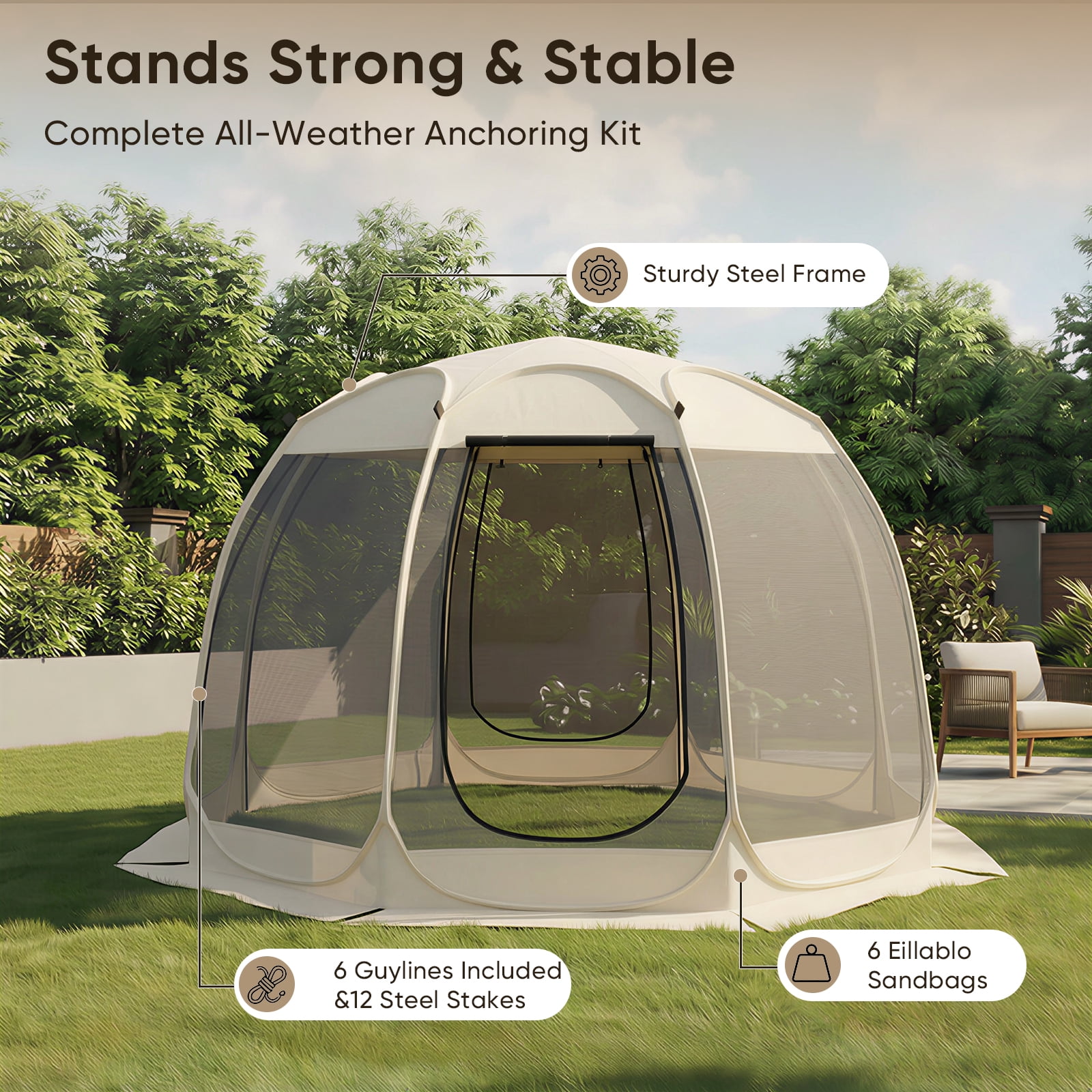Built with reinforced steel and fiberglass poles, this screen tents for camping remains upright even in windy conditions. The curved roof design prevents water pooling and sagging, providing a durable, weather-resistant outdoor canopy.