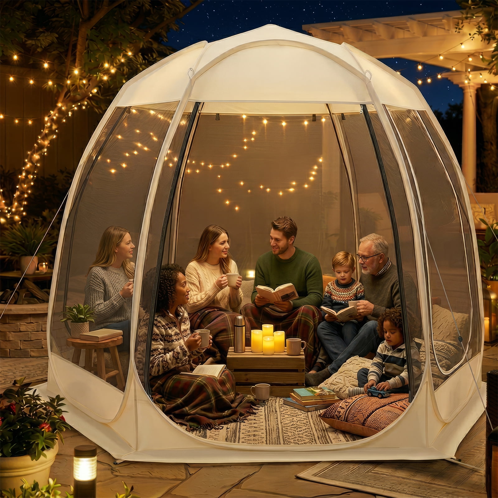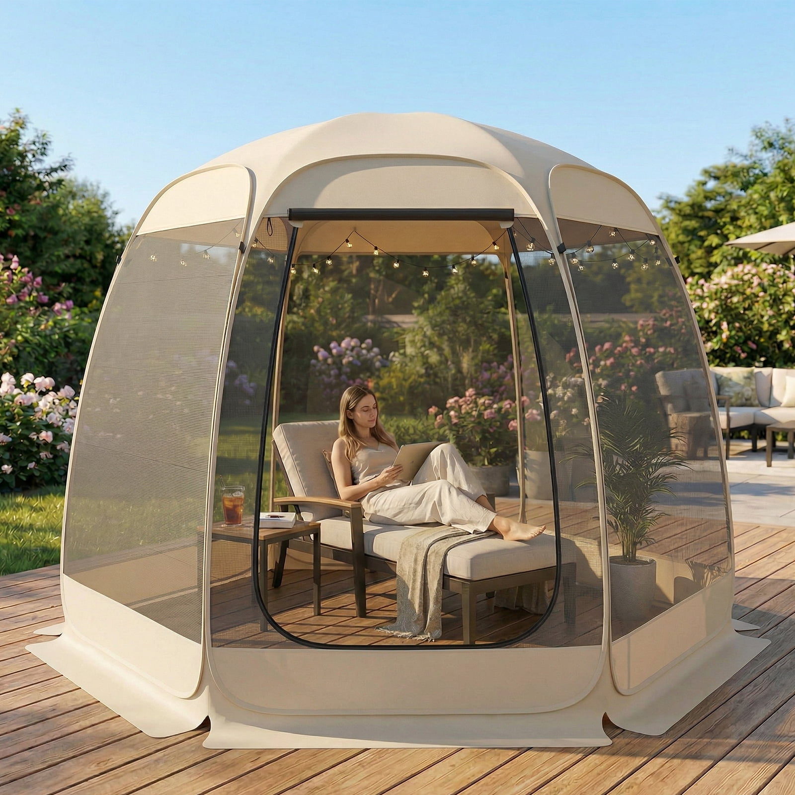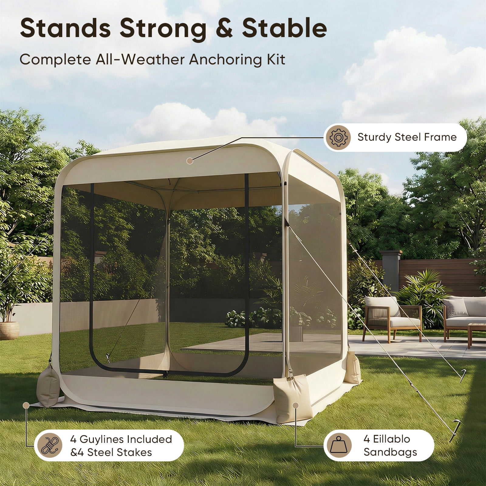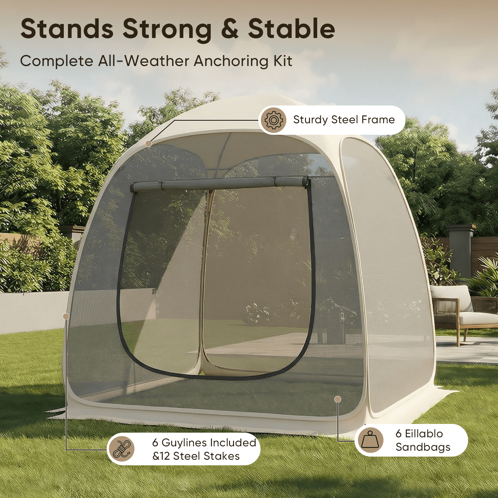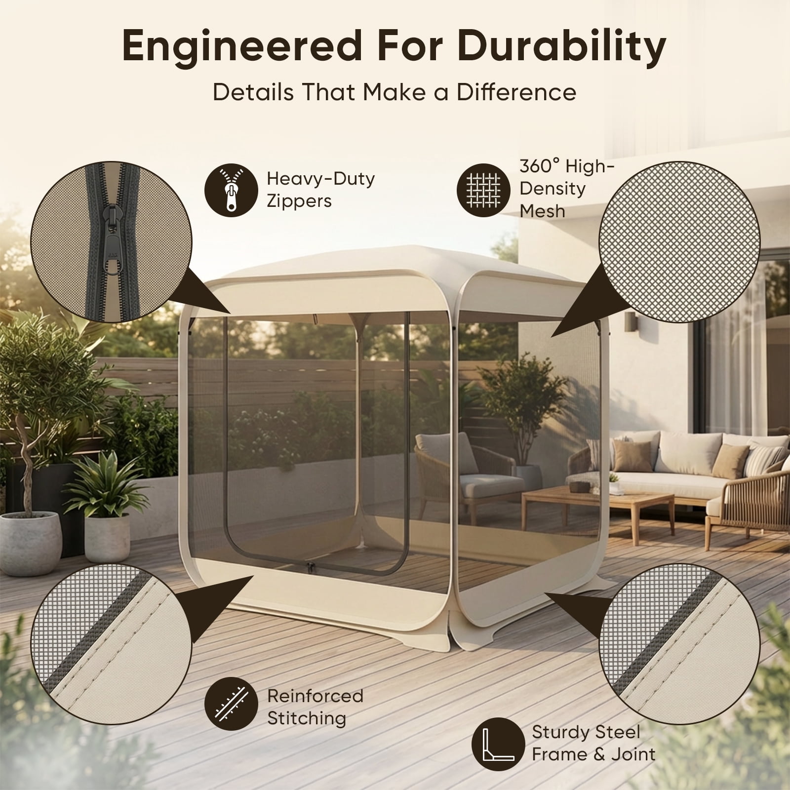 Built with reinforced steel and fiberglass poles, this screen tents for camping remains upright even in windy conditions. The curved roof design prevents water pooling and sagging, providing a durable, weather-resistant outdoor canopy.