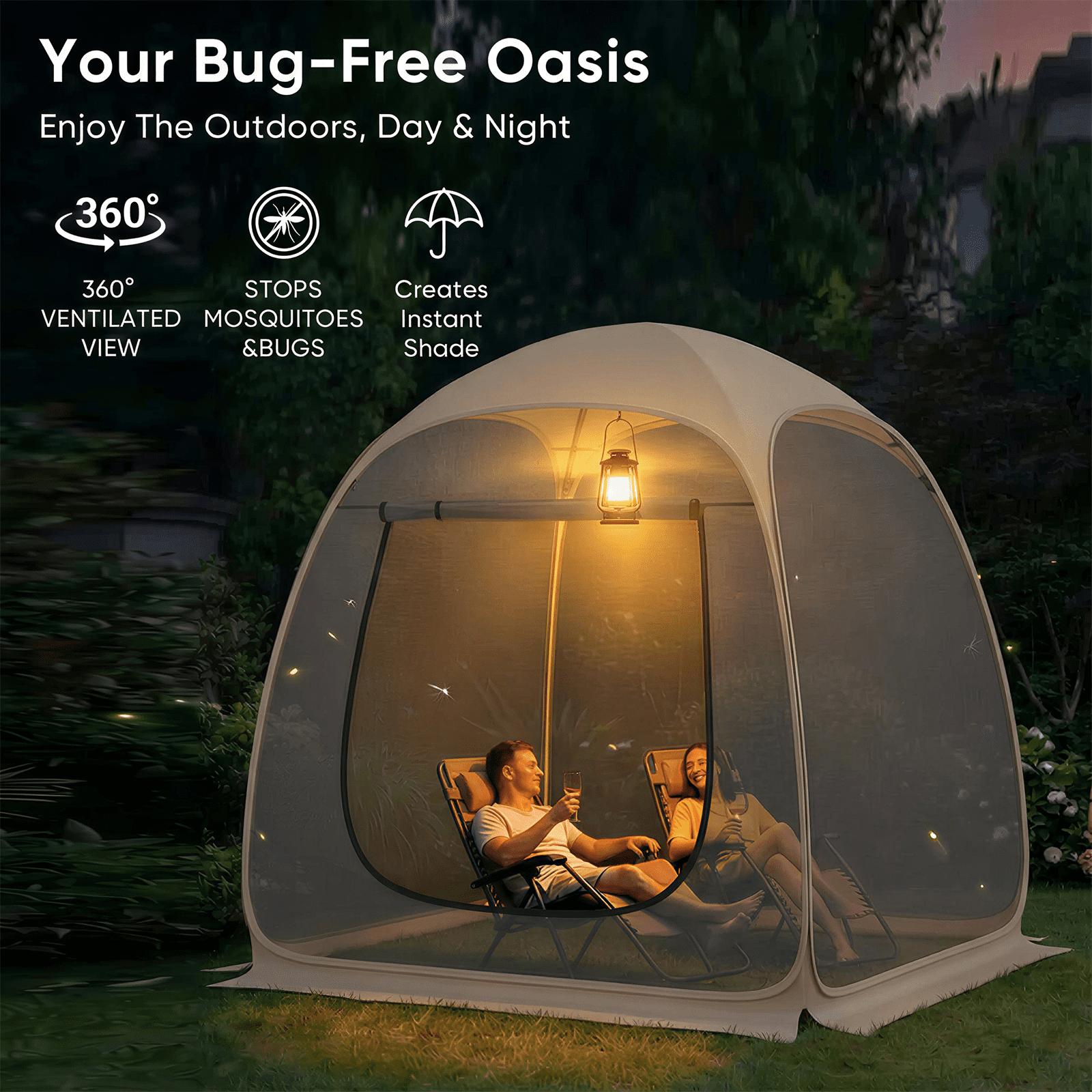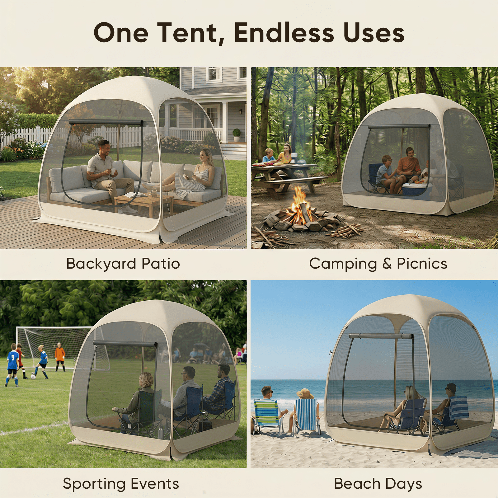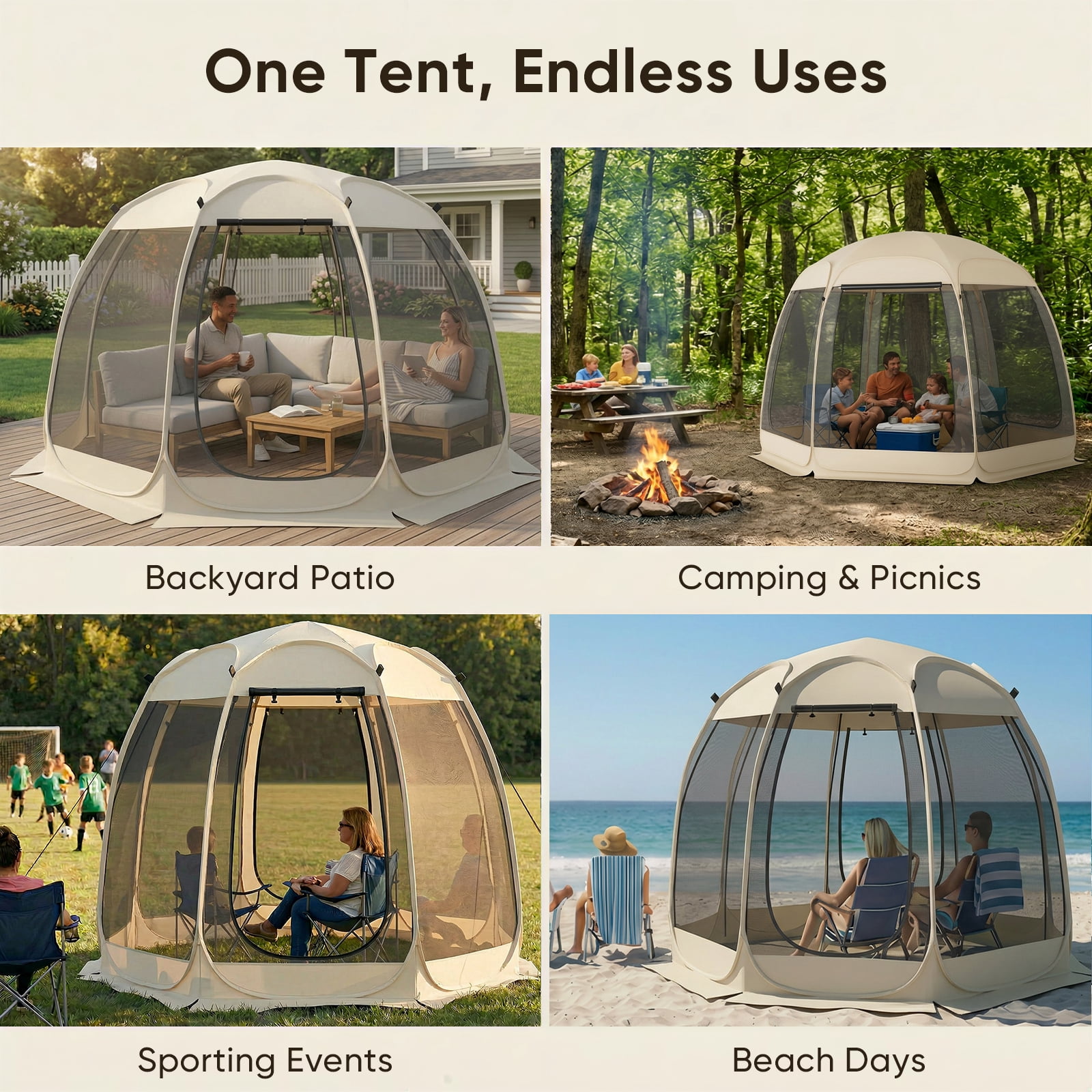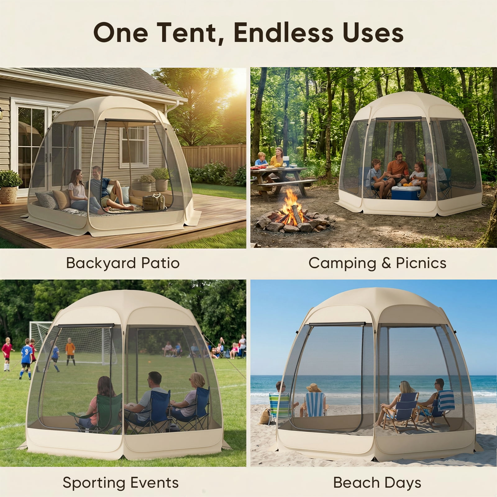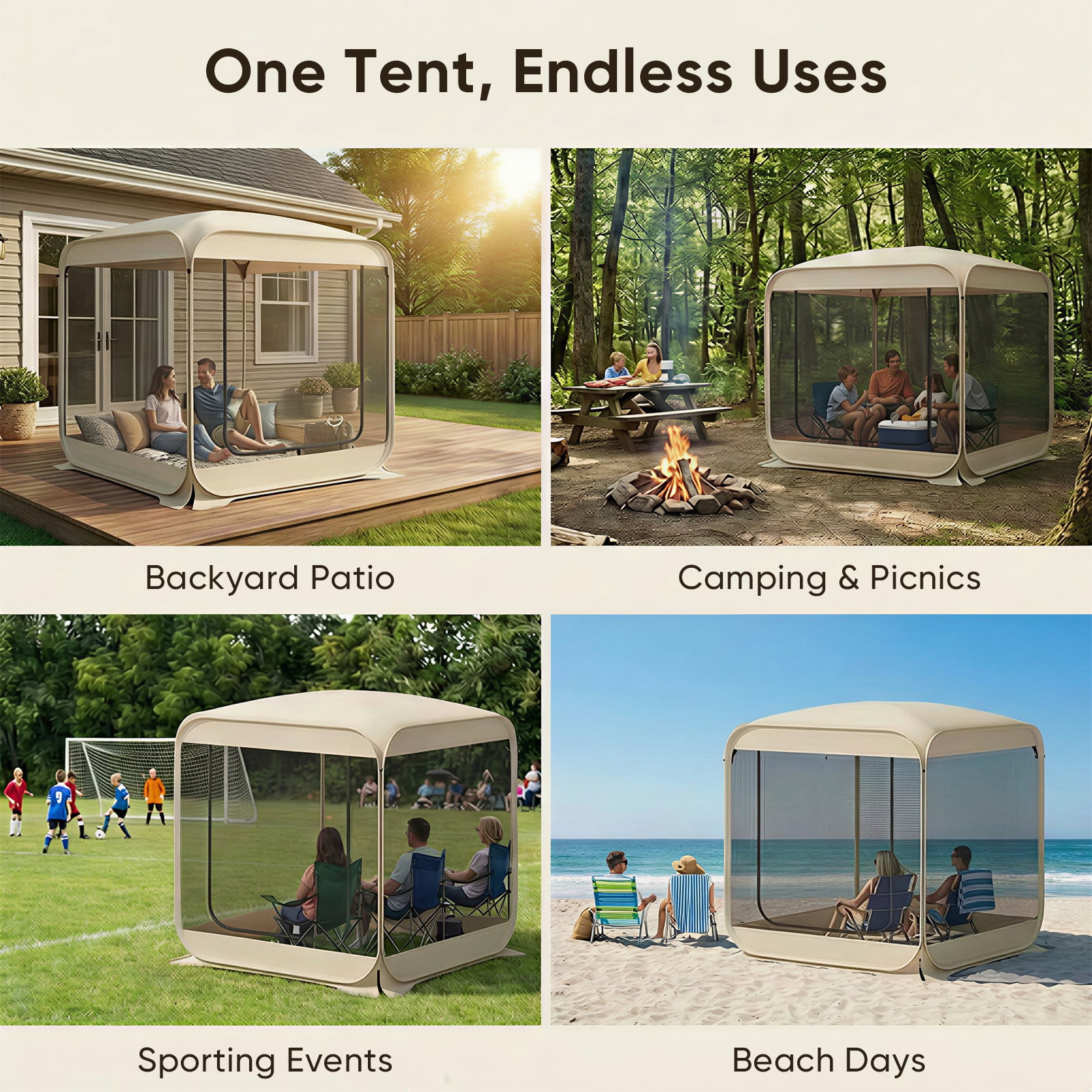 TABU portable pop-up screen teent features a 4-sided B3 fine mesh design for 360° perfect ventilation to protect you from mosquitoes, bugs and anything the outdoors can throw at you. The screen tent body is made of high-quality Oxford fabric with anti-UV silver coating to achieve all-day UPF 50+ UV protection. Perfec for picnics, camping, and the beach.