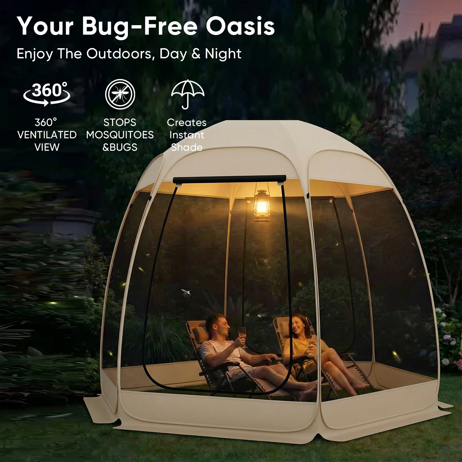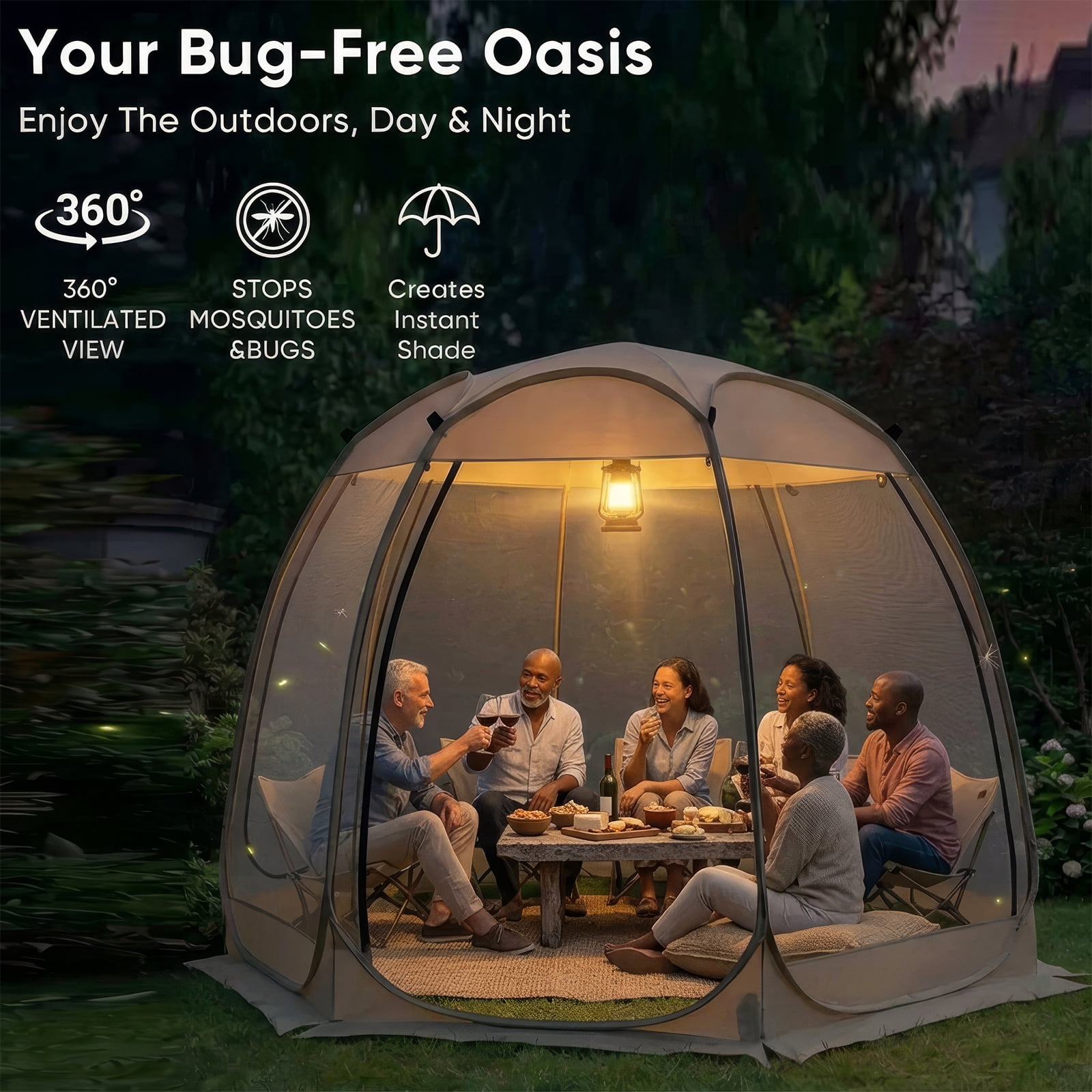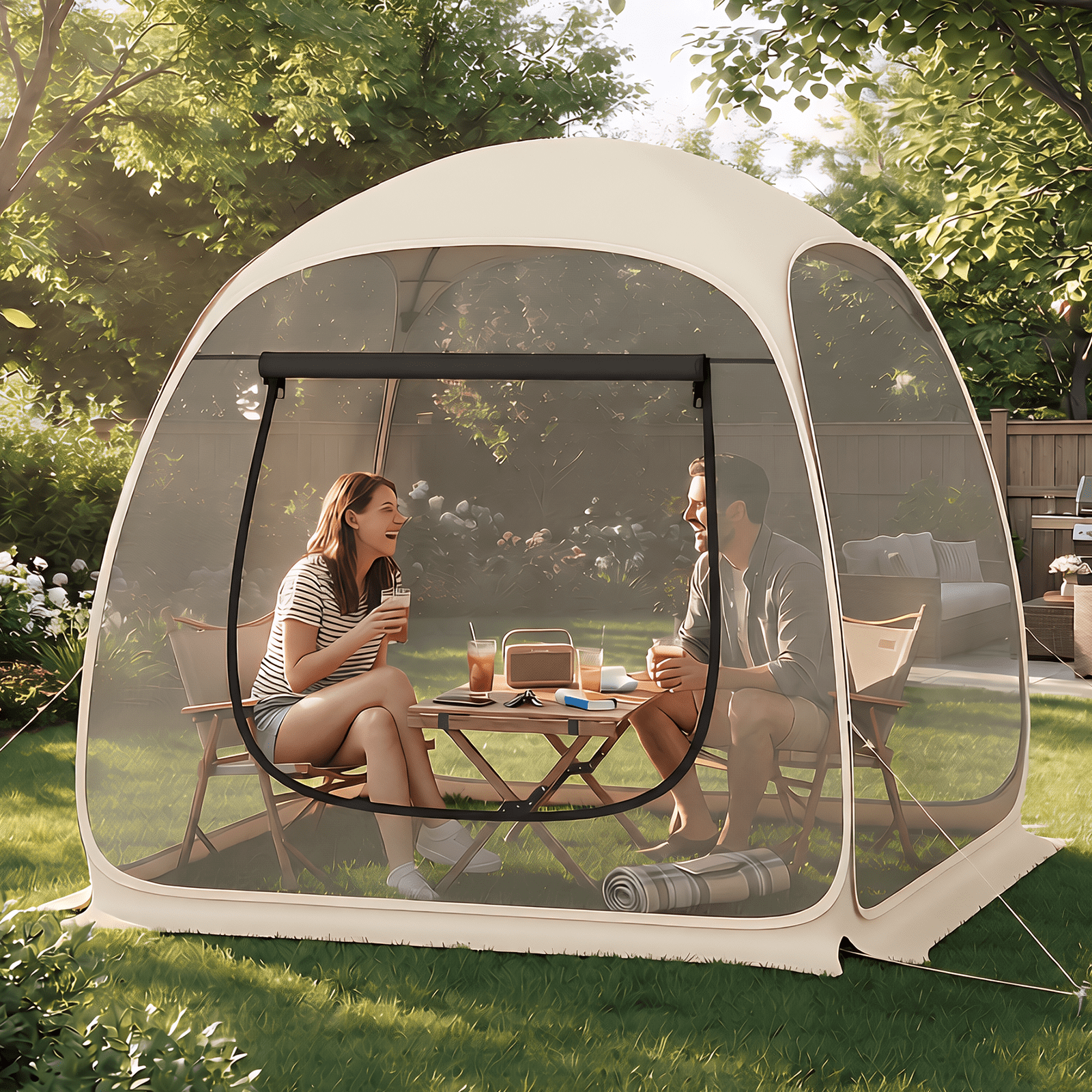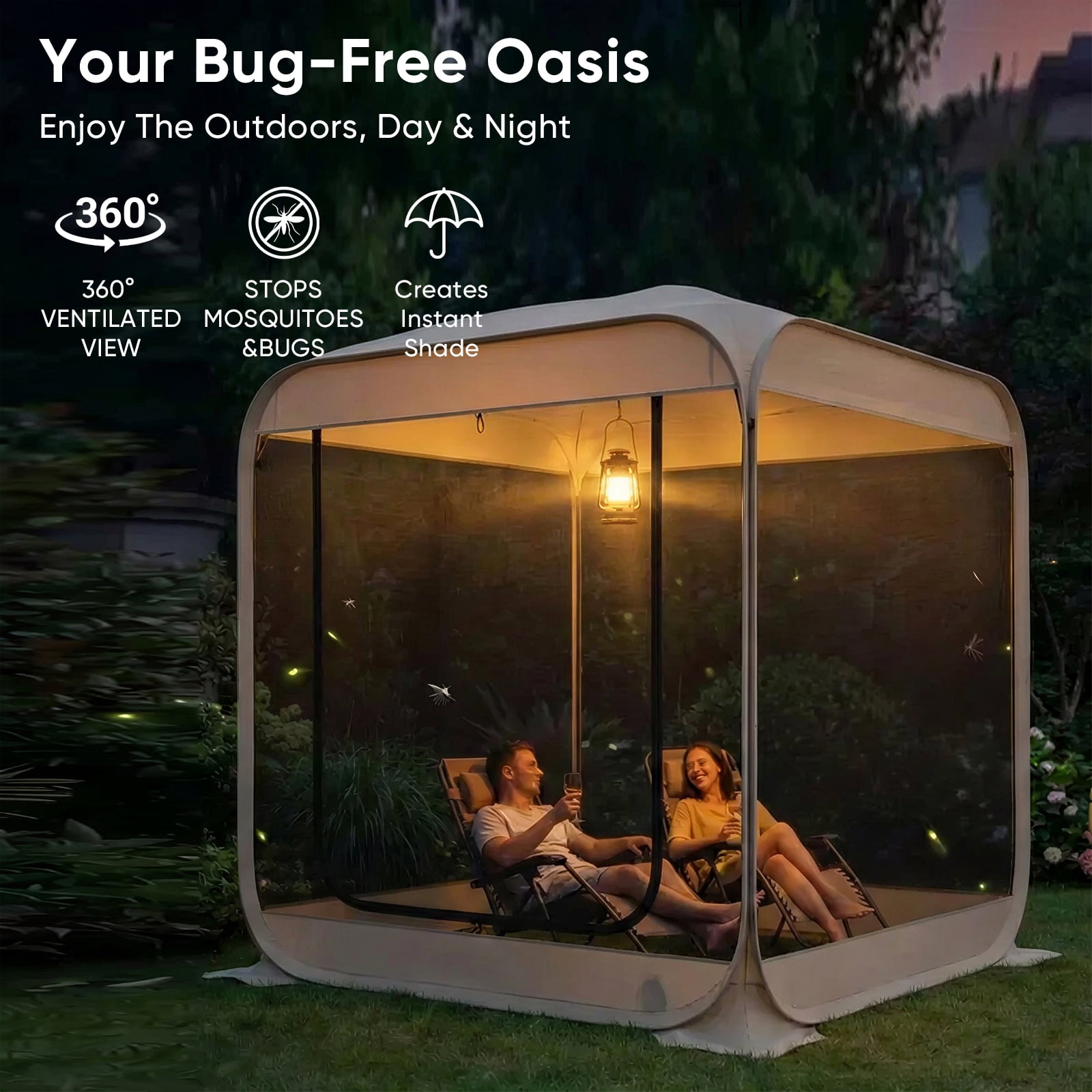 Suitable for 4-5 people, TABU screen house features a convenient pop-up design that allows for easy installation by a single person in under one minute. The tent is designed to be easily folded and has a convenient carrying bag.