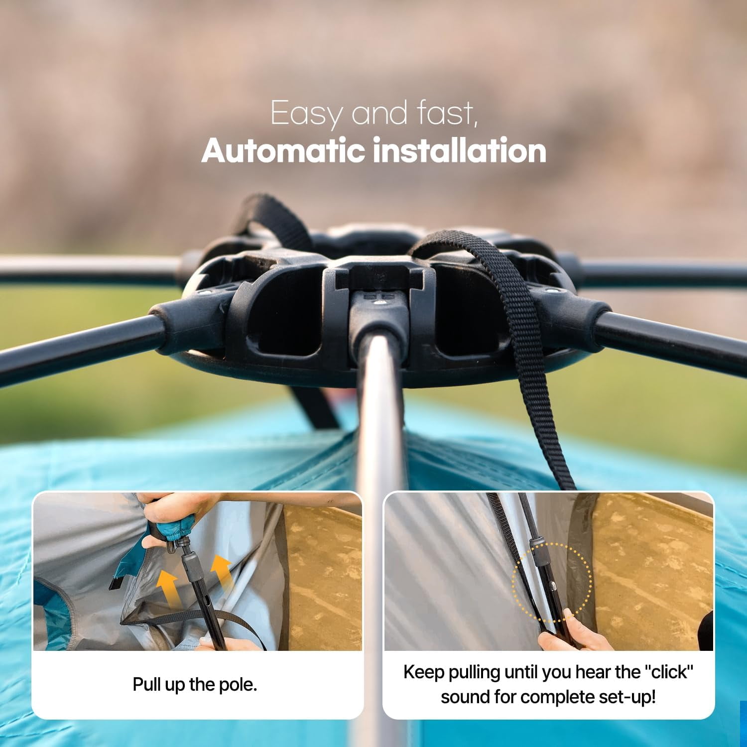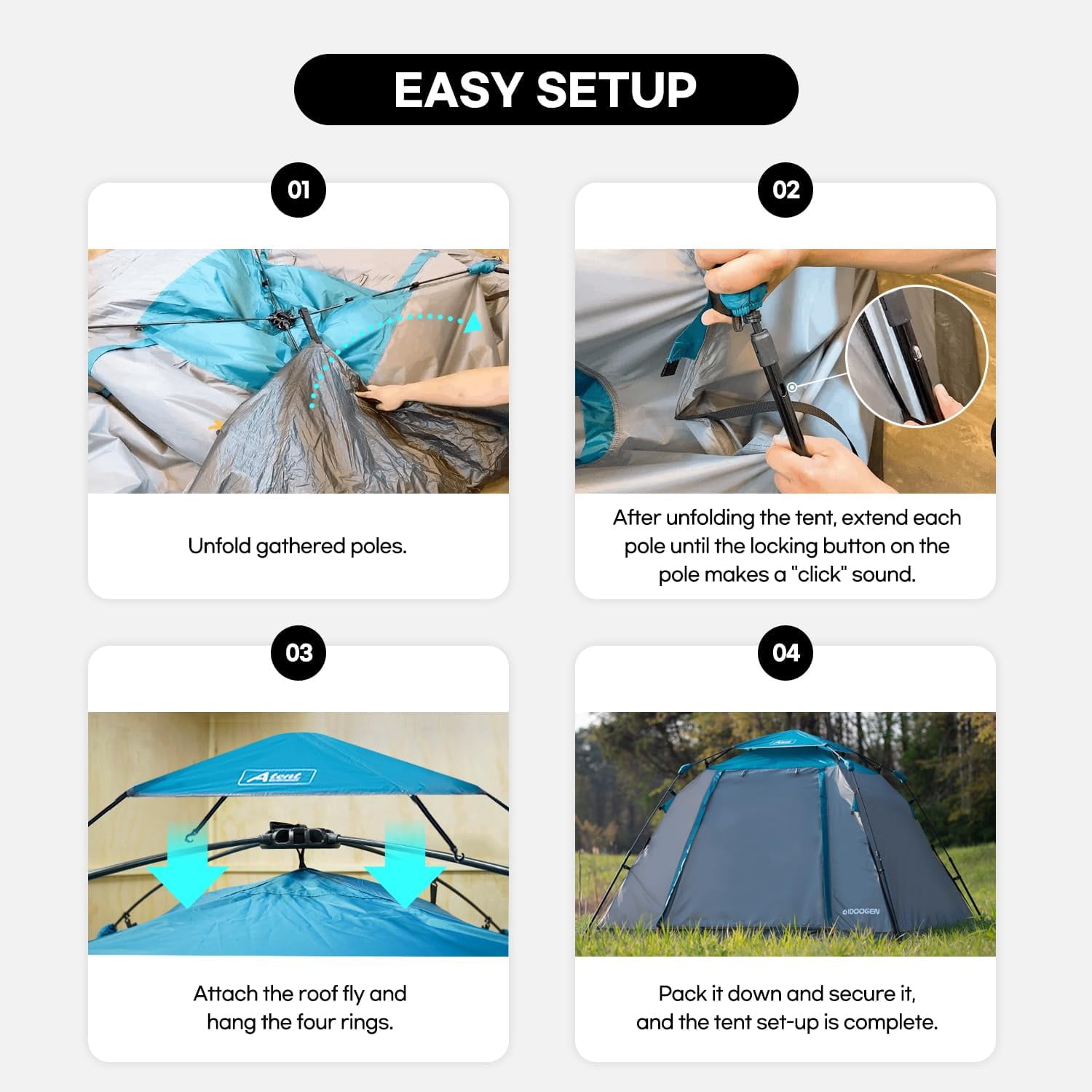 - 【Quick Setup Automatic Tent】Unpack the 2 person tent, find a level surface, lay it flat, and unfold the four arms.Simply lift the tent’s top, and it will automatically install itself.To ensure added stability, lock the top.This tent can stand on its own.Additionally, we provide stakes and windproof ropes for extra security.