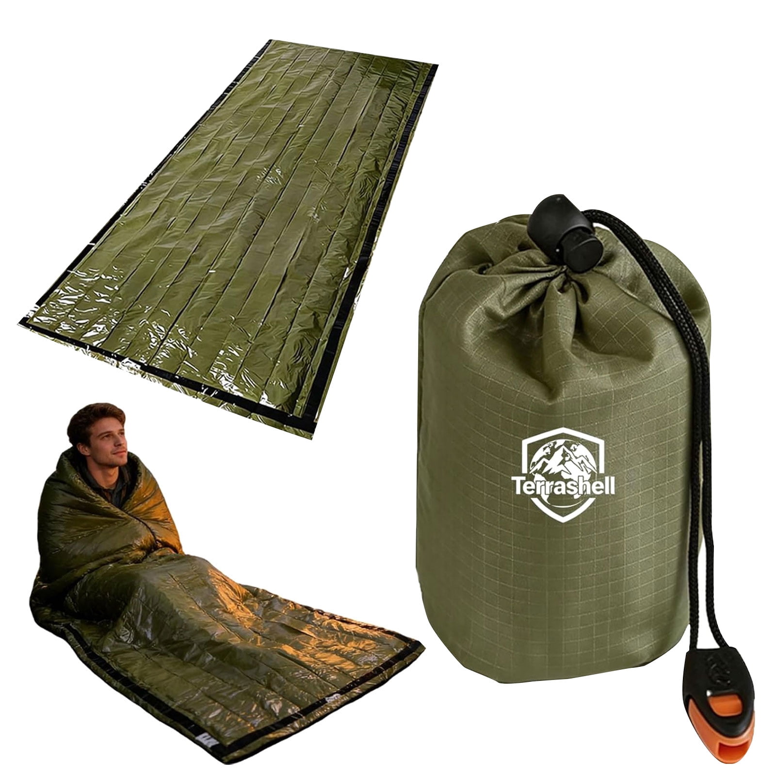 TerraShell Blanket, Sleeping Bag, Emergency Sleeping Bag Survival, Waterproof, Compact Lightweight, Emergency Mat for Survival Kit Car Camping Gear Hiking Go (1PC, Green,0.25 µm)