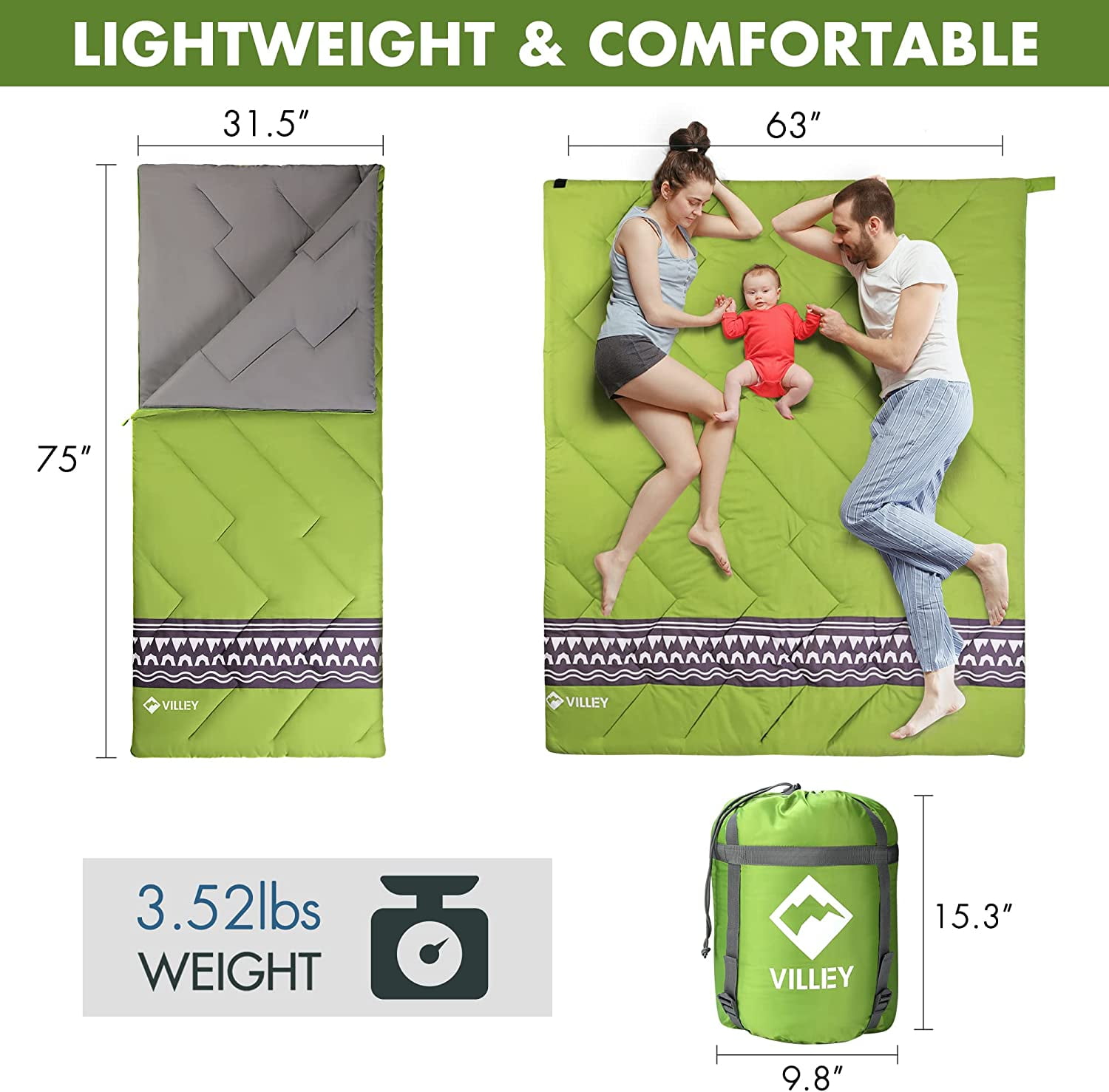 - Spacious Design: Rectangle shape provides ample room for movement, and two sleeping bags can be zipped together to form a large double sleeping bag or blanket.