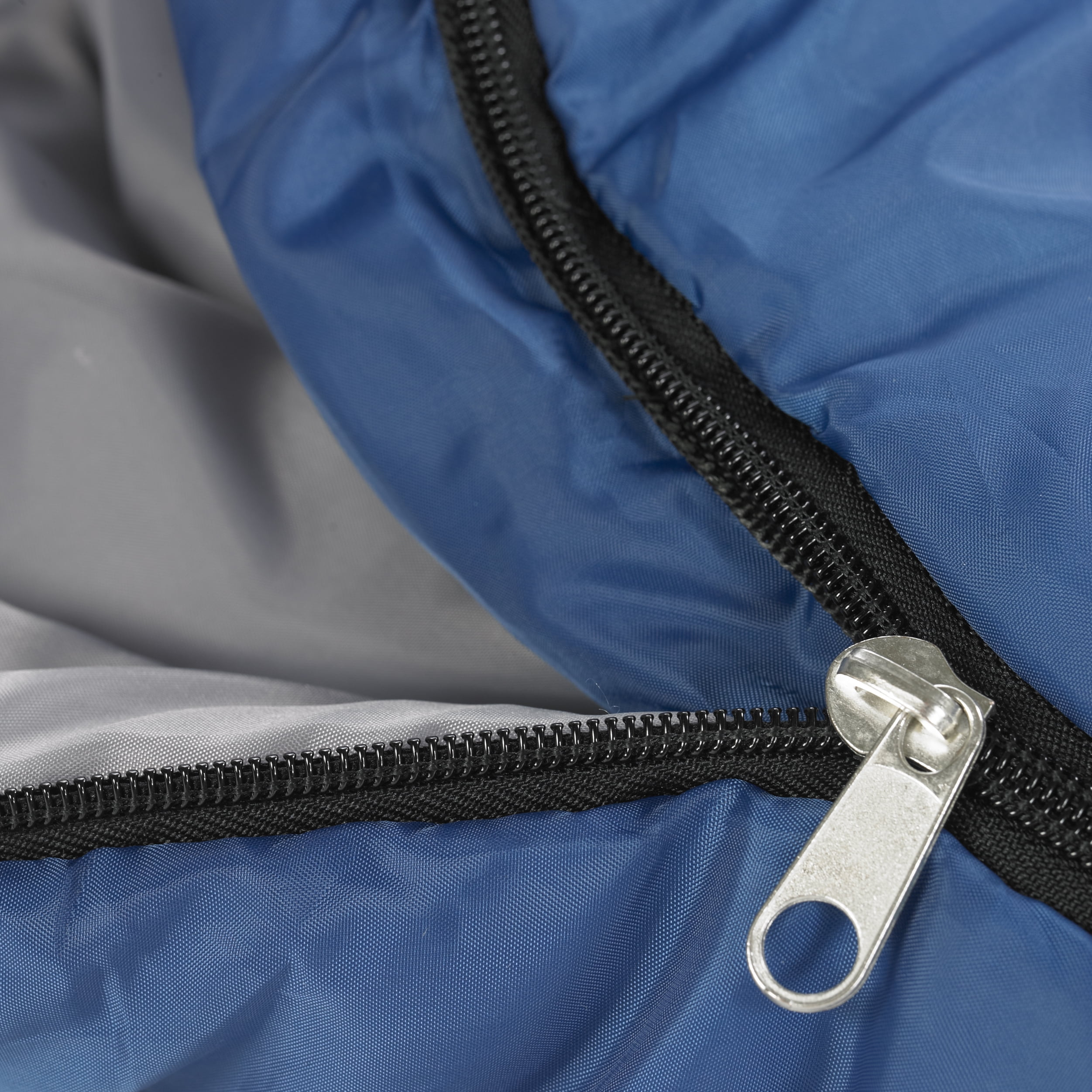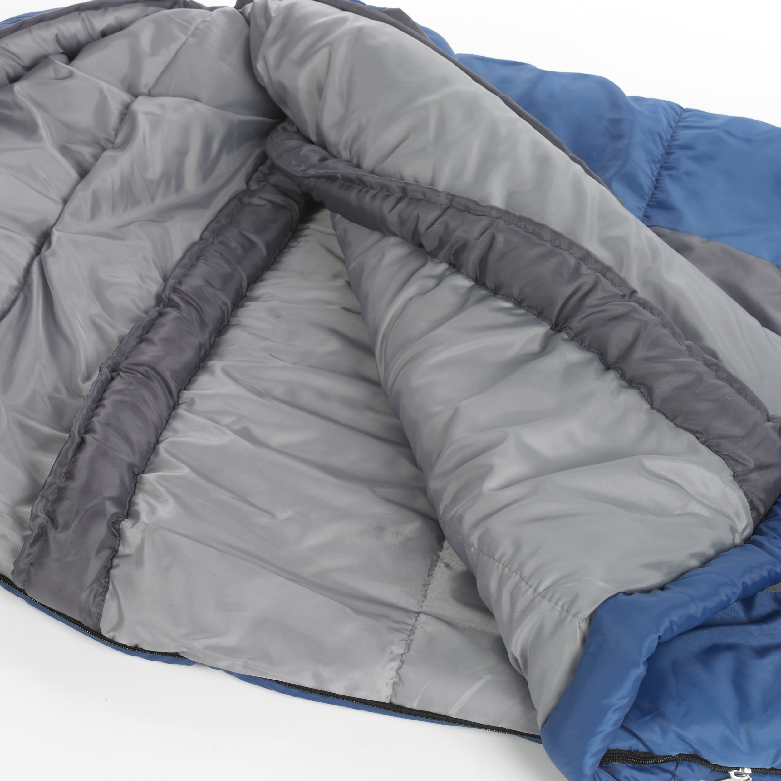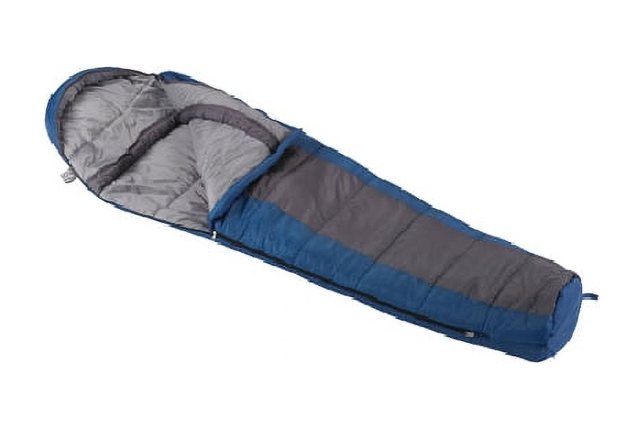 Blue sleeping bag includes full-length 3″ draft tube and 3″ shoulder collar